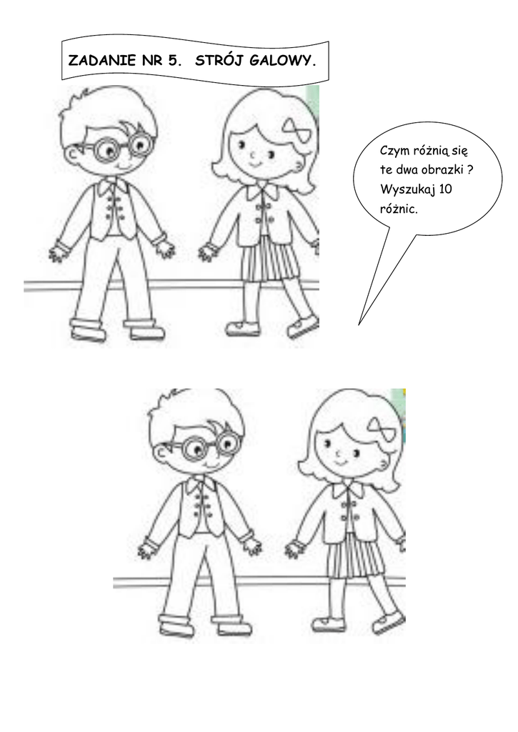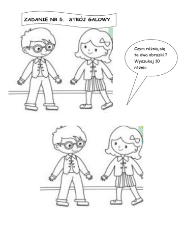 ZADANIE NR 5. STRÓJ GALOWY. Czym różnią się te dwa obrazki ? Wyszukaj 10 różnic. DO SZKOŁY CZY NA PLAŻĘ? JAK SIĘ UBIERAMY DO SZKOŁY? SZKOŁA NIEKTÓRE ZASADY OBOWIĄZUJĄCE W SZKOLE. Do szkoły powinniśmy ubierać się odpowiednio. Co to znaczy? Ubranie powinno być czyste, nie wypada mieć brzucha na wierzchu. W specjalne dni i święta szkolne należy wkładać strój galowy : biało- grantowy lub czarny. Strój na gimnastykę powinien być czysty i wygodny, Buty zmieniamy, żeby odpoczęły nogi a podłogi w szkole pozostały czyste. Ładniej wyglądamy, kiedy jesteśmy schludni, mamy porządnie uczesane i czyste włosy, czyste paznokcie. Małe dziewczynki brzydko wyglądają z pomalowanymi paznokciami. Poza tym lakier i zmywacz niszczą paznokcie, sprawia, że są słabe i łatwo się łamią. Powinniśmy także dbać o nasze przybory szkolne. Zeszyty nie lubią „oślich rogów”. W piórniku nosimy pióro, ołówek, gumkę i klej. Dbamy o porządek w klasie. Nie niszczymy sprzętów szkolnych- ławek, krzeseł. Sprzątamy w klasie po skończonej lekcji. Nie zapominamy odrabiać zadania domowego. W szkole spotykamy naszych nauczycieli, wychowawców, kolegów. Bądźmy kulturalni i koleżeńscy. Pamiętacie magiczne słówka- dziękuję, przepraszam i proszę ? Jeśli spotykamy kogoś starszego mówimy- dzień dobry. Kolegę możemy przywitać używając słowa- część, witaj, ZADANIE nr 6. W PUSTEJ KLASIE. Ta klasa szkolna jest pusta, brakuje w niej uczniów, nauczyciela, niektórych sprzętów. Narysuj: godło nad tablicą drzwi do klasy zegar nad drzwiami panią nauczycielkę stojącą koło tablicy chłopca siedzącego w pierwszej ławce po prawej stronie dziewczynkę w pierwszej ławce po lewej stronie dziewczynkę w drugiej ławce po lewej stronie chłopca w drugiej ławce po prawej stronie dziewczynkę w ostatniej ławce po lewej stronie kwiatek w doniczce na szafce smoka na tablicy Zapytaj swojego nauczyciela, czy dobrze wykonałeś zadanie.