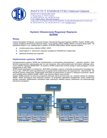 INSTYTUT ENERGETYKI Oddział Gdańsk INSTYTUT BADAWCZZY ul. Mikołaja Reja 27, 80-870 Gdańsk tel. (48 58) 349 82 00, fax: (48 58) 349 76 85 e-mail: [email protected] http://www.ien.gda.pl ZAKŁAD AUTOMATYKI SYSTEMÓW ELEKTROENERGETYCZNYCH tel. (48 58) 349 81 60; fax: (48 58) 349 81 64, e-mail: [email protected] System Obszarowej Regulacji Napięcia SORN Wstęp Instytut Energetyki O/Gdańsk, opracował System Obszarowej Regulacji Napięcia (SORN). System SORN wykorzystuje istniejącą infrastrukturę regulacji napięć i mocy biernej (układy ARNE i ARST) na terenie danej ODM. Na podstawie danych z w.w. układów oraz z systemu DYSTER ODM system SORN realizuje zadania: monitorowanie pracy układów ARNE i ARST, wspomaganie w wykrywaniu zagrożeń wystąpienia niestabilności napięciowej, ułatwienie likwidacji tych zagrożeń. Użytkowanie systemu SORN Oprogramowanie systemu SORN jest zainstalowane na komputerze przemysłowym – serwerze systemu. Jako terminal dyspozytorski wykorzystany jest ten sam komputer, który jednocześnie jest terminalem zdalnego sterowania układów regulacji ARNE/ARST. Do systemu SORN możliwy jest również dostęp w trybie podglądu z innych komputerów w sieci ODM. SORN został wyposażony w funkcję tzw. SUFLERA powstałą w oparciu o technikę wnioskowania rozmytego tzw. Fuzzy Logic. SUFLER został zaprojektowany do generowania podpowiedzi dla dyspozytorów odpowiednich dla aktualnej sytuacji napięciowej. Podpowiedzi SUFLERA są generowane w oparciu o bieżących pomiarów, aktualnych punktów pracy układów ARNE i ARST oraz poziomu rezerw mocy biernej. System SORN pozwala na zbiorcze przesyłanie sterowań takich jak tryb pracy czy wartości zadane do układów ARNE i ARST pracujących pod nadzorem systemu. W przypadku zagrożenia wystąpieniem awarii systemowej istnieje możliwość zablokowania wszystkich bądź wybranych układów jednym poleceniem lub jednoczesnego sterowania zaczepami. System Obszarowej Regulacji Napięcia SORN Budowa i funkcje System SORN wykorzystuje dane analogowe i dwustanowe pobierane z systemu DYSTER (protokół ICCP/TASE.2) lub z układów ARNE/ARST (redundantne kanały bezpośrednie). Zintegrowana z systemem SORN strumieniowa baza danych1 zapewnia możliwość przetwarzania i eksport danych historycznych. Dla zdefiniowanych zestawów sygnałów, system SORN generuje raporty danych historycznych w postaci plików EXCEL. System ma otwartą architekturę i modułową budowę: Moduły komunikacyjne – przetwarzają dane dla jednego obiektu, np. stacji lub układu regulacji. Moduł SYGNALIZACJA - generuje zbiorczą sygnalizację centralną. Moduł POMIARY - przetwarza pomiary napięć, mocy i numerów zaczepów transformatorów odczytywane z systemu DYSTER. Moduł PREDYKCJA - wyznacza przewidywane wartości napięć. Moduł TRENDY - wyznacza trendy wielkości charakteryzujących stan układów regulacji. Moduł WSKAŹNIKI - wylicza wskaźniki bezpieczeństwa napięciowego. Moduł SUFLER - generuje podpowiedzi dot. zmiany stanu lub nastaw układów regulacji. Parametry modyfikujące działanie modułów systemu SORN są definiowane za pomocą plików tekstowych. Dotyczy to w szczególności parametrów generowania sygnalizacji alarmowej i ostrzegawczej. Parametry te mogą być zmieniane przez użytkownika. W oparciu o dane generowane i udostępniane przez wymienione moduły programowe systemu SORN działają terminale oraz inne aplikacje dostosowane do wymagań i potrzeb użytkownika systemu. MENU SUFLER 1 Streaming Data Base - rejestruje na bieżąco zmiany wielkości analogowych i dwustanowych oraz alarmy i ostrzeżenia systemu SORN. KARTA INFORMACYJNA Wydanie 10.2011