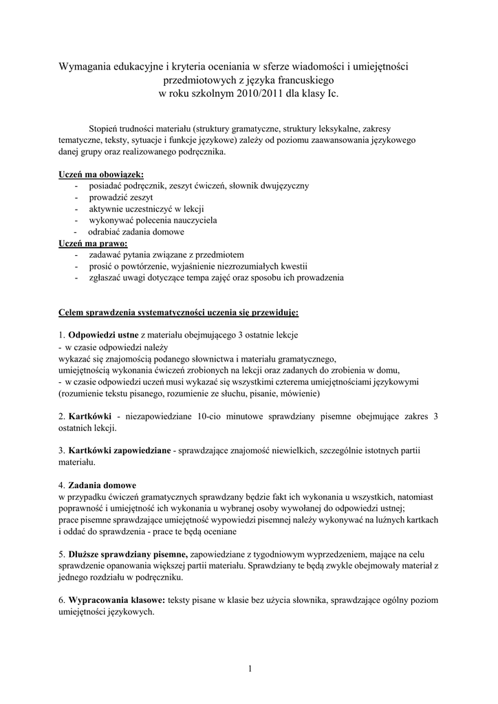 Wymagania edukacyjne i kryteria oceniania w sferze wiadomości i umiejętności przedmiotowych z języka francuskiego w roku szkolnym 2010/2011 dla klasy Ic. Stopień trudności materiału (struktury gramatyczne, struktury leksykalne, zakresy tematyczne, teksty, sytuacje i funkcje językowe) zależy od poziomu zaawansowania językowego danej grupy oraz realizowanego podręcznika. Uczeń ma obowiązek: - posiadać podręcznik, zeszyt ćwiczeń, słownik dwujęzyczny - prowadzić zeszyt - aktywnie uczestniczyć w lekcji - wykonywać polecenia nauczyciela - odrabiać zadania domowe Uczeń ma prawo: - zadawać pytania związane z przedmiotem - prosić o powtórzenie, wyjaśnienie niezrozumiałych kwestii - zgłaszać uwagi dotyczące tempa zajęć oraz sposobu ich prowadzenia Celem sprawdzenia systematyczności uczenia się przewiduję: 1. Odpowiedzi ustne z materiału obejmującego 3 ostatnie lekcje - w czasie odpowiedzi należy wykazać się znajomością podanego słownictwa i materiału gramatycznego, umiejętnością wykonania ćwiczeń zrobionych na lekcji oraz zadanych do zrobienia w domu, - w czasie odpowiedzi uczeń musi wykazać się wszystkimi czterema umiejętnościami językowymi (rozumienie tekstu pisanego, rozumienie ze słuchu, pisanie, mówienie) 2. Kartkówki - niezapowiedziane 10-cio minutowe sprawdziany pisemne obejmujące zakres 3 ostatnich lekcji. 3. Kartkówki zapowiedziane - sprawdzające znajomość niewielkich, szczególnie istotnych partii materiału. 4. Zadania domowe w przypadku ćwiczeń gramatycznych sprawdzany będzie fakt ich wykonania u wszystkich, natomiast poprawność i umiejętność ich wykonania u wybranej osoby wywołanej do odpowiedzi ustnej; prace pisemne sprawdzające umiejętność wypowiedzi pisemnej należy wykonywać na luźnych kartkach i oddać do sprawdzenia - prace te będą oceniane 5. Dłuższe sprawdziany pisemne, zapowiedziane z tygodniowym wyprzedzeniem, mające na celu sprawdzenie opanowania większej partii materiału. Sprawdziany te będą zwykle obejmowały materiał z jednego rozdziału w podręczniku. 6. Wypracowania klasowe: teksty pisane w klasie bez użycia słownika, sprawdzające ogólny poziom umiejętności językowych. 1 7. Testy sprawdzające rozumienie ze słuchu oraz rozumienie tekstu pisanego. Ocena semestralna i końcowo roczna nie jest wystawiana na podstawie wyliczenia średniej arytmetycznej ze wszystkich wystawionych ocen. Przy jej wystawianiu bierze się pod uwagę różną wagę poszczególnych ocen. Kryteria oceny: Ocenę dopuszczającą otrzymuje uczeń, który: - posiada najprostsze, najbardziej użyteczne i niezbędne do dalszej nauki wiadomości i umiejętności i potrafi odtworzyć je i zastosować w kontekstach, sytuacjach identycznych do tych, które poznał na lekcji przy niewielkiej pomocy nauczyciela - mimo licznych błędów ortograficznych, fonetycznych, strukturalnych, jego wypowiedź ustna i pisemna jest zrozumiała - w zakresie rozumienia ze słuchu i tekstu pisanego potrafi odpowiedzieć na formułowane w języku polskim pytania do poznanych wcześniej tekstów Ocenę dostateczną otrzymuje uczeń, który: - posiada podstawowe wiadomości i umiejętności, odtwarza je i stosuje w kontekstach, sytuacjach identycznych do tych, które poznał na lekcji bez pomocy nauczyciela - mimo błędów ortograficznych, fonetycznych, strukturalnych jego wypowiedź jest zrozumiała - w zakresie rozumienia ze słuchu i tekstu pisanego, potrafi odpowiedzieć na formułowane w j ęzyku francuskim pytania do poznanych wcześniej tekstów Ocenę dobrą otrzymuje uczeń, który: - posiada wiadomości i umiejętności odtworzenia ich i zastosowania w kontekstach i sytuacjach zbliżonych do tych, które poznał na lekcji - popełnia sporadyczne błędy niezakłócające komunikacji - w zakresie rozumienia ze słuchu i tekstu pisanego, potrafi odpowiedzieć na formułowane w j ęzyku francuskim pytania do tekstów podobnych do tych, które poznał na lekcji Ocenę bardzo dobrą otrzymuje uczeń, który: - posiada wiadomości i umiejętności trudne do opanowania, złożone i nietypowe, alternatywne do podstawowych - samodzielnie i twórczo posługuje się nimi w kontekstach, sytuacjach nowych, różnych od tych, które poznał na lekcji - jego wypowiedzi ustne i pisemne są prawie bezbłędne w zakresie przerobionego materiału - w zakresie rozumienia ze słuchu i tekstu pisanego, potrafi odpowiedzieć na formułowane w języku francuskim pytania do tekstów niepoznanych na lekcji Ocenę celującą otrzymuje uczeń, który: -posiada wiedzę i umiejętności wykraczające poza program, szczególnie złożone i trudne na danym etapie nauki, poświadczone uzyskanymi certyfikatami językowymi, -uczestniczył w etapie międzyszkolnym Olimpiady Języka Francuskiego 2 Zadania zamknięte oceniane będą wg następującej skali: 50-59 % - dopuszczający 60-74 % - dostateczny 75-84 % - dobry 85-99 % - bardzo dobry 100 % -celujący Inne kryteria 1. W przypadku nieobecności ucznia na zapowiedzianym sprawdzianie pisemnym, uczeń jest zobowiązany do napisania go na następnej lekcji; W przypadku usprawiedliwionej nieobecności spowodowanej dłuższą, (co najmniej 1 tydzień) chorobą, lub przygotowaniami do olimpiady czy innego konkursu przedmiotowego, po powrocie do szkoły uczeń ustala z nauczycielem termin napisania zaległej pracy, musi się to jednak odbyć w ciągu 2 tygodni. Po upływie tego terminu, uczeń otrzymuje ocenę niedostateczną. 2. W przypadku nieoddania pracy pisemnej w wyznaczonym terminie, za każdy tydzień opóźnienia będzie obniżana ocena o 1 stopień. 3. Uczeń ma prawo zgłosić 2 nieprzygotowania w ciągu semestru. Musi to jednak mieć miejsce przed rozpoczęciem przez nauczyciela działań związanych z kontrolą przygotowania do lekcji. 4. Uczeń ma prawo do poprawienia raz oceny z zapowiedzianego sprawdzianu pisemnego, w terminie uzgodnionym z nauczycielem. 5. Ocenę z odpowiedzi ustnej lub niez