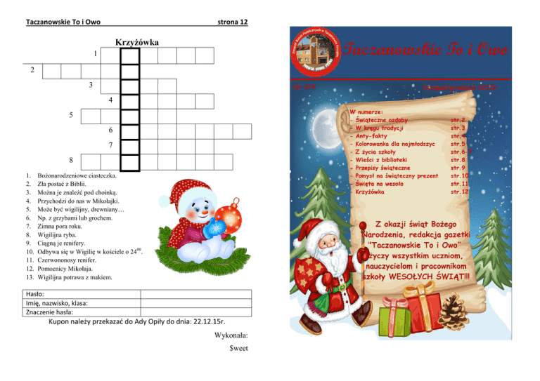 Taczanowskie To i Owo strona 12 Krzyżówka 1 2 3 4 5 6 7 8 1. 2. 3. 4. 5. 6. 7. 8. 9. 10. 11. 12. 13. Bożonarodzeniowe ciasteczka. Zła postać z Biblii. Można je znaleźć pod choinką. Przychodzi do nas w Mikołajki. Może być wigilijny, drewniany… Np. z grzybami lub grochem. Zimna pora roku. Wigilijna ryba. Ciągną je renifery. Odbywa się w Wigilię w kościele o 2400. Czerwononosy renifer. Pomocnicy Mikołaja. Wigilijna potrawa z makiem. Hasło: Imię, nazwisko, klasa: Znaczenie hasła: Kupon należy przekazać do Ady Opiły do dnia: 22.12.15r. Wykonała: $weet Taczanowskie To i Owo strona 2 Taczanowskie To i Owo strona 11 Święta na wesoło Ozdoby świąteczne Przychodzi Jasiu do mamy i mówi: - Mamo choinka się pali. - Synku, nie mówi się „pali” tylko „świeci”. Po chwili Jasiu znów przychodzi: - Mamo, a teraz firanka się świeci. Solne serduszka: Składniki: • Sól • Mąka • Woda Sposób wykonania: Całość należy ugnieść, aż do uzyskania jednolitej masy. Następnie uformuj serduszko ( możesz wykorzystać do tego foremki do pierników).Po zrobieniu serduszek wstaw je do piekarnika na 15 minut i 140 stopni. Po upieczeniu możesz pomalować dowolnymi kolorami. Powieś je na choince. Świąteczna poduszka Materiały: • Biały jasiek • Kawałki kolorowych materiałów • Igła, nici Sposób wykonania Przygotuj biały jasiek, wymyśl obrazek, który na nim umieścisz. Z kolorowych materiałów wytnij elementy zgodne z projektem. Przyłóż do poduszki i przypnij szpilkami. Przygotuj nici w takich samych kolorach i przyszyj wycięte elementy. Całość przeprasuj gorącym żelazkiem. Opracowała: Ok111 Jasio mówi do mamy: - Mamusiu, chciałbym ci coś ofiarować pod choinkę. - Nie trzeba, syneczku. Jeśli chcesz mi sprawić przyjemność, to popraw swoją jedynkę z matematyki. - Za późno, mamusiu. Kupiłem ci już perfumy. Po świętach Bożego Narodzenia do psychiatry przychodzi mały Jasio i mówi: - Panie doktorze, z moim tatą jest coś nie w porządku. Przed kilkoma dniami przebrał się za starego dziadka i twierdził, że nazywa się św. Mikołaj! Przedszkolak pyta kolegę: - Co dostałeś na gwiazdkę? - Trąbkę. - Mówiłeś, że dostaniesz lepsze prezenty! - To super prezent! Dzięki niej zarabiam codziennie złotówkę! - W jaki sposób? - Tata mi daje, żebym przestał trąbić! Jasio pisze list do świętego Mikołaja: - „Chciałbym narty, łyżwy, sanki i grypę na zakończenie ferii świątecznych”. Opracowała: ana Taczanowskie To i Owo Prezent pod choinkę - ramka na zdjęcia strona 10 Taczanowskie To i Owo strona 3 W kręgu polskich tradycji i zwyczajów świątecznych Przygotuj: -biały blok techniczny, -kolorową włóczkę, -wstążki i inne ozdoby. 1.Ze sztywnego kartonu wytnij prostokąt o wymiarach 21cm/ 16cm. Narysuj w nim drugi prostokąt o ramce 3cm od brzegu. Wytnij dwa takie elementy, a następnie je sklej. Pierwsza Gwiazdka Jest symbolem Gwiazdy Betlejemskiej, której pojawienie się towarzyszyło narodzinom Jezusa. Dzięki niej pasterze, Trzej Królowie mogli dotrzeć do miejsca narodzin Zbawiciela. Dopiero, gdy ona zabłyśnie możemy, według tradycji, siąść do stołu i podzielić się opłatkiem. Opłatek Jego nazwa wzięła się z łacińskiego słowa oblatum i znaczy dar ofiarny. Jest to cienki kawałek wypieczonej mąki pszennej i wody. Na nim widnieją obrazy związane z Bożym Narodzeniem. Dzielenie się chlebem ma korzenie w pogańskich tradycjach. Z czasem przeszło ono na stałe do zwyczajów chrześcijańskich, a dziś dzielimy się opłatkiem przed wieczerzą wigilijną, składając sobie życzenia. Sianko wigilijne Kładziemy je pod białym obrusem na stole, przy którym będziemy spożywać wigilijną kolację. Symbolizuje oczywiście miejsce, w jakim przyszedł na świat Jezus – szopkę i siano, na którym leżał po urodzeniu. Choinka Zwyczaj ubierania choinek narodził się wśród ludów germańskich przeszło 300 lat temu. W dniach przesilania zimy i nocy zawieszano u sufitu gałązki jemioły, jodły, świerka, sosny jako symbol zwycięstwa życia nad śmiercią, dnia nad nocą, światła nad ciemnością Kolędy Zaczynamy je śpiewać przy wigilijnym stole. Są to pieśni, które opowiadają o Narodzeniu Pana. Ich nazwa pochodzi z łaciny – calendae, co oznaczało pierwszy dzień miesiąca. Pierwsze „kolędy” były śpiewane przez Rzymian w ramach uroczystego uczczenia pierwszego stycznia. Prezenty Najprzyjemniejszy zwyczaj bożonarodzeniowy. Dziś to one głównie kojarzą się Bożym Narodzeniem. Pierwotnie ten zwyczaj był związany wyłącznie z osobą św. Mikołaja, dziś przyjmujemy, iż są to podarki od małego Jezusa. Pasterka Tradycyjna msza odprawiana w nocy z 24 na 25 grudnia. Symbolizuje czuwanie pasterzy przy żłobie Jezusa. Uczestniczymy w niej razem z najbliższymi. Jest najważniejszym momentem w czasie Świąt Bożego Narodzenia. 2.Obwijanie szkieletu ramki zaczynamy od rogu i przyklejamy jego końcówkę taśmą klejącą. Można różnie wykończyć rogi ramki. 3. Wytnij prostokąt o wymiarach 12cm/17cm i podklej go do spodu ramki 4.Dodaj ozdoby i… ramka gotowa!!! Opracowała: ana Taczanowskie To i Owo strona 4 Szkolne anty-fakty- czyli fakty z przymrużeniem oka Gdzie jest mój worek? Nasz Święty Mikołaj z Polski poszukuje w całej Europie swojego worka z prezentami, który niefortunnie zamienił ze swoim francuskim kolegą. Jeżeli worek się nie odnajdzie, to w tym roku wszystkie polskie dzieci znajdą pod choinką chrupkie bagietki lub crissanty (jedynym pocieszeniem może był fakt, że każdy z innym nadzieniem). Taczanowskie To i Owo strona 9 Boże Narodzenie od kuchni – świąteczne przepisy. Bezowe bałwanki: Składniki: • dwa białka, • pół szklanki cukru pudru, mikser, • papier do pieczenia. Do ozdabiania: • kolorowy lukier w tubkach, • skórka z pomarańczy. Wykonanie: 1. Połącz białko z cukrem-pudrem i ubijaj je aż do