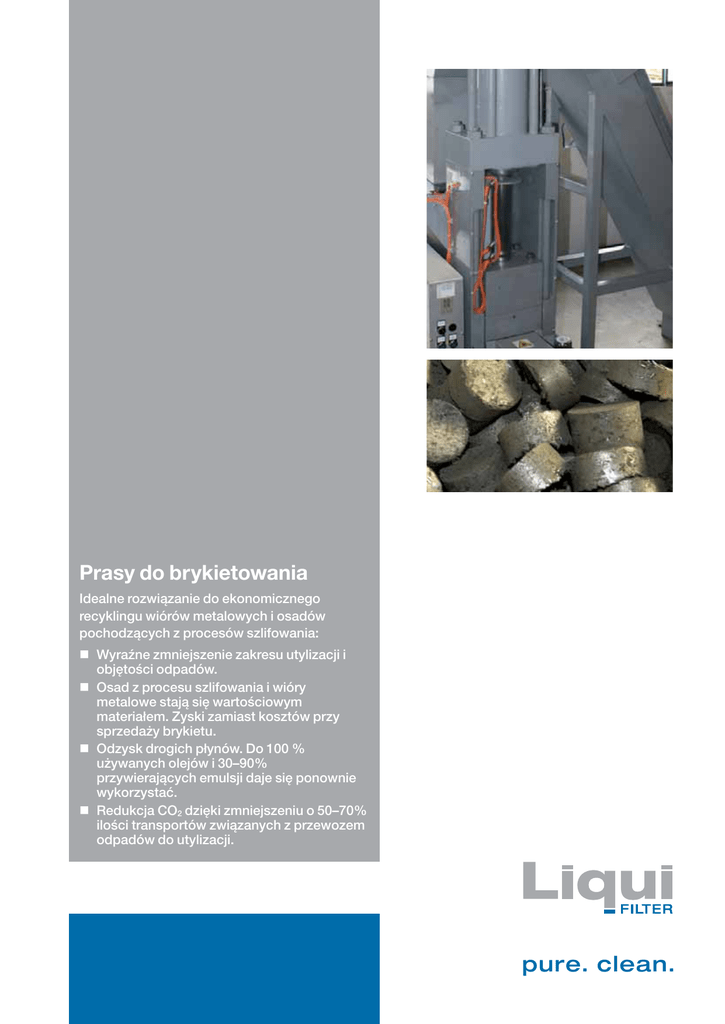 Prasy do brykietowania Idealne rozwiązanie do ekonomicznego recyklingu wiórów metalowych i osadów pochodzących z procesów szlifowania: Wyraźne zmniejszenie zakresu utylizacji i objętości odpadów. Osad z procesu szlifowania i wióry metalowe stają się wartościowym materiałem. Zyski zamiast kosztów przy sprzedaży brykietu. Odzysk drogich płynów. Do 100 % używanych olejów i 30–90% przywierających emulsji daje się ponownie wykorzystać. Redukcja CO2 dzięki zmniejszeniu o 50–70% ilości transportów związanych z przewozem odpadów do utylizacji. pure. clean. Dane techniczne Typ maszyny Brykiet Ciśnienie ściskania Wersja stal 60 kg/h 4,0 ≤ 25 kg/h 5,5 aluminium 18 kg/h 5,5 stal 60 kg/h 5,5 90 kg/h 5,5 ø 40 mm 1592 kg/cm² PM1 20TB ø 40 mm 1592 kg/cm² PM1 25T ø 40 mm 1990 kg/cm² PM2 60T ø 55 mm 2525 kg/cm² stal PM2 60TB ø 55 mm 2525 kg/cm² osad PM2 80T ø 55 mm 3367 kg/cm² stal PM2 60T ø 70 mm 1559 kg/cm² PM2 60TB ø 70 mm 1559 kg/cm² ø 70 mm 2079 kg/cm² PM2 60TH ø 70 mm 1559 kg/cm² PM2 80TH ø 70 mm 2079 kg/cm² Moc kW 18 kg/h PM1 20T PM2 80T Wydajność aluminium osad aluminium stal osad aluminium stal aluminium stal aluminium 4,0 ≤ 40 kg/h 7,5 90 kg/h 9,0 42 kg/h 5,5 150 kg/h 5,5 ≤ 60 kg/h 7,5 42 kg/h 9,0 150 kg/h 9,0 84 kg/h 7,5 300 kg/h 7,5 84 kg/h 9,0 300 kg/h 9,0 aluminium 160 kg/h 22 stal 560 kg/h 22 ≤ 100 kg/h 30 560 kg/h 30 280 kg/h 22 stal PM3 150T ø 90 mm 2359 kg/cm² PM3 150TB ø 90 mm 2359 kg/cm² osad PM3 200T ø 90 mm 3144 kg/cm² stal PM3 150T ø 120 mm 1326 kg/cm² PM3 150TB ø 120 mm 1326 kg/cm² PM3 200T ø 120 mm 1768 kg/cm² aluminium stal osad aluminium stal 1000 kg/h 22 ≤ 180 kg/h 30 280 kg/h 30 1000 kg/h 30 Prasa do brykietowania model PM1 Zastosowanie i zalety Prasy do brykietowania to optymalne rozwiązanie do przyjaznego dla środowiska dalszego przetwarzania wiórów metalowych i osadów z procesów szlifowania. Wcześniej były one drogo utylizowane, teraz brykiety o wysokim stopniu zagęszczenia można wykorzystać jako wartościowe surowce wtórne bez ponoszenia kosztów, a nawet z zyskiem. Zagęszczenie znacznie redukuje objętość magazynowania i transportu. Dodatkowe oszczędności i korzyści ekologiczne zapewnia efektywne odzyskiwanie olejów i emulsji. Prasa do brykietowania model PM3 Stan 02/2012. Zmiany techniczne zastrzeżone Liqui Filter GmbH Richard-Stocker-Strasse 19 D-78234 Engen Telefon +49 7733 9402-0 Fax +49 7733 9402-40 E-Mail [email protected] Internet www.liqui-filter.de