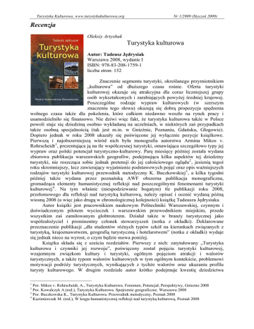 Turystyka Kulturowa, www.turystykakulturowa.org Nr 1/2009 (Styczeń 2009) Recenzja Oleksiy Artyshuk Turystyka kulturowa Autor: Tadeusz Jędrysiak Warszawa 2008, wydanie I ISBN: 978-83-208-1759-1 liczba stron: 152 Znaczenie segmentu turystyki, określanego przymiotnikiem „kulturowa” od dłuższego czasu rośnie. Oferta turystyki kulturowej okazuje się atrakcyjna dla coraz liczniejszej grupy osób wykształconych i zarabiających powyżej średniej krajowej. Poszczególne rodzaje wypraw kulturowych (w szerszym znaczeniu tego słowa) okazują się dobrą propozycja spędzenia wolnego czasu także dla pokolenia, które całkiem niedawno weszło na rynek pracy i usamodzielniło się finansowo. Nie dziwi więc fakt, że turystyka kulturowa także w Polsce powoli staje się dziedziną osobno wykładaną na uczelniach, w niektórych zaś przypadkach także osobną specjalnością (tak jest m.in. w Gnieźnie, Poznaniu, Gdańsku, Głogowie). Dopiero jednak w roku 2008 ukazały się poświęcone jej wyłącznie pozycje książkowe. Pierwszą i najobszerniejszą wśród nich była monografia autorstwa Armina Mikos v. Rohrscheidt 1 , prezentująca ją na tle współczesnej turystyki, omawiająca szczegółowo typy jej wypraw oraz polski potencjał turystyczno-kulturowy. Parę miesięcy później została wydana zbiorowa publikacja warszawskich geografów, podejmująca kilka aspektów tej dziedziny turystyki, nie roszcząca sobie jednak pretensji do jej całościowego oglądu 2 , jesienią tegoż roku skromniejszy, lecz zawierający wyjaśnienie podstawowych pojęć oraz opis ważniejszych rodzajów turystyki kulturowej przewodnik metodyczny K. Buczkowskiej 3 , a kilka tygodni później także wydana przez poznańską AWF obszerna publikacja monograficzna, gromadząca elementy humanistycznej refleksji nad poszczególnymi fenomenami turystyki kulturowej 4 . Na tym właśnie (niespodziewanie bogatym) tle publikacji roku 2008, przełomowego dla refleksji nad turystyką kulturową, należy opisać i ocenić wydaną późną wiosną 2008 (a więc jako drugą w chronologicznej kolejności) książkę Tadeusza Jędrysiaka. Autor książki jest pracownikiem naukowym Politechniki Warszawskiej, czynnym i doświadczonym pilotem wycieczek i warszawskim przewodnikiem miejskim, przede wszystkim zaś zamiłowanym globtroterem. Działał także w branży turystycznej jako współzałożyciel i prominentny członek stowarzyszeń (notka z okładki). Deklarowane przeznaczenie publikacji „dla studentów różnych typów szkół na kierunkach związanych z turystyką, krajoznawstwem, geografią turystyczną i hotelarstwem” (notka z okładki) wydaje się jednak nieco na wyrost, o czym będzie mowa poniżej. Książka składa się z sześciu rozdziałów. Pierwszy z nich: zatytułowany „Turystyka kulturowa i czynniki jej rozwoju”, poświęcony został pojęciu turystyki kulturowej, wzajemnym związkom kultury i turystyki, ogólnym pojęciom atrakcji i walorów turystycznych, a także typom walorów kulturowych w tym ogólnym kontekście, problemowi motywacji podróży turystycznych, wynikających z tychże walorów oraz ukazaniu profilu turysty kulturowego. W drugim rozdziale autor krótko podejmuje kwestię dziedzictwa 1 Por. Mikos v. Rohrscheidt, A., Turystyka Kulturowa. Fenomen, Potencjał, Perspektywy, Gniezno 2008 Por. Kowalczyk A.(red.), Turystyka Kulturowa. Spojrzenie geograficzne. Warszawa 2008 3 Por. Buczkowska K., Turystyka Kulturowa. Przewodnik metodyczny, Poznań 2008 4 Kazimierczak M. (red.), W kręgu humanistycznej refleksji nad turystyką kulturową, Poznań 2008 2 Turystyka Kulturowa, www.turystykakulturowa.org Nr 1/2009 (Styczeń 2009) kulturowego, po czym szerzej omawia formalnie zdefiniowane dziedzictwo kulturowe (obiekty listy Światowego Dziedzictwa kulturowego i naturalnego UNESCO), wskazując na znaczenie wykorzystania tego typu wiarygodnej promocji o globalnej skali w turystyce. Opis poszczególnych form turystyki kulturowej w Polsce, podjęty w najobszerniejszym rozdziale trzecim ogranicza się do turystyki miejskiej, w tym muzealnej, industrialnej, eventowej, pielgrzymkowej, kulinarnej (zapewne jest to najszersza jej prezentacja w polskiej literaturze na temat turystyki kulturowej) oraz ... mniejszości seksualnych. Jako osobny rodzaj turystyki kulturowej wskazana i opisana zostaje kulturowa turystyka wiejska. W rozdziale czwartym zestawione zostają podstawowe dane i prognozy, dotyczące rozwoju turystyki kulturowej na świecie, autor umieszcza tutaj także analizę SWOT polskiego (ogólnego) potencjału turystycznego, dokonaną w ramach warsztatów strategicznych Polskiej Agencji Rozwoju Turystyki w roku 2005 (s.116-120). Rozdział piąty poświęcony jest kwestiom ekonomicznym, związanym z rozwojem turystyki kulturowej. Autor akcentuje w nim głównie problematykę produktu turystycznego, szczególnie zaś pożądanych cech takiego produktu w turystyce kulturowej i potencjalnych korzyści, wynikających z promowania markowego produktu turystyki kulturowej dla Polski. Ostatni i najkrótszy (s. 141-146) szósty rozdział, poświęcony szansom i zagrożeniom stwarzanym przez turystykę, porusza kwestię turystyki zrównoważonej na terenach miejskich i wiejskich, podając już bez szerszej interpretacji jej podstawowe zasady. Książka zawiera także szeroką bibliografię pozycji książkowych i artykułów, wyłącznie w języku polskim. Mocnymi stronami omawianej pozycji są: jej przystępny język i znakomicie wykonane ilustracje, zestawienie i przejrzysta prezentacja tabel, prognoz i grafik, dotyczących turystyki kulturowej (i nie tylko jej samej), szeroki opis Światowego Dziedzictwa Kulturowego i znaczenia obiektów zaliczanych do tej kategorii dla turystyki kulturowej. Ciekawe są zamieszczone tam uwagi, dotyczące markowego produktu turystyki kulturowej i wskazania odnośnie jego pożądanej tematyki i struktury, wraz z opisem kilku wybranych produktów. Docenić należy fak