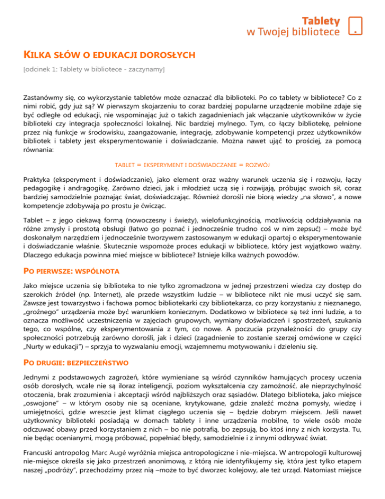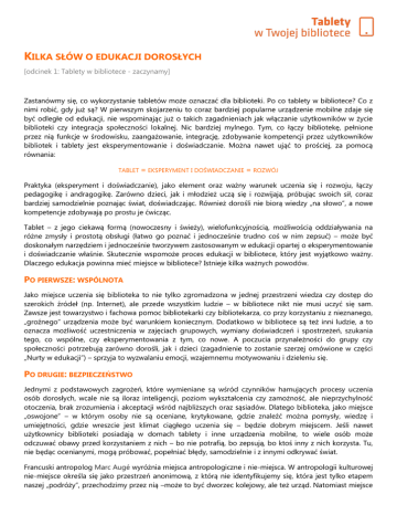 KILKA SŁÓW O EDUKACJI DOROSŁYCH [odcinek 1: Tablety w bibliotece - zaczynamy] Zastanówmy się, co wykorzystanie tabletów może oznaczać dla biblioteki. Po co tablety w bibliotece? Co z nimi robić, gdy już są? W pierwszym skojarzeniu to coraz bardziej popularne urządzenie mobilne zdaje się być odległe od edukacji, nie wspominając już o takich zagadnieniach jak włączanie użytkowników w życie biblioteki czy integracja społeczności lokalnej. Nic bardziej mylnego. Tym, co łączy bibliotekę, pełnione przez nią funkcje w środowisku, zaangażowanie, integrację, zdobywanie kompetencji przez użytkowników bibliotek i tablety jest eksperymentowanie i doświadczanie. Można nawet ująć to prościej, za pomocą równania: TABLET = EKSPERYMENT I DOŚWIADCZANIE = ROZWÓJ Praktyka (eksperyment i doświadczanie), jako element oraz ważny warunek uczenia się i rozwoju, łączy pedagogikę i andragogikę. Zarówno dzieci, jak i młodzież uczą się i rozwijają, próbując swoich sił, coraz bardziej samodzielnie poznając świat, doświadczając. Również dorośli nie biorą wiedzy „na słowo”, a nowe kompetencje zdobywają po prostu je ćwicząc. Tablet – z jego ciekawą formą (nowoczesny i świeży), wielofunkcyjnością, możliwością oddziaływania na różne zmysły i prostotą obsługi (łatwo go poznać i jednocześnie trudno coś w nim zepsuć) – może być doskonałym narzędziem i jednocześnie tworzywem zastosowanym w edukacji opartej o eksperymentowanie i doświadczanie właśnie. Skutecznie wspomoże proces edukacji w bibliotece, który jest wyjątkowo ważny. Dlaczego edukacja powinna mieć miejsce w bibliotece? Istnieje kilka ważnych powodów. PO PIERWSZE: WSPÓLNOTA Jako miejsce uczenia się biblioteka to nie tylko zgromadzona w jednej przestrzeni wiedza czy dostęp do szerokich źródeł (np. Internet), ale przede wszystkim ludzie – w bibliotece nikt nie musi uczyć się sam. Zawsze jest towarzystwo i fachowa pomoc bibliotekarki czy bibliotekarza, co przy korzystaniu z nieznanego, „groźnego” urządzenia może być warunkiem koniecznym. Dodatkowo w bibliotece są też inni ludzie, a to oznacza możliwość uczestniczenia w zajęciach grupowych, wymiany doświadczeń i spostrzeżeń, szukania tego, co wspólne, czy eksperymentowania z tym, co nowe. A poczucia przynależności do grupy czy społeczności potrzebują zarówno dorośli, jak i dzieci (zagadnienie to zostanie szerzej omówione w części „Nurty w edukacji”) – sprzyja to wyzwalaniu emocji, wzajemnemu motywowaniu i dzieleniu się. PO DRUGIE: BEZPIECZEŃSTWO Jednymi z podstawowych zagrożeń, które wymieniane są wśród czynników hamujących procesy uczenia osób dorosłych, wcale nie są iloraz inteligencji, poziom wykształcenia czy zamożność, ale nieprzychylność otoczenia, brak zrozumienia i akceptacji wśród najbliższych oraz sąsiadów. Dlatego biblioteka, jako miejsce „oswojone” – w którym osoby nie są oceniane, krytykowane, gdzie znaleźć można pomysły, wiedzę i umiejętności, gdzie wreszcie jest klimat ciągłego uczenia się – będzie dobrym miejscem. Jeśli nawet użytkownicy biblioteki posiadają w domach tablety i inne urządzenia mobilne, to wiele osób może odczuwać obawy przed korzystaniem z nich – bo nie potrafią, bo zepsują, bo ktoś inny z nich korzysta. Tu, nie będąc ocenianymi, mogą próbować, popełniać błędy, samodzielnie i z innymi odkrywać świat. Francuski antropolog Marc Augé wyróżnia miejsca antropologiczne i nie-miejsca. W antropologii kulturowej nie-miejsce określa się jako przestrzeń anonimową, z którą nie identyfikujemy się, która jest tylko etapem naszej „podróży”, przechodzimy przez nią –może to być dworzec kolejowy, ale też urząd. Natomiast miejsce antropologiczne to takie, które jest „swoiste”, ma znaczenie, z którym się identyfikujemy – biblioteka jest takim miejscem, w nim i z nim tworzy się więzi i poszerza horyzonty. PO TRZECIE: AKTYWNOŚĆ Kiedy ktoś przychodzi do biblioteki po raz pierwszy, nie bardzo wie, co może w niej robić, oprócz wypożyczenia książki lub skorzystania z komputera czy czasopisma na miejscu. Tablety pozwalają na aktywność, ruch; uruchamiają pomysły, pozwalają na oswojenie się z nowym miejscem i innymi kreatywnymi, możliwymi działaniami. PO CZWARTE: RÓWNOŚĆ Jedną z wielkich barier w edukacji jest dostęp do zasobów. Oprócz tego, że czasem trudno wymyślić ciekawą aktywność z książką, komputerem czy tabletem, to zwyczajnie można nie mieć do nich dostępu. W tym ujęciu tablet, dostępny w komfortowej przestrzeni biblioteki, to darmowe „okno na świat”. Oddawanie tabletów do użytku osobom odwiedzającym bibliotekę, a także rozpowszechnianie informacji o dostępności i zaletach tych urządzeń, to jeden ze sposobów na wyrównywanie szans. Co więcej, świadome umożliwianie nauki i zabawy z wykorzystaniem tabletów oznaczać będzie włączanie osób i grup wykluczonych na przykład ze względu na płeć, wiek czy stan zdrowia. Jak wynika z badań Sugata Mitry (więcej na ten temat Czytelnik znajdzie w dalszej części artykułu), chłopcy są często lepiej przygotowani kulturowo do korzystania z urządzeń elektronicznych, natomiast dziewczynki trzeba do tego ośmielać – w bibliotece można to robić! Na zakończenie rozważań poświęconych zastosowaniu tabletów w bibliotekach, warto podkreślić, że ich używanie ma być przede wszystkim śmiałe i odważne. Zachęcamy do eksperymentowania (samodzielnie i z innymi), dzielenia się refleksjami i odkryciami, zbierania wiedzy, teorii i planowania kolejnych zastosowań. Warto pamiętać, że tablet jest narzędziem, które ma nas i innych zbliżyć m.in. do nowych światów (np. aplikacja Mapa kosmosu), nowych kompetencji (np. nauka języków obcych, doskonalenie umiejętności rysowniczych) czy umożliwić zachowywanie przeszłości (np. aplikacje do