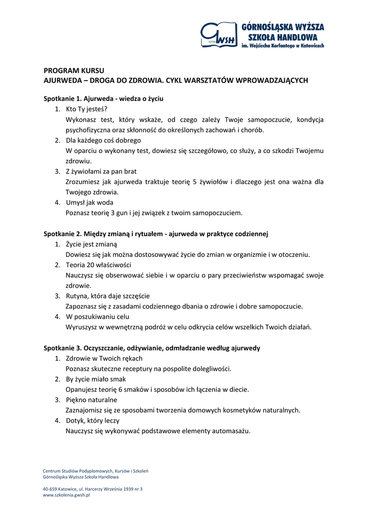 PROGRAM KURSU AJURWEDA – DROGA DO ZDROWIA. CYKL WARSZTATÓW WPROWADZAJĄCYCH Spotkanie 1. Ajurweda - wiedza o życiu 1. Kto Ty jesteś? Wykonasz test, który wskaże, od czego zależy Twoje samopoczucie, kondycja psychofizyczna oraz skłonność do określonych zachowań i chorób. 2. Dla każdego coś dobrego W oparciu o wykonany test, dowiesz się szczegółowo, co służy, a co szkodzi Twojemu zdrowiu. 3. Z żywiołami za pan brat Zrozumiesz jak ajurweda traktuje teorię 5 żywiołów i dlaczego jest ona ważna dla Twojego zdrowia. 4. Umysł jak woda Poznasz teorię 3 gun i jej związek z twoim samopoczuciem. Spotkanie 2. Między zmianą i rytuałem - ajurweda w praktyce codziennej 1. Życie jest zmianą Dowiesz się jak można dostosowywać życie do zmian w organizmie i w otoczeniu. 2. Teoria 20 właściwości Nauczysz się obserwować siebie i w oparciu o pary przeciwieństw wspomagać swoje zdrowie. 3. Rutyna, która daje szczęście Zapoznasz się z zasadami codziennego dbania o zdrowie i dobre samopoczucie. 4. W poszukiwaniu celu Wyruszysz w wewnętrzną podróż w celu odkrycia celów wszelkich Twoich działań. Spotkanie 3. Oczyszczanie, odżywianie, odmładzanie według ajurwedy 1. Zdrowie w Twoich rękach Poznasz skuteczne receptury na pospolite dolegliwości. 2. By życie miało smak Opanujesz teorię 6 smaków i sposobów ich łączenia w diecie. 3. Piękno naturalne Zaznajomisz się ze sposobami tworzenia domowych kosmetyków naturalnych. 4. Dotyk, który leczy Nauczysz się wykonywać podstawowe elementy automasażu. Centrum Studiów Podyplomowych, Kursów i Szkoleń Górnośląska Wyższa Szkoła Handlowa 40-659 Katowice, ul. Harcerzy Września 1939 nr 3 www.szkolenia.gwsh.pl