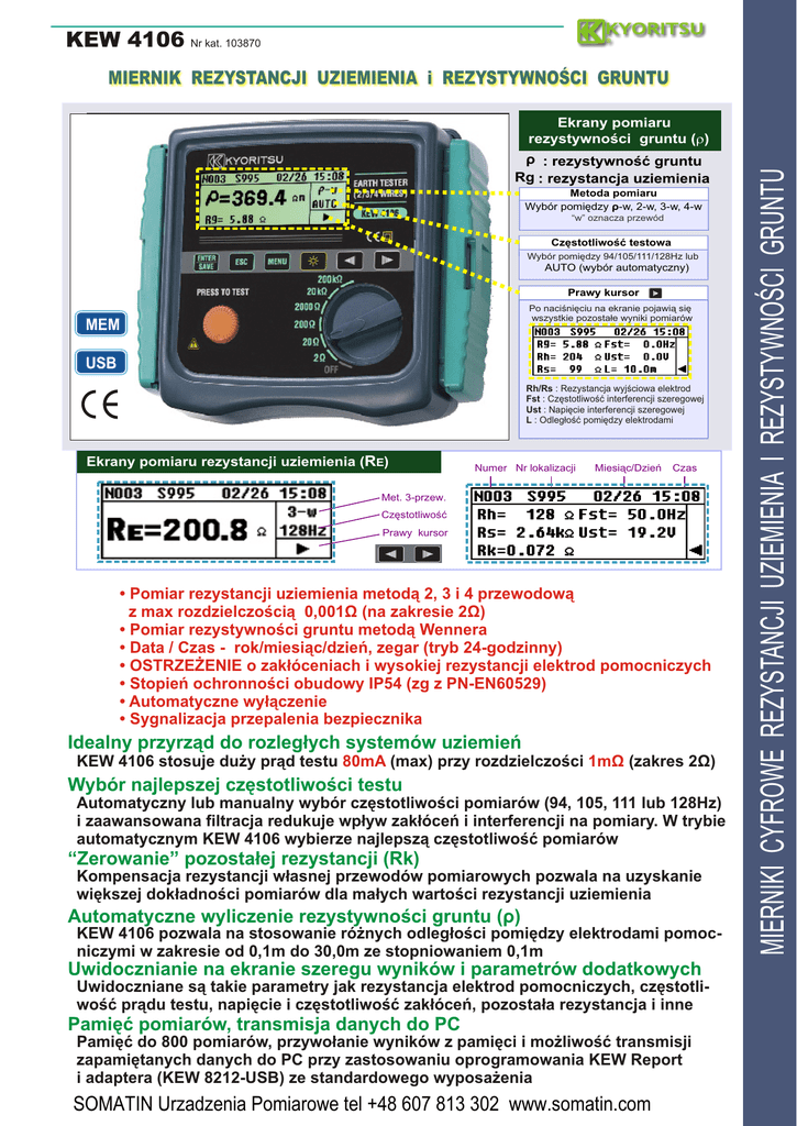 KEW 4106 Nr kat. 103870 MIERNIK REZYSTANCJI UZIEMIENIA i REZYSTYWNOŚCI GRUNTU ρ : rezystywność gruntu Rg : rezystancja uziemienia Metoda pomiaru value Wybór pomiędzy ρ-w, 2-w, 3-w, 4-w (between ES-?? “w”electrodes oznacza przewód Częstotliwość testowa Wybór pomiędzy 94/105/111/128Hz lub AUTO (wybór automatyczny) Prawy kursor Po naciśnięciu na ekranie pojawią się wszystkie pozostałe wyniki pomiarów MEM USB Rh/Rs : Rezystancja wyjściowa elektrod Fst : Częstotliwość interferencji szeregowej Ust : Napięcie interferencji szeregowej L : Odległość pomiędzy elektrodami Ekrany pomiaru rezystancji uziemienia (RE) Numer Nr lokalizacji Miesiąc/Dzień Czas Met. 3-przew. Częstotliwość Prawy kursor • Pomiar rezystancji uziemienia metodą 2, 3 i 4 przewodową z max rozdzielczością 0,001Ω (na zakresie 2Ω) • Pomiar rezystywności gruntu metodą Wennera • Data / Czas - rok/miesiąc/dzień, zegar (tryb 24-godzinny) • OSTRZEŻENIE o zakłóceniach i wysokiej rezystancji elektrod pomocniczych • Stopień ochronności obudowy IP54 (zg z PN-EN60529) • Automatyczne wyłączenie • Sygnalizacja przepalenia bezpiecznika Idealny przyrząd do rozległych systemów uziemień KEW 4106 stosuje duży prąd testu 80mA (max) przy rozdzielczości 1mΩ (zakres 2Ω) Wybór najlepszej częstotliwości testu Automatyczny lub manualny wybór częstotliwości pomiarów (94, 105, 111 lub 128Hz) i zaawansowana filtracja redukuje wpływ zakłóceń i interferencji na pomiary. W trybie automatycznym KEW 4106 wybierze najlepszą częstotliwość pomiarów “Zerowanie” pozostałej rezystancji (Rk) Kompensacja rezystancji własnej przewodów pomiarowych pozwala na uzyskanie większej dokładności pomiarów dla małych wartości rezystancji uziemienia Automatyczne wyliczenie rezystywności gruntu (ρ) KEW 4106 pozwala na stosowanie różnych odległości pomiędzy elektrodami pomocniczymi w zakresie od 0,1m do 30,0m ze stopniowaniem 0,1m Uwidocznianie na ekranie szeregu wyników i parametrów dodatkowych Uwidoczniane są takie parametry jak rezystancja elektrod pomocniczych, częstotliwość prądu testu, napięcie i częstotliwość zakłóceń, pozostała rezystancja i inne Pamięć pomiarów, transmisja danych do PC Pamięć do 800 pomiarów, przywołanie wyników z pamięci i możliwość transmisji zapamiętanych danych do PC przy zastosowaniu oprogramowania KEW Report i adaptera (KEW 8212-USB) ze standardowego wyposażenia SOMATIN Urzadzenia Pomiarowe tel +48 607 813 302 www.somatin.com MIERNIKI CYFROWE REZYSTANCJI UZIEMIENIA I REZYSTYWNOŚCI GRUNTU Ekrany pomiaru rezystywności gruntu (r) KEW4106 cd. Przykłady wykonywania pomiarów Pomiar rezystancji uziemienia metodą 4 przewodowa Pomiar rezystywności gruntu (ρ) Czerwony Żółty Zielony Mierzony uziom Elektrody pomocnicze Metoda 4-ro przewodowa jest bardziej precyzyjna 3-przewodowa ponieważ eliminuje wpływ rezystancji przewodu podłączonego do terminalu E na wynik. KEW 4106 jest bardzo przydatny dla optymalnego zaprojektowania instalacji uziemienia, co daje duże oszczędności. Zalecany również do prac geologicznych i archeologicznych. Komunikacja z komputerem Oprogramowanie KEW-Report i opto-adapter USB ( KEW 8212-USB) są w wyposażeniu standardowym. KEW-Report umożliwia: • Przesłanie zapamiętanych danych do PC • Analizę przesłanych danych KEW 4106 z wyposażeniem KEW4106 REZYSTANCJA UZIEMIENIA Funkcja RE (metoda 2/3/4 przewodowa) Rg ( tylko przy pomiarze rezystywności r) Zakres Rozdzielczość 2W 0,001W 0~2,099W 20W 200W 0,01W 0~20,99W 0,1W 1W 10W 100W 0~209,9W 2000W 20kW 200kW Wyświetlanie 0~2099W 0~20,99kW 0~209,9kW Pomocnicze elektrody uziemiające Rh, Rs Dokładność ±2%ww ±0,03W ±2%ww ±5cyfr (Re+Rh+Rs)*8% REZYSTYWNOŚĆ GRUNTU 2W 20W 200W 2000W 20kW 200kW Napięcie interferencji szeregowej (tylko AC) 0~395,6Wm 0,1Wm/1Wm Autozakresy Napięcie Ust 50V 0,1V Częstotliwość Fst Autozakresy 0,1Hz/1Hz 0~3956Wm 0~39,56kWm 0~395,6kWm 0~1999kWm 0~50,9Vrms 40,00~499,9Hz r - dokładność zależy od pomiaru Rg r=2P*a*Rg “a” jest dystansem między sondami uziemiającymi: 1,0~30,0m(krok 0,1m) ±2%ww ±2cyfry (50/60Hz) ±3%ww ±2c (40~500Hz) ±1%ww ±2cyfry DANE OGÓLNE Wyświetlacz LCD typu Dot-matrix z podświetleniem tła, 192x64 punkty, monochromatyczny Zasilanie 12V DC: 8 x bateria LR06 1,5V Wymiary 185(szer) x 89(gł) x 167(wys) [mm] Masa ok. 900g (z bateriami) Warunki pracy i przechowywania praca: -10°C~50°C, RH 75% lub mniej (bez kondensacji) przechowywanie: -20°C~60°C, RH 75% lub mniej (bez kondensacji) Akcesoria 7229-Przewody pomiarowe (zielony/czarny/żółty - po 20m, czerwony 40m), 7238- uproszczone przew. pomiarowe, 8032 elektrody pmocnicze ostrzowe (2x2sztuki), 8200-04-rolki na przewody pom. (4szt), 8212USB-optoadapter USB + program KEW Report na CD, baterie LR 06 x 8 (zainstalow.), 9125-torba przen., pasek naramienny, instrukcja obsługi www.somatin.com MIERNIKI CYFROWE REZYSTANCJI UZIEMIENIA I REZYSTYWNOŚCI GRUNTU Czarny