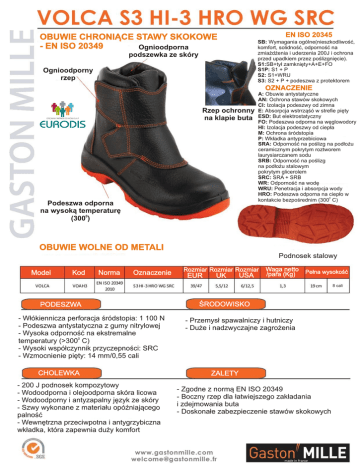 EN ISO 20345 OBUWIE CHRONIĄCE STAWY SKOKOWE - EN ISO 20349 Ognioodporna SB: Wymagania ogólne(nieszkodliwość, komfort, solidność, odporność na zmiażdżenia i uderzenia 200J i ochrona przed upadkiem przez poślizgnięcie). S1:SB+tył zamknięty+A+E+FO S1P: S1 + P S2: S1+WRU S3: S2 + P + podeszwa z protektorem podszewka ze skóry Ognioodporny rzep OZNACZENIE Rzep ochronny na klapie buta Podeszwa odporna na wysoką temperaturę (3000) A: Obuwie antystatyczne AN: Ochrona stawów skokowych CI: Izolacja podeszwy od zimna E: Absorpcja wstrrząśó w strefie pięty ESD: But elektrostatyczny FO: Podeszwa odporna na węglowodory HI: Izolacja podeszwy od ciepła M: Ochrona śródstopia P: Wkładka antyprzebiciowa SRA: Odporność na poślizg na podłożu ceramicznym pokrytym roztworem laurysiarczanem sodu SRB: Odporność na poślizg na podłożu stalowym pokrytym glicerolem SRC: SRA + SRB WR: Odporność na wodę WRU: Penetracja i absorpcja wody HRO: Podeszwa odporna na ciepło w kontakcie bezpośrednim (3000 C) OBUWIE WOLNE OD METALI Podnosek stalowy Model Kod Norma Oznaczenie Rozmiar Rozmiar Rozmiar EUR UK USA Waga netto /para (Kg) Pełna wysokość 8 cali PODESZWA - Włókiennicza perforacja śródstopia: 1 100 N - Podeszwa antystatyczna z gumy nitrylowej - Wysoka odporność na ekstremalne 0 temperatury (>300 C) - Wysoki współczynnik przyczepności: SRC - Wzmocnienie pięty: 14 mm/0,55 cali CHOLEWKA - 200 J podnosek kompozytowy - Wodoodporna i olejoodporna skóra licowa - Wodoodporny i antyzapalny język ze skóry - Szwy wykonane z materiału opóźniającego palność - Wewnętrzna przeciwpotna i antygrzybiczna wkładka, która zapewnia duży komfort ŚRODOWISKO - Przemysł spawalniczy i hutniczy - Duże i nadzwyczajne zagrożenia ZALETY - Zgodne z normą EN ISO 20349 - Boczny rzep dla łatwiejszego zakładania i zdejmowania buta - Doskonałe zabezpieczenie stawów skokowych