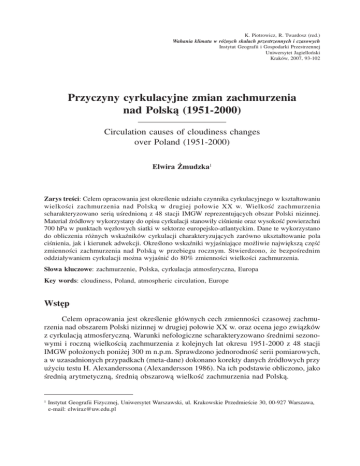 K. Piotrowicz, R. Twardosz (red.) Wahania klimatu w różnych skalach przestrzennych i czasowych Instytut Geografii i Gospodarki Przestrzennej Uniwersytet Jagielloński Kraków, 2007, 93-102 Przyczyny cyrkulacyjne zmian zachmurzenia nad Polską (1951-2000) Circulation causes of cloudiness changes over Poland (1951-2000) Elwira Żmudzka1 Zarys treści: Celem opracowania jest określenie udziału czynnika cyrkulacyjnego w kształtowaniu wielkości zachmurzenia nad Polską w drugiej połowie XX w. Wielkość zachmurzenia scharakteryzowano serią uśrednioną z 48 stacji IMGW reprezentujących obszar Polski nizinnej. Materiał źródłowy wykorzystany do opisu cyrkulacji stanowiły ciśnienie oraz wysokość powierzchni 700 hPa w punktach węzłowych siatki w sektorze europejsko-atlantyckim. Dane te wykorzystano do obliczenia różnych wskaźników cyrkulacji charakteryzujących zarówno ukształtowanie pola ciśnienia, jak i kierunek adwekcji. Określono wskaźniki wyjaśniające możliwie największą część zmienności zachmurzenia nad Polską w przebiegu rocznym. Stwierdzono, że bezpośrednim oddziaływaniem cyrkulacji można wyjaśnić do 80% zmienności wielkości zachmurzenia. Słowa kluczowe: zachmurzenie, Polska, cyrkulacja atmosferyczna, Europa Key words: cloudiness, Poland, atmospheric circulation, Europe Wstęp Celem opracowania jest określenie głównych cech zmienności czasowej zachmurzenia nad obszarem Polski nizinnej w drugiej połowie XX w. oraz ocena jego związków z cyrkulacją atmosferyczną. Warunki nefologiczne scharakteryzowano średnimi sezonowymi i roczną wielkością zachmurzenia z kolejnych lat okresu 1951-2000 z 48 stacji IMGW położonych poniżej 300 m n.p.m. Sprawdzono jednorodność serii pomiarowych, a w uzasadnionych przypadkach (meta-dane) dokonano korekty danych źródłowych przy użyciu testu H. Alexanderssona (Alexandersson 1986). Na ich podstawie obliczono, jako średnią arytmetyczną, średnią obszarową wielkość zachmurzenia nad Polską. 1 Instytut Geografii Fizycznej, Uniwersytet Warszawski, ul. Krakowskie Przedmieście 30, 00-927 Warszawa, e-mail: [email protected] Elwira Żmudzka Wieloletnią zmienność zachmurzenia nad Polską opisano kilkoma metodami. Określono tendencje zmian wielkości zachmurzenia wykorzystując równanie regresji liniowej, fluktuacje na podstawie przebiegów kumulowanych odchyleń od średniej wieloletniej oraz okresowość stosując metodę „sinusoid regresji” (Boryczka 1998) i analizę falkową (Torrence, Compo 1998). Określono związki wielkości zachmurzenia z polem ciśnienia nad Europą i północnym Atlantykiem. W obliczeniach wykorzystano wartości ciśnienia oraz wysokości powierzchni izobarycznej 700 hPa pochodzące z punktów węzłowych siatki z obszaru 30o-70oN i 40oW-60oE. Krok siatki wynosi 2,5oφ i 5oλ. Dane te pochodzą z bazy NCEP/NCAR Reanalysis (1951-2000). W polach podstawowych 10oφ i 20oλ obliczono 4 wskaźnik wirowości ξp (ξp =∑ p-4pm, gdzie: p – ciśnienie w czterech skrajnych punktach 1 pola podstawowego, pm – ciśnienie w środku pola). Pola te przesuwano o Δ 2,5oφ i 5oλ. Podobna formuła posłużyła do obliczenia wartości wskaźnika wirowości na powierzchni izobarycznej 700 hPa. Siłę zależności wielkości zachmurzenia nad obszarem Polski od ciśnienia atmosferycznego i wskaźników cyrkulacji oceniono za pomocą współczynnika korelacji liniowej. Na podstawie rozkładów przestrzennych siły powiązań wielkości zachmurzenia nad Polską z ciśnieniem i geopotencjałem oraz wirowością na obu poziomach określono lokalne nefologiczne wskaźniki cyrkulacji. Są one odpowiednio różnicami wartości ciśnienia, wysokości powierzchni izobarycznej 700 hPa oraz wirowości na obu poziomach między punktami, w których zachmurzenie nad Polską było najsilniej powiązane dodatnio i ujemnie z tymi charakterystykami pola ciśnienia. Zmienność wielkości zachmurzenia rozpatrzono w aspekcie zmienności warunków cyrkulacyjnych w badanym wieloleciu. Zmienność wielkości zachmurzenia nad obszarem Polski W drugiej połowie XX w. w przeważającej części roku (zimą, wiosną i latem) wielkość zachmurzenia nad Polską uległa zmniejszeniu (tab. 1). Trendy nie spełniały jednak warunku istotności na poziomie 0,05. Na uwagę zasługuje malejąca tendencja zmian zachmurzenia zimą (istotność na poziomie α = 0,10). Jesienią stwierdzono nieistotny wzrost wielkości zachmurzenia. Tab. 1. Współczynniki trendu liniowego a [%·rok-1] oraz ocena rangowa (τ – wartości statystyki Manna-Kendalla) trendu zmian średnich sezonowych i rocznej wielkości zachmurzenia nad Polską w latach 1951-2000 (Żmudzka 2004a,b) Table 1. Linear trend coefficients a [%·year-1] and rank evaluation (τ – the values of the MannKendall’s statistics) of the trend of changes of seasonal and annual means of cloudiness in Poland in years 1951-2000 (Żmudzka 2004a,b) 94 Cyrkulacja a zmiany zachmurzenia nad Polską Potwierdzeniem wystąpienia ujemnych trendów zmian zachmurzenia zimą i wiosną jest kształt krzywych obrazujących kumulowane odchylenia od średnich (ryc. 1). Zmiana znaku odchyleń z dodatnich na przeważające ujemne przypada na początek lat 70. XX w. Na połowę lat 1970. przypada także granica charakteru zmienności wielkości zachmurzenia latem. Jesienią w pierwszej połowie badanego 50-lecia zachmurzenie nie uległo istotnej zmianie, w drugiej zaś wzrosło; przejście od anomalii ujemnych do dodatnich nastąpiło w 1991 r. Kumulowane odchylenia nie przekraczają wartości 3 odchyleń standardowych, wskazując na występowanie nielosowych fluktuacji w szeregach czasowych sezonowych i rocznej wielkości zachmurzenia (Drozdov, Grigoreva 1972). Ryc. 1. Kumulowane odchylenia średnich sezonowych wielkości zachmurzenia nad Polską od średnich z lat 1951-2000. Zaznaczono zakres 1, 2 i 3 odchyleń standardowych Fig. 1. Cumulative deviations of mean seasonal cloudiness