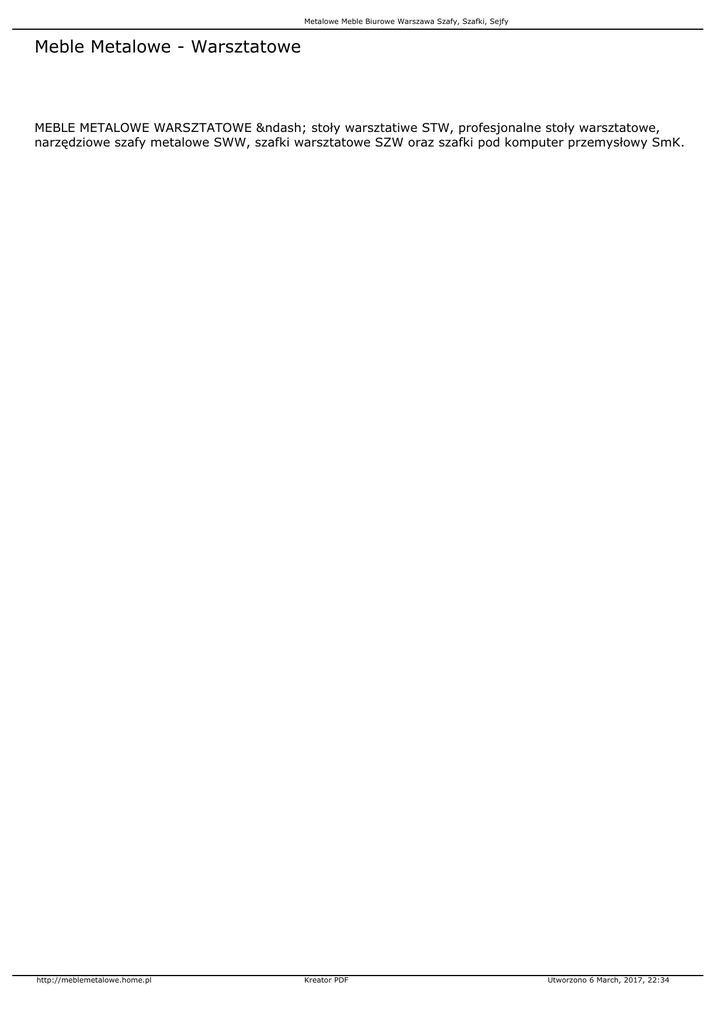 Metalowe Meble Biurowe Warszawa Szafy, Szafki, Sejfy Meble Metalowe - Warsztatowe MEBLE METALOWE WARSZTATOWE – stoły warsztatiwe STW, profesjonalne stoły warsztatowe, narzędziowe szafy metalowe SWW, szafki warsztatowe SZW oraz szafki pod komputer przemysłowy SmK. http://meblemetalowe.home.pl Kreator PDF Utworzono 6 March, 2017, 22:34