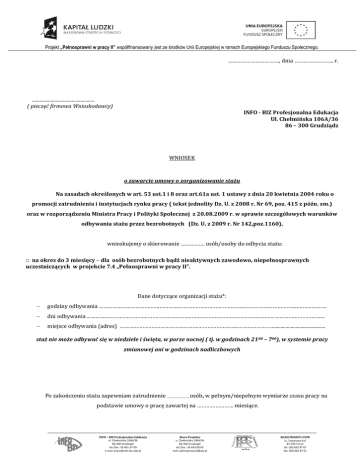 Projekt „Pełnosprawni w pracy II” współfinansowany jest ze środków Unii Europejskiej w ramach Europejskiego Funduszu Społecznego. ……………………………., dnia …………………….. r. .................................................. ( pieczęć firmowa Wnioskodawcy) INFO - BIZ Profesjonalna Edukacja Ul. Chełmińska 106A/36 86 – 300 Grudziądz WNIOSEK o zawarcie umowy o zorganizowanie stażu Na zasadach określonych w art. 53 ust.1 i 8 oraz art.61a ust. 1 ustawy z dnia 20 kwietnia 2004 roku o promocji zatrudnienia i instytucjach rynku pracy ( tekst jednolity Dz. U. z 2008 r. Nr 69, poz. 415 z późn. zm.) oraz w rozporządzeniu Ministra Pracy i Polityki Społecznej z 20.08.2009 r. w sprawie szczegółowych warunków odbywania stażu przez bezrobotnych (Dz. U. z 2009 r. Nr 142,poz.1160), wnioskujemy o skierowanie ……………. osób/osoby do odbycia stażu: □ na okres do 3 miesięcy – dla osób bezrobotnych bądź nieaktywnych zawodowo, niepełnosprawnych uczestniczących w projekcie 7.4 „Pełnosprawni w pracy II”. Dane dotyczące organizacji stażu*: godziny odbywania ………………………………….………………………………………………………………………………..………………. dni odbywania ...……………………..………………………………………………………………………………………………………………… miejsce odbywania (adres) …………………………………………….……………………...……………………......................................... staż nie może odbywać się w niedziele i święta, w porze nocnej ( tj. w godzinach 21 00 – 700), w systemie pracy zmianowej ani w godzinach nadliczbowych Po zakończeniu stażu zapewniam zatrudnienie …………….……. osób, w pełnym/niepełnym wymiarze czasu pracy na podstawie umowy o pracę zawartej na …………………… miesiące. INFO – BIZ Profesjonalna Edukacja ul. Chełmińska 106A/36 86-300 Grudziądz tel./fax.: 56 461-37-09 e-mail: [email protected] Biuro Projektu u. Chełmińska 106A/36 86-300 Grudziądz tel./fax.: 56 643-00-05 mail: [email protected] BIURO PROJEKTU PCPR ul. Towarowa 4-6 87-100 Toruń tel: (56) 662 87 67 fax: (56) 662 87 51 Projekt „Pełnosprawni w pracy II” współfinansowany jest ze środków Unii Europejskiej w ramach Europejskiego Funduszu Społecznego. DANE DOTYCZĄCE WNIOSKODAWCY 1. Nazwa……………………………………………………………………………………………………………………………………. 2. Siedziba…………………………………………………………………………………………………………………………………… tel/fax/e-mail………………………………………………………………………………..……………………………………..…………. 3. Miejsce prowadzenia działalności……………………………………………………………………………………...………. 4. Forma prawna…………………………………………………………………………………………………...………………..… 5. Osoby upoważnione do reprezentacji: ………………………………………………………………………………………………………………………………………………… ( podać imię i nazwisko oraz zajmowane stanowisko ) 6. Rodzaj prowadzonej działalności……………………………………………………………………….……..……………. 7. Data rozpoczęcia działalności ……………………………………………………………………….……………….……… 8. Numer NIP………………………………………………………………………...…………..……...………………..…….….…… 9. Numer REGON……………………………………………………………………………………………………….…..….………... 10. Numer EKD/PKD………………………………………………………………………………………...……………..….….……… 11. Stan zatrudnienia: Liczba pracowników w przeliczeniu na pełny wymiar czasu pracy Liczba osób odbywających staż u Wnioskodawcy na dzień złożenia wniosku Jednocześnie oświadczam, że: w stosunku do Wnioskodawcy nie toczy się postępowanie upadłościowe i nie został zgłoszony wniosek o likwidację, organizacja w moim zakładzie stażu dla skierowanego bezrobotnego, nie będzie przyczyną zwolnień pracowników obecnie zatrudnionych w zakładzie, w okresie 365 dni przed dniem zgłoszenia oferty pracy nie zostałem skazany prawomocnym wyrokiem za naruszenie praw pracowniczych oraz nie jestem objęty postępowaniem wyjaśniającym w tej sprawie, zobowiązuję się do skierowania bezrobotnego(ych) na odpowiednie badania lekarskie przed rozpoczęciem przez niego(nich) stażu oraz dostarczenia ich nie później niż w ciągu 10 dni od dnia rozpoczęcia stażu przez bezrobotnego(ych). Świadomy odpowiedzialności karnej wynikającej z art. 233 k.k. za składanie fałszywych zeznań oświadczam, że dane zawarte w niniejszym wniosku są zgodne z prawdą. Wyrażam zgodę na przetwarzanie moich danych osobowych dla celów związanych z organizacją stażu w ramach projektu 7.4 Pełnosprawni w pracy, zgodnie z ustawą z dnia 29 sierpnia 1997 roku o ochronie danych osobowych (t.j. Dz. U. z 2002 r. Nr 101, poz. 926 z późn. zm.). ……….......................................................... ( podpis Wnioskodawcy lub osób upoważnionych do reprezentacji ) INFO – BIZ Profesjonalna Edukacja ul. Chełmińska 106A/36 86-300 Grudziądz tel./fax.: 56 461-37-09 e-mail: [email protected] Biuro Projektu u. Chełmińska 106A/36 86-300 Grudziądz tel./fax.: 56 643-00-05 mail: [email protected] BIUR