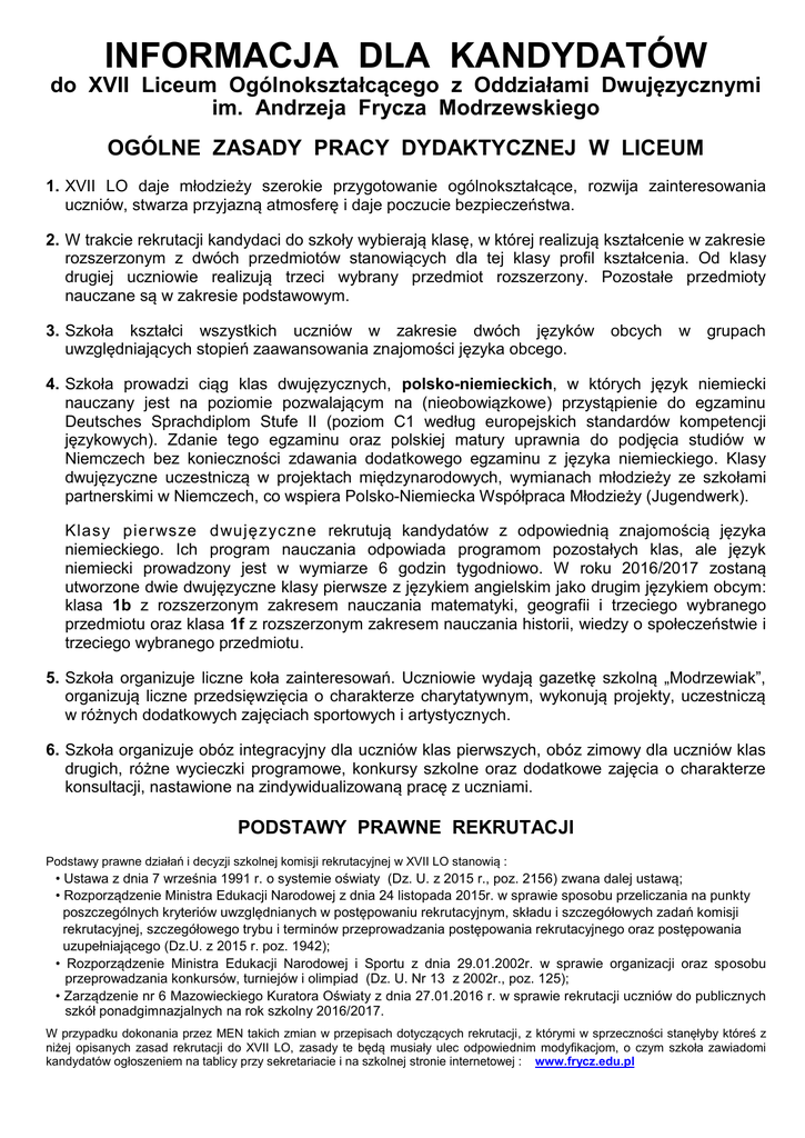 INFORMACJA DLA KANDYDATÓW do XVII Liceum Ogólnokształcącego z Oddziałami Dwujęzycznymi im. Andrzeja Frycza Modrzewskiego OGÓLNE ZASADY PRACY DYDAKTYCZNEJ W LICEUM 1. XVII LO daje młodzieży szerokie przygotowanie ogólnokształcące, rozwija zainteresowania uczniów, stwarza przyjazną atmosferę i daje poczucie bezpieczeństwa. 2. W trakcie rekrutacji kandydaci do szkoły wybierają klasę, w której realizują kształcenie w zakresie rozszerzonym z dwóch przedmiotów stanowiących dla tej klasy profil kształcenia. Od klasy drugiej uczniowie realizują trzeci wybrany przedmiot rozszerzony. Pozostałe przedmioty nauczane są w zakresie podstawowym. 3. Szkoła kształci wszystkich uczniów w zakresie dwóch języków uwzględniających stopień zaawansowania znajomości języka obcego. obcych w grupach 4. Szkoła prowadzi ciąg klas dwujęzycznych, polsko-niemieckich, w których język niemiecki nauczany jest na poziomie pozwalającym na (nieobowiązkowe) przystąpienie do egzaminu Deutsches Sprachdiplom Stufe II (poziom C1 według europejskich standardów kompetencji językowych). Zdanie tego egzaminu oraz polskiej matury uprawnia do podjęcia studiów w Niemczech bez konieczności zdawania dodatkowego egzaminu z języka niemieckiego. Klasy dwujęzyczne uczestniczą w projektach międzynarodowych, wymianach młodzieży ze szkołami partnerskimi w Niemczech, co wspiera Polsko-Niemiecka Współpraca Młodzieży (Jugendwerk). Klasy pierwsze dwujęzyczne rekrutują kandydatów z odpowiednią znajomością języka niemieckiego. Ich program nauczania odpowiada programom pozostałych klas, ale język niemiecki prowadzony jest w wymiarze 6 godzin tygodniowo. W roku 2016/2017 zostaną utworzone dwie dwujęzyczne klasy pierwsze z językiem angielskim jako drugim językiem obcym: klasa 1b z rozszerzonym zakresem nauczania matematyki, geografii i trzeciego wybranego przedmiotu oraz klasa 1f z rozszerzonym zakresem nauczania historii, wiedzy o społeczeństwie i trzeciego wybranego przedmiotu. 5. Szkoła organizuje liczne koła zainteresowań. Uczniowie wydają gazetkę szkolną „Modrzewiak”, organizują liczne przedsięwzięcia o charakterze charytatywnym, wykonują projekty, uczestniczą w różnych dodatkowych zajęciach sportowych i artystycznych. 6. Szkoła organizuje obóz integracyjny dla uczniów klas pierwszych, obóz zimowy dla uczniów klas drugich, różne wycieczki programowe, konkursy szkolne oraz dodatkowe zajęcia o charakterze konsultacji, nastawione na zindywidualizowaną pracę z uczniami. PODSTAWY PRAWNE REKRUTACJI Podstawy prawne działań i decyzji szkolnej komisji rekrutacyjnej w XVII LO stanowią : • Ustawa z dnia 7 września 1991 r. o systemie oświaty (Dz. U. z 2015 r., poz. 2156) zwana dalej ustawą; • Rozporządzenie Ministra Edukacji Narodowej z dnia 24 listopada 2015r. w sprawie sposobu przeliczania na punkty poszczególnych kryteriów uwzględnianych w postępowaniu rekrutacyjnym, składu i szczegółowych zadań komisji rekrutacyjnej, szczegółowego trybu i terminów przeprowadzania postępowania rekrutacyjnego oraz postępowania uzupełniającego (Dz.U. z 2015 r. poz. 1942); • Rozporządzenie Ministra Edukacji Narodowej i Sportu z dnia 29.01.2002r. w sprawie organizacji oraz sposobu przeprowadzania konkursów, turniejów i olimpiad (Dz. U. Nr 13 z 2002r., poz. 125); • Zarządzenie nr 6 Mazowieckiego Kuratora Oświaty z dnia 27.01.2016 r. w sprawie rekrutacji uczniów do publicznych szkół ponadgimnazjalnych na rok szkolny 2016/2017. W przypadku dokonania przez MEN takich zmian w przepisach dotyczących rekrutacji, z którymi w sprzeczności stanęłyby któreś z niżej opisanych zasad rekrutacji do XVII LO, zasady te będą musiały ulec odpowiednim modyfikacjom, o czym szkoła zawiadomi kandydatów ogłoszeniem na tablicy przy sekretariacie i na szkolnej stronie internetowej : www.frycz.edu.pl ZASADY POSTĘPOWANIA REKRUTACYJNEGO 2016 DOTYCZĄCE KANDYDATÓW DO XVII LO w Warszawie 1. Rekrutacja do szkoły jest prowadzona z wykorzystaniem miejskiego systemu informatycznego. 2. W XVII LO w roku 2016/2017 w wyniku rekrutacji utworzonych zostanie sześć klas, w tym dwie klasy dwujęzyczne (polsko-niemieckie) - klasy 1b i 1f . Klasy 1b i 1f objęte są dodatkową procedurą rekrutacyjną opisaną w punkcie 11. 3. Nowo utworzone klasy będą się różnić przedmiotami prowadzonymi w nich w zakresie rozszerzonym oraz nauczanymi w nich językami. W klasach niedwujęzycznych (1a,1c,1d,1e) pierwszym językiem obcym jest język angielski. Drugim językiem obcym jest język niemiecki prowadzony w grupach uwzględniających stopień zaawansowania znajomości języka (także od podstaw) lub język francuski albo język rosyjski w grupach dla początkujących. Język francuski mogą wybrać kandydaci do klas 1a i 1e, a język rosyjski – kandydaci do klas 1c i 1d. W przypadku zbyt małej liczby chętnych do nauki języka francuskiego lub rosyjskiego uczniowie będą uczyć się języka niemieckiego w grupie uwzględniającej stopień zaawansowania znajomości języka. Podział na grupy nastąpi na początku roku szkolnego. W klasach dwujęzycznych polsko – niemieckich drugim językiem obcym jest język angielski. klasa przedmioty nauczane w zakresie rozszerzonym pierwszy język obcy drugi język obcy 1a matematyka, geografia, trzeci wybrany przedmiot matematyka, geografia, trzeci wybrany przedmiot matematyka, historia, trzeci wybrany przedmiot biologia, chemia, trzeci wybrany przedmiot język polski, historia, trzeci wybrany przedmiot historia, WOS, trzeci wybrany przedmiot angielski (3 godz. tyg.) niemiecki lub francuski (2 godz. tyg.) angielski (2 godz. tyg.) 1b 1c 1d 1e 1f niemiecki (6 godz. tyg.) angielski (3 godz. tyg.) angielski (3 godz. tyg.) angielski (3 godz. tyg.) niemiecki (6 godz. tyg.) niemiecki lub rosyjski (2 godz. tyg.) niemiecki lub rosyjski (2 godz. tyg.) niemiecki lub francuski (2 godz. tyg.) angielski (2 godz. tyg.) Od klasy drugiej u