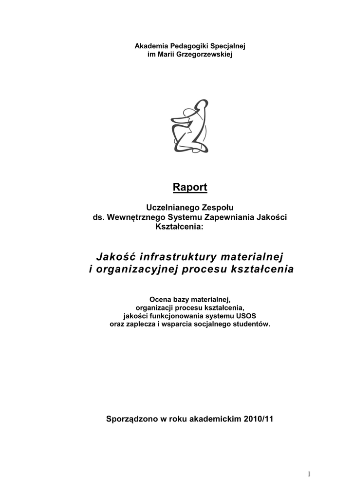 Akademia Pedagogiki Specjalnej im Marii Grzegorzewskiej Raport Uczelnianego Zespołu ds. Wewnętrznego Systemu Zapewniania Jakości Kształcenia: Jakość infrastruktury materialnej i organizacyjnej procesu kształcenia Ocena bazy materialnej, organizacji procesu kształcenia, jakości funkcjonowania systemu USOS oraz zaplecza i wsparcia socjalnego studentów. Sporządzono w roku akademickim 2010/11 1 Spis treści Wprowadzenie...............................................................................................5 Część I: Baza materialna procesu kształcenia.........................................10 1. Infrastruktura dydaktyczna i naukowa APS .................................10 1.1 Dane ilościowe i opis formalny 1.2 Ocena infrastruktury informatycznej APS – w świetle raportów samooceny zespołów zapewniania jakości 1.2.1 Baza dydaktyczna 1.2.2 Warunki lokalowe dyżurów, konsultacji i pracy nauczycieli akademickich – stan i wyposażenie ich pokoi 1.2.3 Zasoby pomocy naukowych i dydaktycznych 1.3 Wnioski i propozycje zmian 2. Infrastruktura informatyczna .........................................................21 2.1 Dane ogólne 2.2 Ocena infrastruktury informatycznej APS – w świetle raportów samooceny zespołów zapewniania jakości 2.3 Ocena strony internetowej APS – w świetle raportów samooceny 2.4 Wnioski i propozycje zmian 3. Księgozbiór oraz działalność Biblioteki Głównej APS.................27 3.1 Dane ilościowe i opis formalny działalności biblioteki 3.1.1 Stan księgozbioru i nabytków 3.1.2 Czasopisma 3.1.3 Koszty zakupu książek i czasopism 3.1.4 Charakterystyka działalności biblioteki i czytelni 3.1.5 Ruch czytelniczy 3.2 Ocena księgozbioru i działalności Biblioteki APS – w świetle raportów samooceny wydziałowych zespołów zapewniania jakości 3.3 Wnioski i propozycje zmian: 4. Baza sportowa i rekreacyjna...........................................................35 4.1 Dane ilościowe i opis formalny bazy sportowej i jej wykorzystania 4.2 Ocena bazy sportowo-rekreacynej oraz jej wykorzystania – w świetle raportu samooceny międzywydziałowego zespołu zapewniania jakości SWFiS 4.3 Wnioski i propozycje zmian 2 Część II: Organizacja procesu kształcenia w aspekcie przyjętych procedur i ich realizacji........................................................................................39 1. Procedury organizacji roku akademickiego .................................39 1.1 Organizacja roku akademickiego na wydziałach APS – aspekt formalno-prawny 1.2 Ocena organizacji roku akademickiego – w świetle raportów samooceny wydziałowych zespołów zapewniania jakości 1.3 Wnioski i propozycje zmian 2. Liczebność grup...............................................................................48 2.1 Dane ilościowe nt. grup wykładowych, ćwiczeniowych i seminaryjnych 2.2 Ocena liczebności grup wykładowych, ćwiczeniowych i seminaryjnych – w świetle raportów samooceny wydziałowych zespołów zapewniania jakości 2.3 Wnioski i propozycje zmian 3. Dogodność planu zajęć dydaktycznych........................................50 3.1 Sposób planowania zajęć 3.2. Oceny dogodności planu zajęć - w świetle raportów samooceny wydziałowych zespołów zapewniania jakości 3.3 Wnioski i propozycje zmian 4. Dogodność organizacji sesji egzaminacyjnej i poprawkowej.....53 4,1 Organizacja sesji egzaminacyjnej i poprawkowej w świetle zarządzeń dziekańskich 4.2 Organizacja sesji egzaminacyjnej i poprawkowej w świetle raportów samooceny zespołów zapewniania jakości 4.3 Wnioski i propozycje zmian 5. Kontakt z władzami dziekańskimi, nauczycielami akademickimi, pracownikami administracji.................................................................................56 5.1 Kontakty z władzami dziekańskimi, nauczycielami akademickimi (poza zajęciami dydaktycznymi) i pracownikami administracji - w świetle zarządzeń 5.2 Kontakty z władzami dziekańskimi, nauczycielami akademickimi (poza zajęciami dydaktycznymi) i pracownikami administracji - w świetle raportów samooceny zespołów zapewniania jakości 5.2.1 5.2.2 5.2.3 Kontakt z władzami dziekańskimi Kontakt z nauczycielami akademickimi poza zajęciami dydaktycznymi Kontakt z pracownikami administracji 5.3 Wnioski i propozycje zmian 3 Część III: Organizacja procesu kształcenia w ramach USOS.................65 1. Opis funkcjonowania systemu USOS w APS 2. Ocena systemu USOS w organizacji procesu kształcenia w świetle Raportów Zespołów Jakości 2.1 Zasób, czytelność i terminowość informacji w systemie USOS w świetle Raportów 2.2 Funkcjonalność USOS dla zapisów na seminaria i fakultety w ocenie studentów w świetle Raportu Zespołu WNP 2.3 Możliwości uzyskiwania ocen jakości zajęć w systemie USOS 3 Wnioski i propozycje zmian Część IV: Zaplecze socjalno-bytowe i wsparcie materialne studentów...............................................................................................................75 1. Zaplecze socjalne.............................................................................75 1.1 Charakterystyka zaplecza socjalnego 1.2 Ocena zaplecza socjalnego – w świetle raportów samooceny wydziałowych zespołów zapewniania jakości 1. 2.1 Bufety 1.2.2 Warunki spędzania przerw między zajęciami 1.2.3 Toalety i zaplecze sanitarne 1.2.4 Funkcjonowanie szatni i recepcji w budynku C 1.3 Wnioski i propozycje zmian 2. Pomoc socjalna studentom............................................................81 2.1 Fundusz stypendialny i zapomogowy 2.1.1 Podstawy prawne oraz rodzaje wsparcia materialnego studentów 2.1.2 Ogólne zasady przyznawania oraz wysokość stypendiów. 2.1.3 Udzielona pomoc stypendialna w roku akademickim 2010/11. 2.1.4 Stypendia specjalne dla studentów z niepełnosprawnościami 2.1.5 Zapomogi 2.1.6 Stypendium ministra za wyniki w nauce i wybitne osiągnięcia w sporcie 2.2 Akademiki – wysokość o