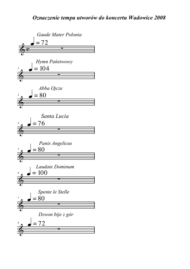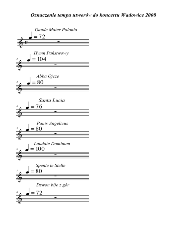 Oznaczenie tempa utworów do koncertu Wadowice 2008 Gaude Mater Polonia &c q = 72 ∑ Hymn Państwowy 2 & q = 104 ∑ Abba Ojcze 3 & q = 80 ∑ Santa Lucia 4 & q = 76 ∑ Panis Angelicus 5 & q = 80 ∑ Laudate Dominum 6 & q = 100 ∑ Spente le Stelle 7 & q = 80 ∑ Dzwon bije z gór 8 & q = 72 ∑ 2 Nabucco 9 & q = 58 ∑ Święta Noc 10 & q = 80 ∑ One Moment in Time 11 & q = 80 ∑ Mazurek 3-go Maja 12 & q = 100 ∑ Marsz StraŜaków 13 & q = 104 ∑ Time to Say Goodbye 14 & h = 60 ∑ Czarna Madonno 15 & q. = 66 ∑ Miasto Wadowice 16 & q. = 76 ∑