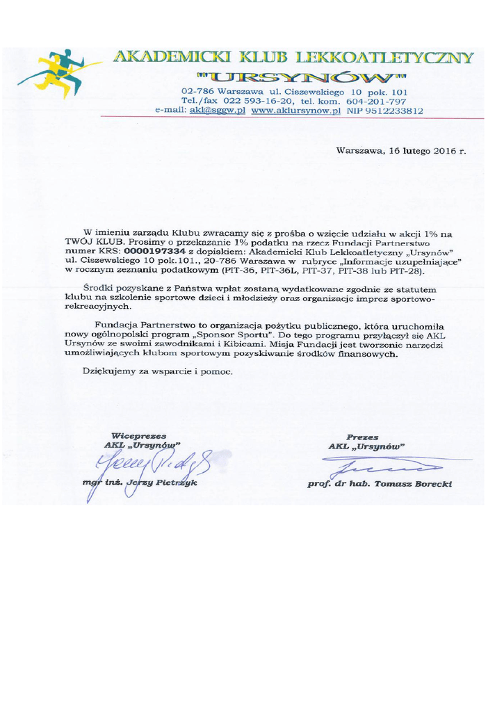 ORGANIZACJA POŻYTKU PUBLICZNEGO Fundacja Partnerstwo 1% na TWÓJ KLUB Fundacja Partnerstwo uprzejmie informuje, iż po raz szósty uruchamia akcję wpłat 1% podatku dochodowego na rozwój sportu wśród młodzieży. Naszym celem jest popularyzacja wszystkich rodzajów sportu wśród młodzieży, dlatego też zachęcamy Państwa do współpracy, dzięki której Akademicki Klub Lekkoatletyczny „Ursynów” środki finansowe na rozwój fizyczny naszej młodzieży. W myśl przepisów 1% podatku dochodowego za 2015 r. na rzecz organizacji pożytku publicznego jaką jest Fundacja Partnerstwo mogą przekazać: - podatnicy podatku dochodowego od osób fizycznych, - podatnicy opodatkowani ryczałtem od przychodów ewidencjonowanych, - podatnicy prowadzący jednoosobową działalność gospodarczą i korzystający z liniowej, 19-procentowej stawki podatku. Aby przekazać 1% podatku należy wypełnić w sposób prezentowany poniżej odpowiednią rubrykę w rocznym zeznaniu podatkowym (PIT-36,PIT -36L, PIT-37, PIT 38, lub PIT-28) podając : - numer KRS: 0000197334 WAŻNE! Podatnik w składanym zeznaniu podatkowym może podać dodatkowe informacje, które w jego ocenie mogą mieć wpływ na rozdysponowanie pieniędzy z 1% przez Fundację Partnerstwo tj. wskazać konkretny cel - wpisać nazwę klubu sportowego i adres. Przeznaczona jest na to specjalna rubryka „Informacje uzupełniające” .Informacje te zostaną przesłane organizacji pożytku publicznego jako uszczegółowienie przekazanych kwot. Podatnik ma prawo wyrazić zgodę na podanie swych danych osobowych (imienia, nazwiska oraz adresu). Informacje te przekazuje urząd skarbowy. Zgodę podatnik wyraża w formularzu PIT, zakreślając odpowiednią rubrykę . H. WNIOSEK O PRZEKAZANIE 1% PODATKU NALEŻNEGO NA RZECZ ORGANIZACJI POŻYTKU PUBLICZNEGO (OPP) Należy podać numer wpisu do Krajowego Rejestru Sądowego (Numer KRS)organizacji wybranej z wykazu oraz wysokość kwoty na jej rzecz. 124. Numer KRS 0000197334 Wnioskowana kwota 125. Kwota z poz. 126 nie może przekroczyć 1% kwoty z poz. 112 po zaokrągleniu do pełnych dziesiątek groszy w dół. zł. gr. I.INFORMACJE UZUPEŁNIAJĄCE Podatnicy, którzy wypełnili część H, w poz. 126 mogą podać cel szczegółowy 1%., a zaznaczając kwadrat w pozycji 127 wyrazić zgodę na przekazanie OPP swojego imienia , nazwiska In adresu wraz z informacją o kwocie z poz. 125. W pozycji 128 można podać dodatkowo informację, np. ułatwiające kontakt z podatnikiem (telefon, e-mail). 126. Cel szczegółowy 1% Akademicki Klub Lekkoatletyczny „Ursynów” ul. Ciszewskiego 10,pok.101; 02-786 Warszawa 127 Wyrażam zgodę 128.. X Urząd Skarbowy w terminie do 3 miesięcy przekaże 1% podatku należnego na konto Fundacji, a z kolei Fundacja przekaże 100% środków w formie umowy darowizny na rzecz klubów wskazanych przez darczyńców. Szczegóły na http://www.sponsorsportu.pl ORGANIZACJA POŻYTKU PUBLICZNEGO FUNDACJA PARTNERSTWO 01-423 Warszawa Al. Prymasa Tysiąclecia 76F, tel.+48 22 2010525 fax. +48 22 2010526 e-mail: [email protected] http://www.partnerstwo.pl 015693780 KRS: 0000197334 Regon: