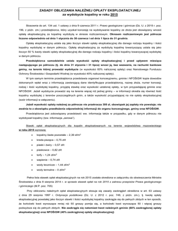ZASADY OBLICZANIA NALEŻNEJ OPŁATY EKSPLOATACYJNEJ za wydobycie kopaliny w roku 2015 Stosownie do art. 134 ust. 1 ustawy z dnia 9 czerwca 2011 r. Prawo geologiczne i górnicze (Dz. U. z 2015 r. poz. 196, z późn. zm.) przedsiębiorca, który uzyskał koncesję na wydobywanie kopaliny ze złoża jest obowiązany wnosić opłatę eksploatacyjną za kopalinę wydobytą w okresie rozliczeniowym. Okresem rozliczeniowym jest półrocze liczone odpowiednio od dnia 1 stycznia do 30 czerwca i od dnia 1 lipca do 31 grudnia. Opłatę eksploatacyjną ustala się jako iloczyn stawki opłaty eksploatacyjnej dla danego rodzaju kopaliny i ilości kopaliny wydobytej w danym półroczu. Opłatę eksploatacyjną za wydobytą kopalinę towarzyszącą ustala się jako iloczyn 50 % kwoty stawki opłaty eksploatacyjnej dla danego rodzaju kopaliny i ilości kopaliny towarzyszącej wydobytej w danym półroczu. Przedsiębiorca samodzielnie ustala wysokość opłaty eksploatacyjnej i przed upływem miesiąca następującego po półroczu (tj. do dnia 31 stycznia i 31 lipca) wnosi ją, bez wezwania, na rachunki bankowe gminy, na terenie której prowadzi wydobycie (w wysokości 60% naliczonej opłaty) oraz Narodowego Funduszu Ochrony Środowiska i Gospodarki Wodnej (w wysokości 40% naliczonej opłaty). W tym samym terminie przedsiębiorca przedstawia organowi koncesyjnemu, gminie i NFOŚiGW kopie dowodów dokonanych wpłat wraz z informacją zawierającą dane identyfikujące przedsiębiorcę, nazwę złoża, numer koncesji, rodzaj i ilość wydobytej kopaliny, przyjętą stawkę oraz wysokość ustalonej opłaty, w tym przypadającej gminie oraz NFOŚiGW. Jeżeli wydobycie prowadzi się na terenie więcej niż jednej gminy – w informacji określa się również ilość kopaliny wydobytej z terenów poszczególnych gmin, a także wysokość przypadającej na nie opłaty eksploatacyjnej (wzór informacji w załączeniu). Jeżeli wysokość opłaty należnej za półrocze nie przekracza 300 zł, obowiązek jej zapłaty nie powstaje; nie zwalnia to z obowiązku przedłożenia odpowiedniej informacji do organu koncesyjnego, gminy oraz NFOŚiGW. Przedsiębiorca jest zobowiązany przedstawić ww. informację także w przypadku, gdy w danym półroczu nie wydobywał kopaliny (tzw. informacja „zerowa”). Stawki opłat eksploatacyjnych dla kopalin eksploatowanych na terenie województwa mazowieckiego w roku 2015 wynoszą: kopaliny ilaste pozostałe – 2,39 zł/m3 kreda pisząca – 0,75 zł/t piaski i żwiry – 0,57 zł/t piaskowce – 0,82 zł/t torfy – 1,24 zł/m3 wapienie – 0,74 zł/t wody lecznicze – 1,44 zł/m3 wody termalne – 0 zł/m3 Pełna lista stawek opłat eksploatacyjnych na rok 2015 została określona w załączniku do obwieszczenia Ministra Środowiska z dnia 8 sierpnia 2014 r. w sprawie stawek opłat na rok 2015 z zakresu przepisów Prawa geologicznego i górniczego (M.P. poz. 705) Przy obliczaniu należnych opłat eksploatacyjnych stosuje się zasady zaokrągleń określone w art. 63 ustawy z dnia 29 sierpnia 1997 r. Ordynacja podatkowa (Dz. U. z 2012 r. poz. 749, z późn. zm.), tj. kwotę opłaty eksploatacyjnej powstałej jako iloczyn stawki i ilości wydobytej kopaliny zaokrągla się do pełnych złotych w ten sposób, że końcówki kwot wynoszące mniej niż 50 groszy pomija się, a końcówki kwot wynoszące 50 i więcej groszy podwyższa się do pełnych złotych. Nie zaokrągla się natomiast kwot należnych gminie (60% zaokrąglonej opłaty eksploatacyjnej) oraz NFOŚiGW (40% zaokrąglonej opłaty eksploatacyjnej) Przykład: Ilość wydobytej kopaliny – 7 841 ton Rodzaj kopaliny – piaski Stawka opłaty eksploatacyjnej – 0,57 zł/t Wysokość opłaty eksploatacyjnej: 7 841 t x 0,57 zł/t = 4.469,37 zł -> po zaokrągleniu 4.469 zł, z czego: Kwota należna gminie: 60 % x 4.469 zł = 2.681,40 zł Kwota należna NFOŚiGW: 40 % x 4.469 zł = 1.787,60 zł Dane rachunku gminy, na terenie której prowadzone jest wydobycie należy uzyskać we właściwym urzędzie gminy. Rachunek, na który należy uiszczać część opłaty eksploatacyjnej należnej NFOŚiGW: Narodowy Fundusz Ochrony Środowiska i Gospodarki Wodnej 02-673 Warszawa, ul. Konstruktorska 3a nr konta: BGK III o/Warszawa – 92 1130 1062 0000 0109 9520 0013 W tytule wpłat należy zamieścić adnotację: „opłata eksploatacyjna za wydobycie kopaliny ze złoża ……….………. w ………….. półroczu. ………….. r.” (nazwa złoża) (półrocze) (rok)