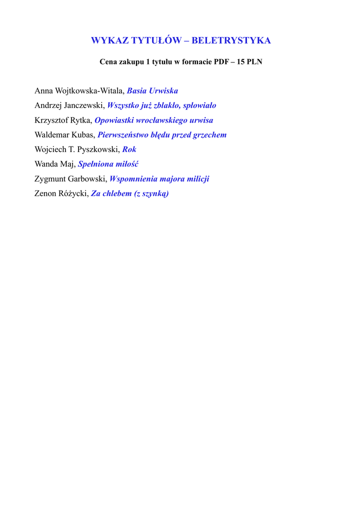WYKAZ TYTUŁÓW – BELETRYSTYKA Cena zakupu 1 tytułu w formacie PDF – 15 PLN Anna Wojtkowska-Witala, Basia Urwiska Andrzej Janczewski, Wszystko już zblakło, spłowiało Krzysztof Rytka, Opowiastki wrocławskiego urwisa Waldemar Kubas, Pierwszeństwo błędu przed grzechem Wojciech T. Pyszkowski, Rok Wanda Maj, Spełniona miłość Zygmunt Garbowski, Wspomnienia majora milicji Zenon Różycki, Za chlebem (z szynką)
