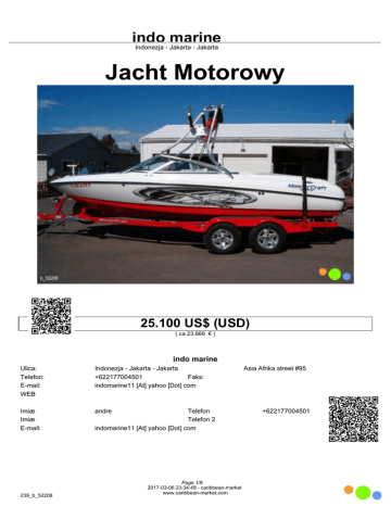 indo marine Indonezja - Jakarta - Jakarta Jacht Motorowy Poùoýenie obiektu : Indonezja - Jakarta - Jakarta 25.100 US$ (USD) ( ca 23.669 € ) indo marine Ulica: Telefon: E-mail: WEB Indonezja - Jakarta - Jakarta +622177004501 Faks: indomarine11 [At] yahoo [Dot] com Imiæ Imiæ E-mail: andre 239_b_52208 Telefon Telefon 2 indomarine11 [At] yahoo [Dot] com Page 1/6 2017-03-06 23:34:49 - caribbean-market www.caribbean-market.com Asia Afrika street #95 +622177004501 indo marine Indonezja - Jakarta - Jakarta Typ ùodzi Numer kodu Typ ùodzi Producent: Model Designer Stan Materiaù Olinowanie Rok Kolor Dùugoúã LOA Dùugoúã LWL Wysokoúã pomieszczeñ Waga 239_b_52208 Jacht Motorowy Master Craft X-10 WAKEBOARD Numer kodu Zgùoú CSF Ksztaùt kadùuba Kokpit Naprawianych roku Kontrola Szerokoúã Szkic 2003 21,00 ft ( 6,4 m ) 8,00 ft ( 2,4 m ) Waga (Ballast) Dane na temat silnika - Napædy Silnik gùówny Prowadziã Wydajnoúã Rok Propeller Proste Indmar Model Paliwo: 350,0 HP( 261 KW ) Godziny otwarcia Prædkoúã maksymalna Tankdaten Iloúã paliwa Woda Kanalizacja 239_b_52208 Page 2/6 2017-03-06 23:34:49 - caribbean-market www.caribbean-market.com V-Drive indo marine Indonezja - Jakarta - Jakarta Sprzæt Okræty Instruments Zaloguj Compass GPS Anemometr Scoreboard Sonar Radar Ploter NavText Fax Pogoda VHF Radio SSB Pactor El Autopilot Wiatr Kontroli Fishfinder AIS Komputer Wyposaýenie techniczne Odtwarzacz CD Radio Telewizja Ùàcznoúã satelitarna Systemu 12 V DC Systemu 24 V DC Ùadowarka Solar Cells Wiatr Generator Wave Generator Generator 110-220 V Invertor 110-220 V Moc Shore Ogrzewanie Klimatyzacja Druckwasseranlage Systemu ciepùej wody Gazowniæ Watermaker Ster strumieniowy Divecompressor Bilgepump elektrycznie Bilgepump Maunel 239_b_52208 Urzadzenie & podzial Kabiny Koje Toalety Zùy Wùaúciciele kabiny Spiýarnia Zatopiã Kuchenka gazowa Kuchenka elektryczna Piec Benzyna Piekarnik gazowy Piekarnik Elektryczny Lodówka Zamraýarka Kuchenka mikrofalowa Zmywarka Pralnia Bezpieczeñstwo Kamizelki ratunkowe Liferaft EPRIB Szperacze System Gaúnice Page 3/6 2017-03-06 23:34:49 - caribbean-market www.caribbean-market.com Boat Equipment Anchor Winda kotwiczna Teak Kàpieliska Ladder Prysznic rufowy Rack Equipment Trap Daivits Davit Ùódki Ùódki m. AB Bukszpryt Trim Tabs Wyposaýenie wnætrz Flybridge 2. Helm na lot Boat Trailer Inne dodatki Szyber dach Hafenpersenning Latajàcy most Ganzpersenning Cieñ niedz Fly Markiza na rufie pokùad Bimini Sprayhood indo marine Indonezja - Jakarta - Jakarta 239_b_52208 Page 4/6 2017-03-06 23:34:49 - caribbean-market www.caribbean-market.com indo marine Indonezja - Jakarta - Jakarta 239_b_52208 Page 5/6 2017-03-06 23:34:49 - caribbean-market www.caribbean-market.com indo marine Indonezja - Jakarta - Jakarta 239_b_52208 Page 6/6 2017-03-06 23:34:49 - caribbean-market www.caribbean-market.com