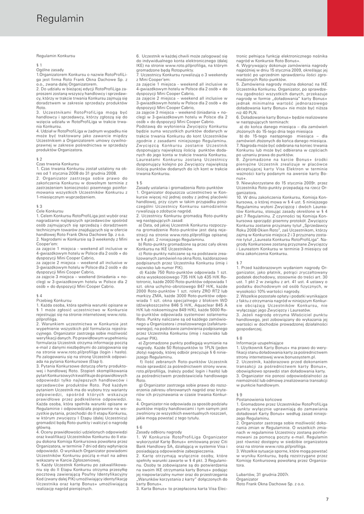 Regulamin Regulamin Konkursu §1 Ogólne zasady 1.Organizatorem Konkursu o nazwie RotoProfiLiga jest firma Roto Frank Okna Dachowe Sp. z o.o., zwana dalej Organizatorem. 2. Do udziału w bieżącej edycji RotoProfiLiga zaproszeni zostaną wszyscy handlowcy i sprzedawcy, którzy w trakcie trwania Konkursu zajmują się doradztwem w zakresie sprzedaży produktów Roto. 3. Uc ze s t nik ami RotoP r of iL i g a mo g ą być handlowcy i sprzedawcy, którzy zgłoszą się do wzięcia udziału w RotoProfiLiga w trakcie trwania Konkursu. 4. Udział w RotoProfiLiga w żadnym wypadku nie może być trak towany jako zawarcie między Uczestnikiem a Organizatorem umowy cywilnoprawnej w zakresie pośrednictwa w sprzedaży produktów Organizatora. §2 Czas trwania Konkursu 1. Czas trwania Konkursu został ustalony na okres od 1 stycznia 2008 do 31 grudnia 2008. 2. O rg aniz ator z as tr ze g a sobie pr awo do zakończenia Konkursu w dowolnym terminie z zastrzeżeniem konieczności pisemnego poinformowania wszystkich Uczestników Konkursu z 1-miesięcznym wyprzedzeniem. §3 Cele Konkursu 1. Celem Konkursu RotoProfiLiga jest wybór oraz nagradzanie najlepszych sprzedawców spośród osób zajmujących się sprzedażą i doradztwem technicznym towarów znajdujących się w ofercie handlowej Roto Frank Okna Dachowe Sp. z o.o. 2. Nagrodami w Konkursie są 3 weekendy z Mini Cooper’em: za zajęcie 1 miejsca - weekend all inclusive w 4-gwiazdkowym hotelu w Polsce dla 2 osób + do dyspozycji Mini Cooper Cabrio, za zajęcie 2 miejsca – weekend all inclusive w 3-gwiazdkowym hotelu w Polsce dla 2 osób + do dyspozycji Mini Cooper Cabrio, za zajęcie 3 miejsca – weekend (śniadania + nocleg) w 3-gwiazdkowym hotelu w Polsce dla 2 osób + do dyspozycji Mini Cooper Cabrio. §4 Przebieg Konkursu 1. Każda osoba, która spełnia warunki opisane w § 1 może zgłosić uczestnictwo w Konkursie rejestrując się na stronie internetowej www.roto. pl/profiliga. 2. Warunkiem uczestnictwa w Konkursie jest wypełnienie wszystkich pól formularza rejestracyjnego. Organizator zastrzega sobie możliwość weryfikacji danych. Po prawidłowym wypełnieniu formularza Uczestnik otrzyma informację pocztą e-mail z danymi niezbędnymi do zalogowania się na stronie www.roto.pl/profiliga (login i hasło). Po zalogowaniu się na stronę Uczestnik odpowiada na pytania Konkursowe (Etap I). 3. Pytania Konkursowe dotyczą oferty produktowej i handlowej Roto. Stopień skomplikowania pytań Konkursowych kwalifikuje do prawidłowych odpowiedzi tylko najlepszych handlowców i sprzedawców produktów Roto. Pod każdym pytaniem Uczestnik ma do wyboru trzy warianty odpowiedzi, spośród k tór ych wskazuje prawidłowe przez podkreślenie odpowiedzi. Każda osoba, która spełniła warunki opisane w Regulaminie i odpowiedziała poprawnie na wszystkie pytania, przechodzi do II etapu Konkursu, w którym zwycięzcy I Etapu (dalej Uczestnicy) gromadzić będą Roto-punkty i walczyć o nagrodę główną. 4. Oceny prawidłowości udzielonych odpowiedzi oraz kwalifikacji Uczestników Konkursu do II etapu dokona Komisja Konkursowa powołana przez Organizatora, w terminie 7 dni od daty wpłynięcia odpowiedzi. O wynikach Organizator powiadomi Uczestników Konkursu pocztą e-mail na adres wskazany w Karcie Zgłoszeniowej. 5. Każdy Uczestnik Konkursu po zakwalifikowaniu się do II Etapu Konkursu otrzyma przesyłkę pocztową zawierającą Poufny Identyfikacyjny Kod (zwany dalej PIK) umożliwiający identyfikację Uczestnika oraz kar tę Bonus+ umożliwiającą realizację nagród pieniężnych. 6. Uczestnik w każdej chwili może zalogować się do indywidualnego konta elektronicznego (dalej IKE) na stronie www.roto.pl/profiliga, na którym gromadzone będą Rotopunkty. 7. Uczestnicy Konkursu rywalizują o 3 weekendy z Mini Cooper’em: za zajęcie 1 miejsca - weekend all inclusive w 4-gwiazdkowym hotelu w Polsce dla 2 osób + do dyspozycji Mini Cooper Cabrio, za zajęcie 2 miejsca – weekend all inclusive w 3-gwiazdkowym hotelu w Polsce dla 2 osób + do dyspozycji Mini Cooper Cabrio, za zajęcie 3 miejsca – weekend (śniadania + nocleg) w 3-gwiazdkowym hotelu w Polsce dla 2 osób + do dyspozycji Mini Cooper Cabrio. Podstawą do wyłonienia Zwycięzcy Konkursu będzie suma wszystkich punktów dodanych w trakcie trwania Konkursu do kont Uczestników zgodnie z zasadami niniejszego Regulaminu. Zw y c i ę z c ą K o n k u r s u z o s t a n i e U c z e s t n i k dysponujący największą ilością punktów dodanych do jego konta w trakcie trwania Konkursu. L aur e at ami Ko nkur su zo s t an ą Uc ze s tni c y dysponujący kolejno po Zwycięzcy największą ilością punktów dodanych do ich kont w trakcie trwania Konkursu. §5 Zasady ustalania i gromadzenia Roto-punktów 1. Organizator dopuszcza uczestnictwo w Konkursie więcej niż jednej osoby z jednej placówki handlowej, przy czym w takim przypadku poszczególni Uczestnicy Konkursu samodzielnie rywalizują o zdobycie nagród. 2. Uczestnicy Konkursu gromadzą Roto-punkty wg następujących zasad: a) Data, od jakiej Uczestnik Konkursu rozpoczyna gromadzenie Roto-punktów jest datą rejestracji na stronie www.roto.pl/profiliga opisanej w § 4 pkt. 2 niniejszego Regulaminu. b) Roto-punkty gromadzone są przez cały okres Konkursu na IKE Uczestników. c) Roto-punkty naliczane są na podstawie zrealizowanych zamówień na okna Roto, każdorazowo podpisanych przez Uczestnika Konkursu (imię i nazwisko lub numer PIK). d) Każde 750 Roto-punktów odpowiada 1 szt. okna wysokoosiowego 735 H/K lub 435 H/K Rototronic, każde 2000 Roto-punktów odpowiada 1 szt. okna uchylno-obrotowego 847 H/K, każde 2000 Roto-punktów 1 szt. rolety ZRO RT2 lub markizy ZMA, każde 3000 Roto-punktów odpowiada 1 szt. okna specjalnego z blokiem WD (dźwiękoszczelne 846 S H/K, Aquaclear 845 A H/K lub niskoemisyjne 849 H/K), każde 5000 Roto-punktów odpowiada systemowi solarnemu Roto. Punkty naliczane są od każdego zamówionego 