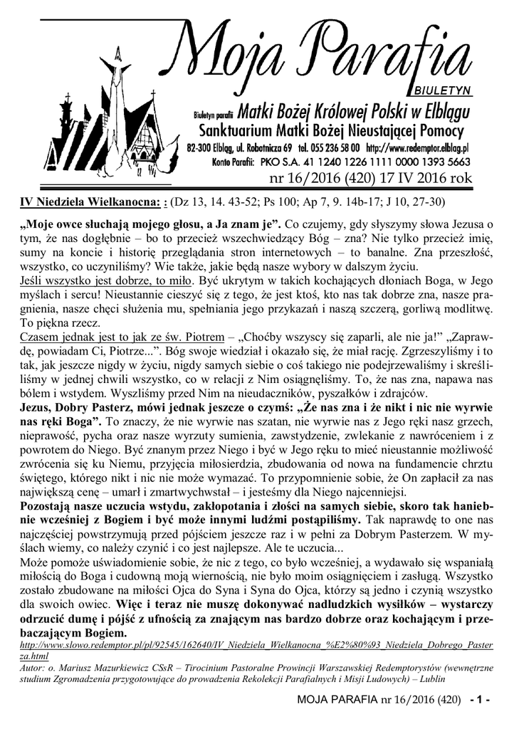 nr 16/2016 (420) 17 IV 2016 rok I IV Niedziela Wielkanocna: : (Dz 13, 14. 43-52; Ps 100; Ap 7, 9. 14b-17; J 10, 27-30) „Moje owce słuchają mojego głosu, a Ja znam je”. Co czujemy, gdy słyszymy słowa Jezusa o tym, że nas dogłębnie – bo to przecież wszechwiedzący Bóg – zna? Nie tylko przecież imię, sumy na koncie i historię przeglądania stron internetowych – to banalne. Zna przeszłość, wszystko, co uczyniliśmy? Wie także, jakie będą nasze wybory w dalszym życiu. Jeśli wszystko jest dobrze, to miło. Być ukrytym w takich kochających dłoniach Boga, w Jego myślach i sercu! Nieustannie cieszyć się z tego, że jest ktoś, kto nas tak dobrze zna, nasze pragnienia, nasze chęci służenia mu, spełniania jego przykazań i naszą szczerą, gorliwą modlitwę. To piękna rzecz. Czasem jednak jest to jak ze św. Piotrem – „Choćby wszyscy się zaparli, ale nie ja!” „Zaprawdę, powiadam Ci, Piotrze...”. Bóg swoje wiedział i okazało się, że miał rację. Zgrzeszyliśmy i to tak, jak jeszcze nigdy w życiu, nigdy samych siebie o coś takiego nie podejrzewaliśmy i skreśliliśmy w jednej chwili wszystko, co w relacji z Nim osiągnęliśmy. To, że nas zna, napawa nas bólem i wstydem. Wyszliśmy przed Nim na nieudaczników, pyszałków i zdrajców. Jezus, Dobry Pasterz, mówi jednak jeszcze o czymś: „Że nas zna i że nikt i nic nie wyrwie nas ręki Boga”. To znaczy, że nie wyrwie nas szatan, nie wyrwie nas z Jego ręki nasz grzech, nieprawość, pycha oraz nasze wyrzuty sumienia, zawstydzenie, zwlekanie z nawróceniem i z powrotem do Niego. Być znanym przez Niego i być w Jego ręku to mieć nieustannie możliwość zwrócenia się ku Niemu, przyjęcia miłosierdzia, zbudowania od nowa na fundamencie chrztu świętego, którego nikt i nic nie może wymazać. To przypomnienie sobie, że On zapłacił za nas największą cenę – umarł i zmartwychwstał – i jesteśmy dla Niego najcenniejsi. Pozostają nasze uczucia wstydu, zakłopotania i złości na samych siebie, skoro tak haniebnie wcześniej z Bogiem i być może innymi ludźmi postąpiliśmy. Tak naprawdę to one nas najczęściej powstrzymują przed pójściem jeszcze raz i w pełni za Dobrym Pasterzem. W myślach wiemy, co należy czynić i co jest najlepsze. Ale te uczucia... Może pomoże uświadomienie sobie, że nic z tego, co było wcześniej, a wydawało się wspaniałą miłością do Boga i cudowną moją wiernością, nie było moim osiągnięciem i zasługą. Wszystko zostało zbudowane na miłości Ojca do Syna i Syna do Ojca, którzy są jedno i czynią wszystko dla swoich owiec. Więc i teraz nie muszę dokonywać nadludzkich wysiłków – wystarczy odrzucić dumę i pójść z ufnością za znającym nas bardzo dobrze oraz kochającym i przebaczającym Bogiem. http://www.slowo.redemptor.pl/pl/92545/162640/IV_Niedziela_Wielkanocna_%E2%80%93_Niedziela_Dobrego_Paster za.html Autor: o. Mariusz Mazurkiewicz CSsR – Tirocinium Pastoralne Prowincji Warszawskiej Redemptorystów (wewnętrzne studium Zgromadzenia przygotowujące do prowadzenia Rekolekcji Parafialnych i Misji Ludowych) – Lublin MOJA PARAFIA nr 16/2016 (420) - 1 - Jubileusz 150-lecia przywrócenia do kultu publicznego Ikony Matki Bożej Nieustającej 17 kwietnia (niedziela) – godz. 13:00 - Pielgrzymka Czcicieli Miłosierdzia Bożego 18 kwietnia (poniedziałek) – Pielgrzymka Rodziny Radia Maryja z Elbląga i Diecezji elbląskiej godz. 17:30 Nowennie do MBNP i Mszy św. przewodniczy Ojciec z Radia Maryja 19 kwietnia (wtorek) – Pielgrzymka studentów, młodzieży i dzieci oraz Czcicieli Matki Bożej Nieustającej Pomocy godz. 17:30 Nowennie do MBNP i Mszy św. przewodniczy ks. Piotr Bryk, rektor Kościoła Bożego Ciała w Elblągu i Diecezjalny Duszpasterz Akademicki 20 kwietnia (środa) – Pielgrzymka Wspólnot Odnowy w Duchu Świętym i Czcicieli św. Michała Archanioła godz. 17:30 Nowennie do MBNP i Mszy św. przewodniczy ks. dr Mariusz Klimkowski, dyrektor Wydziału Nauki Katolickiej Kurii Diecezjalnej Elbląskiej 21 kwietnia (czwartek) – Pielgrzymka Wspólnot Krwi Chrystusa godz. 17:30 Nowennie do MBNP i Mszy św. przewodniczy Ks. Kanonik Zdzisław Bieg, kanclerz Kurii Diecezjalnej Elbląskiej godz. 19:00 Msza św. dla modlących się o dobrą żonę i dobrego męża. 22 kwietnia (piątek) –Pielgrzymka Wspólnot Arcybractwa Honorowej Straży Najświętszego Serca Pana Jezusa godz. 17:30 Nowennie do MBNP i Mszy św. przewodniczy ks. Prałat kanonik Stanisław Błaszkowski, proboszcz parafii św. Mikołaja w Elblągu 23 kwietnia (sobota) – Pielgrzymka rodzin godz. 11:00 Nowennie do MBNP i Mszy św. przewodniczy ks. Józef Miciński, proboszcz parafii św. Urszuli Ledóchowskiej w Malborku, diecezjalny moderator Ruchu „Domowego Kościoła” 24 kwietnia (niedziela) Pielgrzymka wdów, wdowców i osób samotnych godz. 13:00 Nowennie do MBNP i Mszy św. przewodniczy – O. Sławomir Podlach CSsR, Przełożony Wspólnoty Domu Zakonnego Redemptorystów w Elblągu 25 kwietnia (poniedziałek) – Pielgrzymka Róż Różańcowych godz. 17:30 Nowennie do MBNP i Mszy św. przewodniczy ks. Walenty Szymański, Wikariusz Generalny 26 kwietnia (wtorek) – Pielgrzymka parafian z kościołów Matki Bożej Nieustającej Pomocy z diecezji elbląskiej Pielgrzymka osób konsekrowanych, Księży diecezjalnych oraz wszystkich Czcicieli Matki Bożej Nieustającej Pomocy godz. 17:30 Nowennie do MBNP i Mszy św. przewodniczy Ks. Bp Jan Styrna Zapraszają Redemptoryści MOJA PARAFIA nr 16/2016 (420) Do użytku wewnętrznego - 2 - 7:00 8:00 18:00 Karmel 7:00 8:00 18:00 Karmel 7:00 8:00 18:00 Karmel 7:00 8:00 18:00 19:00 Karmel 7:00 8:00 18:00 Karmel 7:00 8:00 11:00 18:00 Karmel 7:00 8:30 10:00 11:30 13:00 16:30 18:30 Karmel INTENCJE MSZALNE Dz 11,1-18; Ps 42,2-3; 43,3-4; J 10,14; J 10,1-10 Poniedziałek 18.04 1. + Bernard Kulpa (gr.9); 2. + Maria Pacler i zm. z rodziny 1. + Władysława Stefanowicz; 2. + Leszek Soszy