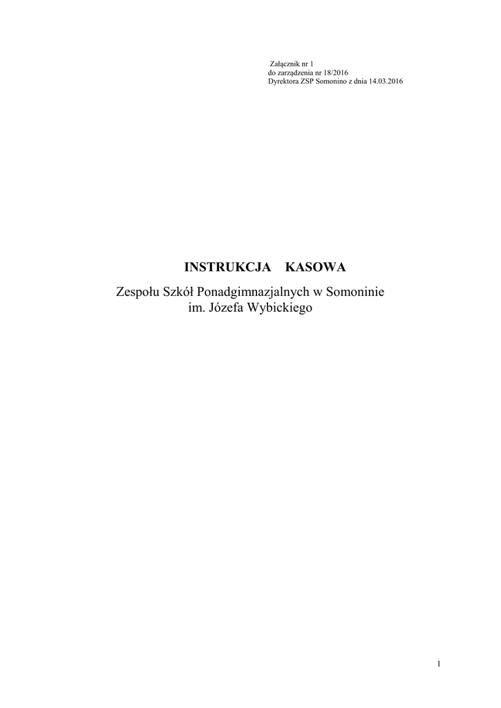 Załącznik nr 1 do zarządzenia nr 18/2016 Dyrektora ZSP Somonino z dnia 14.03.2016 INSTRUKCJA KASOWA Zespołu Szkół Ponadgimnazjalnych w Somoninie im. Józefa Wybickiego 1 CZĘŚĆ I OGÓLNA 1. Instrukcja kasowa została opracowana na podstawie przepisów ustawy z dnia 29 września 1994 r. o rachunkowości ( Dz. U. Rok 2013 poz.330 z późn. zm.). 2. Instrukcja ustala jednolite zasady gospodarki kasowej w Zespole Szkól Ponadgimnazjalnych w Somoninie im. Józefa Wybickiego 3. Zawarte w instrukcji zasady i postanowienia dotyczą kasjera i pracowników uczestniczących w kontroli funkcjonowania kasy w ramach ich imiennych zakresach czynności . CZĘŚĆ II SZCZEGÓŁOWA § 1 POMIESZCZENIA KASY 1. Kasa powinna być zlokalizowana w miejscu gwarantującym bezpieczeństwo obrotu , a także umożliwiającym sprawne jej funkcjonowanie . 2. Pomieszczenie kasy nie jest wydzielone i znajduje się w sekretariacie szkoły, drzwi wejściowe zamykane na dwa zamki oraz pomieszczenie wyposażone w urządzenia alarmowe. 3. Kasa jest wyposażona w szafę stalową do przechowywania środków pieniężnych . § 2 OCHRONA KASY 1. W kasie mogą być przechowywane środki pieniężne w wysokości zapewniającej właściwą ochronę . 2 2. W kasie mogą być przechowywane : - Czeki gotówkowe które, są formą realizowania obrotu bezgotówkowego. - Czek jest drukiem ścisłego zarachowania. - Czek gotówkowy jest dokumentem, w którym wystawca zawiera polecenie do banku, wypłacenie kwoty, na którą opiewa czek osobie wskazanej na czeku. - Nie dozwolone są żadne poprawki dokonywane na czeku. W razie popełnienia pomyłki w jego wypełnianiu, blankiet danego czeku należy anulować. 3. Jednostka obliczeniowa to jednostka określająca dopuszczalny limit stale lub jednorazowo przechowywanych i transportowanych wartości pieniężnych. Wynosi ona 120 krotność przeciętnego miesięcznego wynagrodzenia za ubiegły kwartał . §3 TRANSPORT ŚRODKÓW PIENIĘŻNYCH 1. Kasjer może pieszo lub samochodem przewozić z banku środki pieniężne do wysokości 0,3 jednostki obliczeniowej (Załącznik nr 2,3,4 ) 2. W przypadki przewożenia kwoty wyższej niż 5 jednostek obliczeniowych ochronę transportu należy zlecić wyspecjalizowanej firmie . §4 KASJER 1. Kasjerem może być osoba : a) posiadająca minimum średnie wykształcenie , b) nie karana za przestępstwa gospodarcze lub wykroczenia przeciwko mieniu , c) posiadająca nienaganną opinię , d) posiadająca pełną zdolność do czynności prawnych , 2. Przyjęcie – przekazanie kasy może nastąpić tylko w drodze protokolarnej , w obecności komisji wyznaczonej przez kierownika jednostki . 3 3. Kasjer zobowiązany jest do podpisania oświadczenia o przyjęciu materialnej odpowiedzialności za powierzone mienie oraz o znajomości przepisów w zakresie gospodarki kasowej . § 5 GOSPODARKA KASOWA 1. W kasie może znajdować się : a) gotówka podjęta z banku na określone rodzaje wydatków , b) gotówka pochodząca z bieżących wpływów do kasy. 2. Gotówka podjęta z rachunku bankowego na pokrycie określonych rodzajów wydatków powinna być wydatkowana na cel określony przy pobraniu . 3. Gotówka podjęta z rachunku bankowego jednostki na pokrycie określonych wydatków a nie zrealizowanych w danym dniu może być przechowywana w kasie przez 3 dni , pod warunkiem należytego jej zabezpieczenia . § 6 DOKUMENTACJA KASOWA 1. Dokumentację kasy stanowią : a) dokumenty operacyjne kasy : - raport kasowy „ RK” , - dowody wypłaty - czek gotówkowy - bankowy dowód wpłaty b) dokumenty źródłowe lub dyspozycyjne : - dowody zakupu – faktury , rachunki , - wnioski o zaliczkę, - rozliczenie zaliczki, - rozliczenie delegacji służbowej, - lista płac, - lista wypłat zasiłków, - rachunki umów; zlecenia, o dzieło itp., - inne akceptowane przez głównego księgowego ; c) dokumenty organizacyjne kasy: 4 - instrukcja kasowa, oświadczenie o odpowiedzialności materialnej, zakres czynności kasjera, protokół przyjęcia-przekazanie kasy, protokół inwentaryzacyjny. 2. Wszystkie obroty gotówkowe powinny być udokumentowane dowodami kasowymi: - wpłaty gotówkowe-własnymi przychodowymi dowodami kasowymi, - wypłaty gotówkowe-rozchodowymi dowodami kasowymi, którymi są źródłowe dowody kasowe lub zastępcze własne dowody wpłat gotówki. 3. Zastępcze dowody wypłat wystawia kasjer, sprawdza główny księgowy lub osoba przez niego upoważniona, zatwierdza dyrektor. Zastępczym dowodem kasowym może być dowód wypłaty- „KW”- kasa wypłaci. 4. Przed przyjęciem lub wypłatą gotówki kasjer zobowiązany jest sprawdzić, czy odpowiednie dowody kasowe są podpisane przez osoby upoważnione do zlecenia wypłaty lub wpłaty. Dowody kasowe nie podpisane przez osoby do tego upoważnione nie mogą być przez kasjera przyjęte do realizacji. Nie dotyczy to przychodowych dowodów kasowych wystawionych przez kasjera. 5. Źródłowe dowody kasowe i zastępcze dowody wypłat gotówki powinny być przed dokonaniem wypłaty sprawdzone pod względem merytorycznym i formalno-rachunkowym. Pracownicy zobowiązani do wykonywania tych czynności zamieszczają na dowodach kasowych swój podpis i datę. Sprawdzone dowody zatwierdza do wypłaty kierownik i główny księgowy lub osoby przez nich upoważnione składając swe podpisy pod klauzulą o treści „Zatwierdzono do wypłaty”. 6. Zastępcze dowody wypłat gotówki mogą być podpisane tylko przez jedną osobę zlecającą wypłatę, jeżeli wynika to ze źródłowych dowodów kasowych uprzednio już podpisanych przez kierownika i głównego księgowego lub osoby przez nich upoważnione(np. wypłata wynagrodzeń nie podjętych w terminie). 7. Gotówkę wypłaca się osobie wymienionej w rozchodowym dowodzie kasowym. Odbiorca gotówki kwituje odbiór na dowodzie kasowym w sposób trwały zamieszczając swój podpis, potwierdzając tym samym odbiór gotówki. 5 Przy wypłacie gotówki osobom nieznanym kas