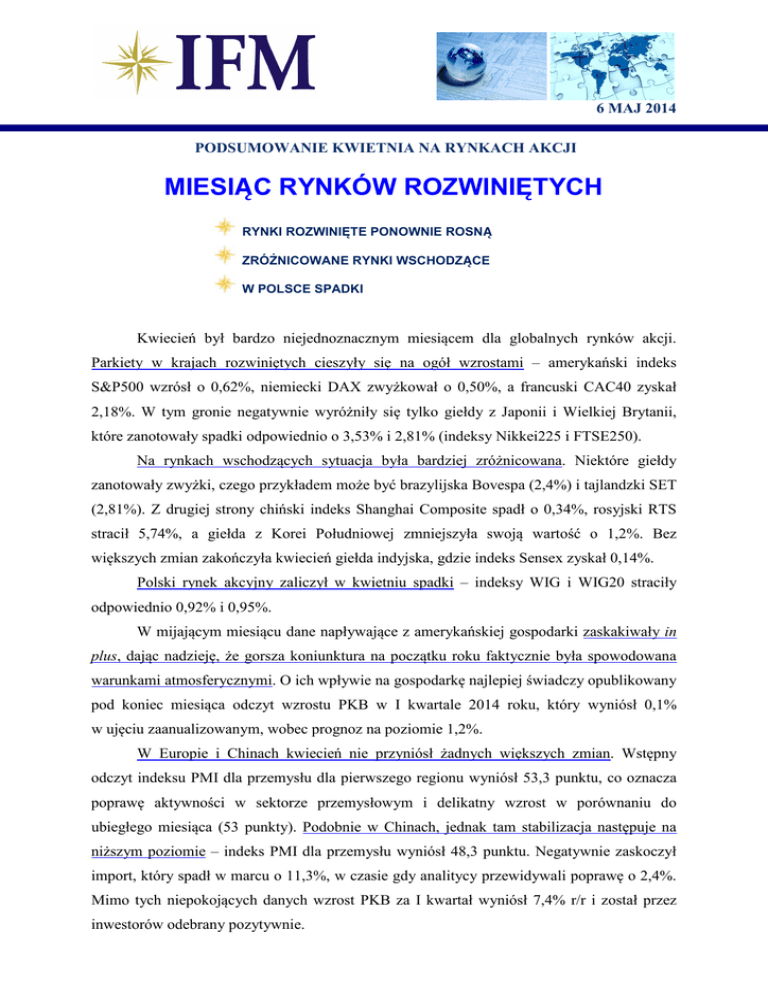 6 MAJ 2014 PODSUMOWANIE KWIETNIA NA RYNKACH AKCJI MIESIĄC RYNKÓW ROZWINIĘTYCH RYNKI ROZWINIĘTE PONOWNIE ROSNĄ ZRÓŻNICOWANE RYNKI WSCHODZĄCE W POLSCE SPADKI Kwiecień był bardzo niejednoznacznym miesiącem dla globalnych rynków akcji. Parkiety w krajach rozwiniętych cieszyły się na ogół wzrostami – amerykański indeks S&P500 wzrósł o 0,62%, niemiecki DAX zwyżkował o 0,50%, a francuski CAC40 zyskał 2,18%. W tym gronie negatywnie wyróżniły się tylko giełdy z Japonii i Wielkiej Brytanii, które zanotowały spadki odpowiednio o 3,53% i 2,81% (indeksy Nikkei225 i FTSE250). Na rynkach wschodzących sytuacja była bardziej zróżnicowana. Niektóre giełdy zanotowały zwyżki, czego przykładem może być brazylijska Bovespa (2,4%) i tajlandzki SET (2,81%). Z drugiej strony chiński indeks Shanghai Composite spadł o 0,34%, rosyjski RTS stracił 5,74%, a giełda z Korei Południowej zmniejszyła swoją wartość o 1,2%. Bez większych zmian zakończyła kwiecień giełda indyjska, gdzie indeks Sensex zyskał 0,14%. Polski rynek akcyjny zaliczył w kwietniu spadki – indeksy WIG i WIG20 straciły odpowiednio 0,92% i 0,95%. W mijającym miesiącu dane napływające z amerykańskiej gospodarki zaskakiwały in plus, dając nadzieję, że gorsza koniunktura na początku roku faktycznie była spowodowana warunkami atmosferycznymi. O ich wpływie na gospodarkę najlepiej świadczy opublikowany pod koniec miesiąca odczyt wzrostu PKB w I kwartale 2014 roku, który wyniósł 0,1% w ujęciu zaanualizowanym, wobec prognoz na poziomie 1,2%. W Europie i Chinach kwiecień nie przyniósł żadnych większych zmian. Wstępny odczyt indeksu PMI dla przemysłu dla pierwszego regionu wyniósł 53,3 punktu, co oznacza poprawę aktywności w sektorze przemysłowym i delikatny wzrost w porównaniu do ubiegłego miesiąca (53 punkty). Podobnie w Chinach, jednak tam stabilizacja następuje na niższym poziomie – indeks PMI dla przemysłu wyniósł 48,3 punktu. Negatywnie zaskoczył import, który spadł w marcu o 11,3%, w czasie gdy analitycy przewidywali poprawę o 2,4%. Mimo tych niepokojących danych wzrost PKB za I kwartał wyniósł 7,4% r/r i został przez inwestorów odebrany pozytywnie. 6 MAJ 2014 Jeśli możemy odpowiedzieć na Państwa dodatkowe pytania, pozostajemy do dyspozycji pod następującymi numerami telefonów: Departament Zarządzania Portfelami Katowice, tel. (32) 602 79 00 Warszawa, tel. (22) 319 57 60 Wrocław, tel. (71) 757 29 50 www.ifmpl.com Zapraszamy do śledzenia komentarzy dr Marka Mobiusa nt. rynków wschodzących na stronie Investment Fund Managers S.A.: „Podróże po rynkach wschodzących”, http://komentarzemobiusa.ifmpl.com/. Ostatnio ukazały się: Kreatywne podejście do ożywienia gospodarki Korei Południowej Koszt gospodarczy szaleńczych wydatków Brazylii Badanie przedsiębiorstwa przez pryzmat ESG Źródło: IFM Global Asset Management Sp. z o.o. Nota prawna: Niniejszy dokument sporządzono wyłącznie dla celów informacyjnych i nie stanowi on: 1) oferty kupna lub sprzedaży ani zachęty do kupna lub sprzedaży jakichkolwiek papierów wartościowych bądź instrumentów finansowych, o których mowa w niniejszym dokumencie, ani też nie ma charakteru: 2) doradztwa inwestycyjnego. Wszelkie decyzje o inwestycji w papiery wartościowe omówione w niniejszym dokumencie należy podejmować po zapoznaniu się z najbardziej aktualną wersją prospektu emisyjnego. Ponadto potencjalni inwestorzy powinni przeprowadzić stosowne analizy, jakie uznają za niezbędne oraz powinni skorzystać z usług doradztwa w kwestiach prawnych, księgowych i podatkowych w celu samodzielnego i świadomego ustalenia stosowności oraz konsekwencji i skutków inwestycji w papiery wartościowe. Opinie zawarte w niniejszym dokumencie mogą ulec zmianie bez uprzedniego powiadomienia. Osiągnięte w przeszłości przez zaprezentowane fundusze stopy zwrotu nie są gwarancją uzyskania podobnych stóp zwrotu w przyszłości.