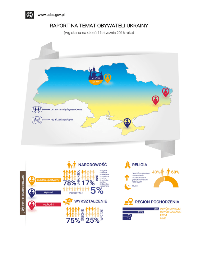 www.udsc.gov.pl RAPORT NA TEMAT OBYWATELI UKRAINY (wg stanu na dzień 11 stycznia 2016 roku) www.udsc.gov.pl OCHRONA MIĘDZYNARODOWA 1. Wnioski (dane aktualizowane raz w tygodniu) Tabela 1: Liczba obywateli Ukrainy, którzy w latach 2003-2015 złożyli wniosek o udzielenie ochrony międzynarodowej w RP oraz wznowienia postępowania. OBYWATELSTWO UKRAINA 2003 2004 2005 2006 86 72 84 60 2007 2008 55 40 2009 2010 2011 36 45 67 2012 72 2013 2014 46 2318 2015 2298 6820 8007 6776 7033 9993 8477 10551 6489 6820 10681 15104 5877 9950 6906 8079 6860 7093 10048 8517 10587 6534 6887 10753 15150 8195 12248 POZOSTAŁE SUMA 2016 24 201 suma 5303 112779 225 118082 16000 15104 14000 12000 9993 10000 8000 8007 6820 67767033 10551 10681 9950 8477 64896820 6000 5877 4000 2000 0 86 72 84 60 55 40 36 2003 2005 2007 2009 Ukraina • 2318 2298 45 67 72 2011 46 2013 4 37 2015 pozostałe Pod względem liczby składanych wniosków o udzielenie ochrony międzynarodowej w 2016 roku, Ukraina znajduje się obecnie na drugim miejscu, za Rosją. • W 2014 r., liczba obywateli Ukrainy ubiegających się o nadanie statusu uchodźcy w 2014 roku stanowiła 34% ogólnej liczby ubiegających się o nadanie tego statusu, a w 2015 r., liczba obywateli Ukrainy ubiegających się o udzielenie ochrony międzynarodowej w 2015 stanowiła 19% ogólnej liczby osób objętych tymi wnioskami. • Wg stanu na dzień 10.01.2016 r., liczba obywateli Ukrainy ubiegających się o ochronę w 2016 stanowiła 11% ogólnej liczby wnioskodawców. • Według stanu na 10.01.2016 r., Szef Urzędu do Spraw Cudzoziemców prowadzi 651 postępowań w sprawie o udzielenie ochrony wobec obywateli Ukrainy. • Według stanu na dzień 11.01.2016 r., pomocą socjalną Szefa Urzędu do Spraw Cudzoziemców objętych jest 1 831 obywateli Ukrainy. www.udsc.gov.pl Liczba obywateli Ukrainy, którzy w latch 2012 - 2016 złożyli wniosek o nadanie statusu uchodźcy w RP (w okresie do 10.01.2016). 350 300 242 250 269 275 150 138 129 100 50 11 9 45 24 1.I. 2 4 3 II. 11 3 III. 2012 231 188 2 4 V. 3 220 2 6 VI. 2013 2 VII. 3 2014 6 3 VIII. 2015 12 IX. 6 X. 0 6 152 144 115 3 188 181 132 161 11 IV. 251 219 205 200 0 234 246 308 275 3 XI. 4 XII. 10 2016* *od 2015 r. do wartości miesięcznych wliczone są także wznowienia postępowań 2. Decyzje (dane aktualizowane raz w tygodniu) 2013 r. W 2013 r. w sprawach o nadanie statusu uchodźcy na terytorium Rzeczypospolitej Polskiej wobec obywateli Ukrainy wydano: • • • • • 2 decyzje o nadaniu statusu uchodźcy, 5 decyzji o udzieleniu ochrony uzupełniającej, 8 decyzji o udzieleniu zgody na pobyt tolerowany, 39 decyzji negatywnych, 26 decyzji o umorzeniu postępowania lub pozostawieniu wniosku bez rozpoznania. 2014 r. W stosunku do osób, które złożyły wniosek w 2013 roku w sprawach o nadanie statusu uchodźcy na terytorium Rzeczypospolitej Polskiej, wobec obywateli Ukrainy, Szef UdSC wydał: • 1 decyzję o umorzeniu postępowania, • 7 decyzji negatywnych. W stosunku do osób, które złożyły wniosek w sprawach o nadanie statusu uchodźcy na terytorium Rzeczypospolitej Polskiej, wobec obywateli Ukrainy, Szef UdSC wydał: • 372 decyzje o umorzeniu postępowania, • 645 decyzji negatywnych, • 6 decyzji o udzieleniu ochrony uzupełniającej, • 11 decyzji o udzieleniu zgody na pobyt tolerowany. www.udsc.gov.pl 2015 r. (od 01.01.2015 r. do 27.12.2015 r.) W stosunku do osób, które złożyły wniosek w sprawach o udzielenie ochrony międzynarodowej na terytorium Rzeczypospolitej Polskiej, wobec obywateli Ukrainy, Szef UdSC wydał: • • • • 760 decyzji o umorzeniu postępowania, 1753 decyzji negatywnych, 6 decyzje o udzieleniu zgody na pobyt tolerowany, 6 decyzji o udzieleniu ochrony uzupełniającej. 2015 r. (od 01.01.2015 r. do 03.01.2016 r.) W stosunku do osób, które złożyły wniosek w sprawach o udzielenie ochrony międzynarodowej na terytorium Rzeczypospolitej Polskiej, wobec obywateli Ukrainy, Rada do Spraw Uchodźców wydała (decyzje pozytywne): • 2 decyzje o nadaniu statusu uchodźcy w RP, • 18 decyzji o udzieleniu ochrony uzupełniającej. 2016 r. (od 1.01.2016 r. do 10.01.2016 r.) W stosunku do osób, które złożyły wniosek w sprawach o udzielenie ochrony międzynarodowej na terytorium Rzeczypospolitej Polskiej, wobec obywateli Ukrainy, Szef UdSC wydał: • 13 decyzji o umorzeniu postępowania, • 20 decyzji negatywnych, • 4 decyzje o udzieleniu ochrony uzupełniającej. 3. Profil wnioskodawców (dane aktualizowane raz w miesiącu) Profil obywateli wnioskodawców opracowano w oparciu o informacje uzyskane od obywateli Ukrainy ubiegających się o udzielenie ochrony międzynarodowej (wg stanu spraw będących w toku na dzień 7 grudnia 2015 r. zebrano informacje dot. 60 spraw) Narodowość: • ukraińska (ok. 78%) • pozostałe – tj. rosyjska, tatarska, ormiańska, koreańska, grecka, gruzińska, polska, • żydowska, kazachska (łącznie ok. 17%). Religia - większość osób jako wyznanie podaje chrześcijaństwo (prawosławie, protestantyzm, grekokatolicyzm, katolicyzm) lub islam (5%). www.udsc.gov.pl Region pochodzenia Osoby ubiegające się o ochronę międzynarodową w Polsce pochodzą z obwodów: donieckiego (ok. 60%) i ługańskiego (ok. 25%), a także z Krymu (ok. 8%). O udzielenie ochrony międzynarodowej ubiegają się również osoby z obwodów: kijowskiego, lwowskiego, chersońskiego, charkowskiego, iwano-frankowskiego i czerkaskiego. Charakterystyka demograficzna Obecnie z przedmiotowymi wnioskami występuje więcej mężczyzn (ok. 60%), niż kobiet (40%), jednakże należy wskazać, iż ww. wnioski (w więcej niż w połowie przypadków) są składane również w imieniu pozostałych członków rodziny (współmałżonka, dzieci). Stan cywilny oraz status rodzinny wnioskodawców kształtują się różnie. Wiek zainteresowanych to od 19 do 77 roku życia. Wykształcenie i zawód Wśród ubiegających się o status uchodźcy wyróżniamy przede wszystkim
