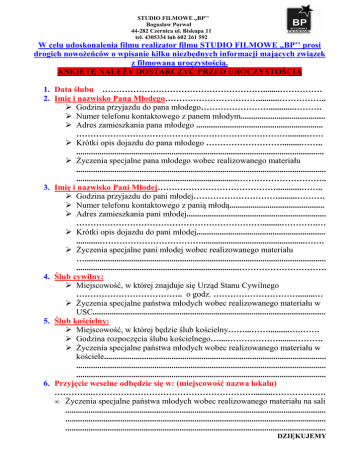 STUDIO FILMOWE „BP’’ Bogusław Porwoł 44-282 Czernica ul. Biskupa 11 tel. 4305334 lub 602 261 592 W celu udoskonalenia filmu realizator filmu STUDIO FILMOWE „BP’’ prosi drogich nowożeńców o wpisanie kilku niezbędnych informacji mających związek z filmowaną uroczystością. ANKIETĘ NALEŻY DOSTARCZYĆ PRZED UROCZYSTOŚCIĄ 1. Data ślubu …………………………………………………........…………… 2. Imię i nazwisko Pana Młodego……………………………..........…………….. Godzina przyjazdu do pana młodego……………………............………. Numer telefonu kontaktowego z panem młodym........................................ Adres zamieszkania pana młodego ............................................................ ………………………………………………………………….........…… Krótki opis dojazdu do pana młodego ……………………….........…….. ..................................................................................................................... Życzenia specjalne pana młodego wobec realizowanego materiału ...................................................................................................................... ............................................................................………………………….. 3. Imię i nazwisko Pani Młodej……………………………………............…….. Godzina przyjazdu do pani młodej………………………….........………. Numer telefonu kontaktowego z panią młodą............................................. Adres zamieszkania pani młodej.................................................................. ………………………………………………………….........………….… Krótki opis dojazdu do pani młodej............................................................. ...........……………………………….................................................……. Życzenia specjalne pani młodej wobec realizowanego materiału ….................................................................................................................. .............................................................................…………………………. 4. Ślub cywilny: Miejscowość, w której znajduje się Urząd Stanu Cywilnego ……………………………….. o godz. …………………………........… Życzenia specjalne państwa młodych wobec realizowanego materiału w USC.............................................................................................................. 5. Ślub kościelny: Miejscowość, w której będzie ślub kościelny……...……..........….……. Godzina rozpoczęcia ślubu kościelnego…....………………........………. Życzenia specjalne państwa młodych wobec realizowanego materiału w kościele......................................................................................................... ...................................................................................................................... ...................................................................................................................... 6. Przyjęcie weselne odbędzie się w: (miejscowość nazwa lokalu) …………..………………………………………………….........………………. • Życzenia specjalne państwa młodych wobec realizowanego materiału na sali ........................................................................................................................... ........................................................................................................................... ........................................................................................................................... DZIĘKUJEMY