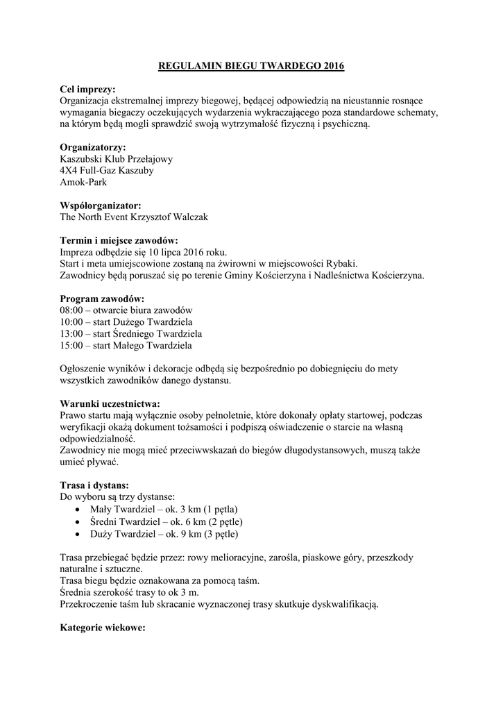 REGULAMIN BIEGU TWARDEGO 2016 Cel imprezy: Organizacja ekstremalnej imprezy biegowej, będącej odpowiedzią na nieustannie rosnące wymagania biegaczy oczekujących wydarzenia wykraczającego poza standardowe schematy, na którym będą mogli sprawdzić swoją wytrzymałość fizyczną i psychiczną. Organizatorzy: Kaszubski Klub Przełajowy 4X4 Full-Gaz Kaszuby Amok-Park Współorganizator: The North Event Krzysztof Walczak Termin i miejsce zawodów: Impreza odbędzie się 10 lipca 2016 roku. Start i meta umiejscowione zostaną na żwirowni w miejscowości Rybaki. Zawodnicy będą poruszać się po terenie Gminy Kościerzyna i Nadleśnictwa Kościerzyna. Program zawodów: 08:00 – otwarcie biura zawodów 10:00 – start Dużego Twardziela 13:00 – start Średniego Twardziela 15:00 – start Małego Twardziela Ogłoszenie wyników i dekoracje odbędą się bezpośrednio po dobiegnięciu do mety wszystkich zawodników danego dystansu. Warunki uczestnictwa: Prawo startu mają wyłącznie osoby pełnoletnie, które dokonały opłaty startowej, podczas weryfikacji okażą dokument tożsamości i podpiszą oświadczenie o starcie na własną odpowiedzialność. Zawodnicy nie mogą mieć przeciwwskazań do biegów długodystansowych, muszą także umieć pływać. Trasa i dystans: Do wyboru są trzy dystanse: Mały Twardziel – ok. 3 km (1 pętla) Średni Twardziel – ok. 6 km (2 pętle) Duży Twardziel – ok. 9 km (3 pętle) Trasa przebiegać będzie przez: rowy melioracyjne, zarośla, piaskowe góry, przeszkody naturalne i sztuczne. Trasa biegu będzie oznakowana za pomocą taśm. Średnia szerokość trasy to ok 3 m. Przekroczenie taśm lub skracanie wyznaczonej trasy skutkuje dyskwalifikacją. Kategorie wiekowe: Mężczyźni do lat 30 Mężczyźni od lat 31 do 55 Mężczyźni od 56 wzwyż Kobiety do lat 30 Kobiety od lat 30 do 55 Kobiety po 56 wzwyż Pakiet Startowy: Standard: standardowa koszulka techniczna z logiem biegu numer startowy, komplet agrafek, chip PRO: w całości zadrukowana specjalna koszulka techniczna Twardziela z długim rękawem numer startowy, komplet agrafek, chip Zgłoszenia i opłaty startowe: Zgłoszenia odbywają się przez serwis elektronicznezapisy.pl Uczestnicy biegu zobowiązani są do wpłacenia wpisowego przez serwis DotPay (przekierowanie ze strony elektronicznezapisy.pl): 04.01.16 – 31.03.16 01.04.16 – 05.07.16 w dniu imprezy Mały Twardziel 60/90* zł 90/110* zł 110/140* zł Średni Twardziel 70/100* zł 90/120* zł 120/150* zł Duży Twardziel 70/100* zł 90/120* zł 120/150* zł *Wyższe kwoty po ukośniku odnoszą się do pakietów PRO ze specjalnymi, w całości zadrukowanymi koszulkami technicznymi Twardziela z długim rękawem. Nagrody: Zawodnicy, którzy zajmą miejsca 1–3 otrzymują puchary i nagrody rzeczowe. Każdy zawodnik, który ukończył bieg otrzyma pamiątkowy medal. Sprawy sanitarne: Organizator zapewnia możliwość korzystania z toalet, pryszniców i bezpłatnego pola namiotowego. Zabezpieczenie imprezy: Pomoc medyczna Zabezpieczenie trasy biegu Ubezpieczenie zawodników (OC) Postanowienia końcowe: a. bieg odbędzie się bez względu na pogodę, b. każdy zawodnik zobowiązany jest do przypięcia w widoczny sposób numeru startowego na piersi bądź brzuchu, c. organizator nie ponosi odpowiedzialności za rzeczy zgubione podczas imprezy i za szkody wyrządzone przez uczestników, d. przekazanie do Organizatora, prawidłowo wypełnionego i podpisanego formularza zgłoszeniowego oznacza wyrażenie zgody przez uczestnika Biegu na wykorzystanie podanych przez niego danych osobowych na potrzeby przesłania do uczestnika informacji o przyszłych imprezach, produktach handlowych, a także na wewnętrzne potrzeby administracyjne i analityczne, zgodnie z ustawą o ochronie danych osobowych z dnia 29 sierpnia 1997 r.,Dz. U. nr 33, poza 883. Uczestnikowi przysługuje prawo do wycofania takiej zgody i może to zrobić w dowolnym momencie, kierując korespondencję na adres Organizatora, e. w depozycie nie można pozostawiać rzeczy wartościowych, f. organizator posiada ubezpieczenie OC i NNW, g. ostateczna interpretacja regulaminu należy do Organizatora.