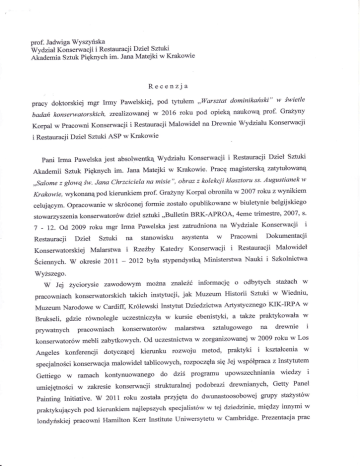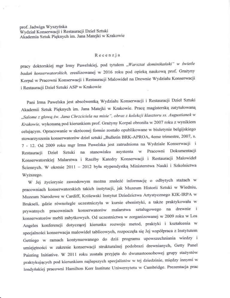 prof. Jadwiga Wyszyńska Wydział Konserwacji i Restauracji Dzieł Szh}ki Akademia SZfuk Pięknych im. Jana Matejki w Krakowie Recenzia '' w świetle pracy doktorskiej mgr lrmy Pawelskiej, pod t}tułem o,Warsztat dominikoński" prof' GraĄny badań konserwatorskich, złea|izowanej w 2016 roku pod opieką naukową Wydziału Konserwacji Korpa1 w Pracowni Konserwacji i Restauracji Malowideł na Drewnie i RestauracjiDzięł SZfuki ASP w l(rakowie Sztuki Pani lrma Pawelska jest absolwentką Wydziafu Konserwacji i Ręstarrracji Dzieł zatytułowaną Akademii sztuk Pięknych im. Jana Matejki w Krakowie. Pracę magisterską misie", obraz z kolekcji klasztoru ss- Augustianek w ,,Salome z głową św.Jana Chrzciciela na z wynikiem wykonanąpod kierunkiem prof. Gra:Żyny Korpal obroniła w Ż007 roku Krąkowie, w biuletynie belgijskiego celującym. opracowanie w skróconej formie zostało opublikowane 4eme trimestre, 2ao}, s' stowarzyszenia konserwatorów dzieł sztuki ',Bulletin BRK-APROA, i 7 - 12. od 2009 roku mgł Irma Pawelska jest zatrudniona na Wydziale Konserwacji na stanowisku asystenta w Pracowni Dokumentacji Malowideł Konserwatorskiej Malarstwa i Rzeźby Katedry Konserwacji i Restauracji 'W okresie 20II _ ŻOI2 była stypendystką Ministerstwa Nauki i Szkolnictwa Ściennych. Restauracji DzieŁ Szh]ki Wyzszego. w życiorysie zawodowym moŻna zna\eżi informację o odbyfych stażach Sztuki w Więdniu, pracowniach konsęrwatorskich takich instytucji, jak Muzeum Historii KIK-IRPA w Narodowe w Cardiff, Królewski Instytut Dńedzictwa Artystycznego W Jej Muzeum praktykowała w Brukseli, gdzie rÓwnolegle uczestrncryła w kursie ebenistyki, a takŻe i prywatnych pracowniach konserwatorów ma]arstwa sztalugowego lua drewnie w 2009 roku w Los konserwatorów mebli zabytkowych. od uczestnictwa w zorganizowanej Angeles konferencji doĘczącej kierunku rozwoju metod' praktyki i ksńałcenia w Jej wspóĘraca z InsĘtutem specjalności konserwacja malowideł tablicowych, rozpoczęła się Gettiego w ramach konĘnuowanego do dziśprogramu upowszechniania wiedzy i Gętfy Panel umiejętrościw zakresie konserwacji strukturalnej podobrazi drewnianych, grupy sta:Ąstów Painting Initiativę. w 2011 roku zostaŁa przyjęta do dwunastoosobowej między innymi w praklykujących pod kigrunkiem najlepszych specjalistów w tej dziedzinie' Cambńdge' Prezentacja prac londyńskiej pracowni Hamilton Kerr Institute Uniwersytetu w odbyła się w 2013 rokuo w Warszawie, podczas konferencji ICOM-CC Heritage $/ood: Ręsearch & Conservation in the 21st Century. W 2013 roku uczestntczyła w warsztatach na temat konserwacji obrazów cyklu Sw. Katarzyny Aleksandryjskiej Hansa Siissa z Kulmbachu w zbiorach bazyliki Mariackiej w Krakowie. W 2014 roku kilka miesięcy spędziła w Muzeum Prado, uczestntczyła w tygodniowych warsztatach doĘczących strukturalnej konserwacji podobrazi drewnianych we Florencji, Madrycie, Londynie, Bruksęli spoŹ1.tkowane wyczerpująco i Maastricht, co było dzięki znajomościjęzyka angielskiego, francuskiego i hiszpańskiego. opinie zebrane od Jej preceptorów są bardzo poą'tywne. Wszyscy z nadzieją oczekując na dalszą współpracę podkreśtają Jej autentyęzne zalnteresowanie realizowanymi zadaniami, otwartośćmyślenia' dociekliwosc i aktywność w dyskusjach. Lista ręalizacji konserwatorskich Pani Irmy Pawelskiej w pierwszym roku po uzyskaniu d1plomu zaczwa się od pracy zespołowej przy malowidłach ściennych na sklepieniach bocznych kaplic w kościele św.Matęrnusa i Wniebowzięcia NMP w Lubomierzu, dokąd w 2010 roku pracując zespołowo przy konserwacji malowideł na sklepieniu kościoła.Kolejne obiekty taleŻą do malarstwa sztalugowego. Są to prace prowadzone podczas stazu w Królewskim lnst;rtucie Dziedzictvła Artystycznego I(K-IRPA w Brukseli powróciła przy malowidłach przypisywarrych Hendricksowi de Clerk, Wąż miedziany oraz Wieczerza Paschalna z koŚcioła św.Marcina w Aalst. w tym samym czasię Pani Irma Pawęlska brała udział w pracach obejmujących strukturalną konserwację XVl-wieczlego tryptyku szkoĘ antwerpskiej w pracowni konserwacji malowideł na drewnie Jeana Albęrta Glatigny. V/ latach 2008 * 2009 pracowała w zespole konserwującym meble Zimowej Zakrystii opactwa Benedyktynów w Melk, a następnie pruy konserwacji obrazu Święta Rodzina, niemiecka, na podobraziu drewnianym i XV w. szkoła dwóch obrazów olejnych na płótnie: Loręnzo Lippiego, Portret Zygmunta Franciszka Habsburga, 1645 r- oraz Lucasa van Valkenborchą Wiejska gospoda, 1598 r., w zbiorach Muzeum Historii Szh}ki w Więdniu. W 2012 roku przebywała w londyńskiej pracowni Hamilton Kerr Institutę praktykując pod kierunkiem Raya Marchanda i Simona Bobaka konserwację strukturalną dwóch szęsnastowiecznych malowideł tablicowych wykonanych w tęchnice olejnej, Narodziny Diany i Apolla oruz Tron niebiąński, przypisywanych szkole Giulia Romano. W następnych latach pracowała przy pięciu obtazaęh z ołtarza p.w' św.Jana datowanych na i604 rok i zKęt, z klasztoru oo. Dominikanów w Krakowie, przypisywanych Stanisławowi Boi, wykonanych na podobtaziu drewnianym, przedstawiających śś.Jacką Dominiką Agnieszkę z Montepulciano, Katarzynę ze Sieny i Rajmunda de Penyaforf. Wykonała tez konserwację strukturalną obrazów Pocałunek Judasza i Modlitwa w ogrojcu zbazyllŁł Mariackiej w Krakowie, datowanych na początek XVII w. W 2014 foku, w Museum Prado praktykowała pod kięrunkięm Jose de la i Atberto Dimuccio strukturalną konserwację podobrazi szesnastowiecznych malowidęł na drewnie mistrzów szkoły włoskiej i niderlandzkiej. W bieżącym roku Fuentę uczestniczy w zespole prowadzącym konserwĄę piętnastowiecznych obrazów św. Wojciecha i św'Stanisława W Katedrze na Wawelu. Przędstawiona do recenzji praca doktorska p.t. ,,Warsztat dominikański" w świetlebadań kanserwatorskich składa się ze 113 stron tekstu zasadriczego' W którym zamięszczonych jest 