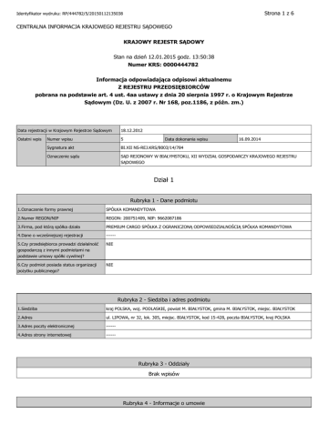Strona 1 z 6 Identyfikator wydruku: RP/444782/5/20150112135038 CENTRALNA INFORMACJA KRAJOWEGO REJESTRU SĄDOWEGO KRAJOWY REJESTR SĄDOWY Stan na dzień 12.01.2015 godz. 13:50:38 Numer KRS: 0000444782 Informacja odpowiadająca odpisowi aktualnemu Z REJESTRU PRZEDSIĘBIORCÓW pobrana na podstawie art. 4 ust. 4aa ustawy z dnia 20 sierpnia 1997 r. o Krajowym Rejestrze Sądowym (Dz. U. z 2007 r. Nr 168, poz.1186, z późn. zm.) Data rejestracji w Krajowym Rejestrze Sądowym 18.12.2012 Ostatni wpis Numer wpisu 5 Sygnatura akt BI.XII NS-REJ.KRS/8003/14/784 Oznaczenie sądu SĄD REJONOWY W BIAŁYMSTOKU, XII WYDZIAŁ GOSPODARCZY KRAJOWEGO REJESTRU SĄDOWEGO Data dokonania wpisu 16.09.2014 Dział 1 Rubryka 1 - Dane podmiotu 1.Oznaczenie formy prawnej SPÓŁKA KOMANDYTOWA 2.Numer REGON/NIP REGON: 200751409, NIP: 9662087186 3.Firma, pod którą spółka działa PREMIUM CARGO SPÓŁKA Z OGRANICZONĄ ODPOWIEDZIALNOŚCIĄ SPÓŁKA KOMANDYTOWA 4.Dane o wcześniejszej rejestracji ------ 5.Czy przedsiębiorca prowadzi działalność gospodarczą z innymi podmiotami na podstawie umowy spółki cywilnej? NIE 6.Czy podmiot posiada status organizacji pożytku publicznego? NIE Rubryka 2 - Siedziba i adres podmiotu 1.Siedziba kraj POLSKA, woj. PODLASKIE, powiat M. BIAŁYSTOK, gmina M. BIAŁYSTOK, miejsc. BIAŁYSTOK 2.Adres ul. LIPOWA, nr 32, lok. 305, miejsc. BIAŁYSTOK, kod 15-428, poczta BIAŁYSTOK, kraj POLSKA 3.Adres poczty elektronicznej ------ 4.Adres strony internetowej ------ Rubryka 3 - Oddziały Brak wpisów Rubryka 4 - Informacje o umowie Strona 2 z 6 Identyfikator wydruku: RP/444782/5/20150112135038 1.Informacje o zawarciu lub zmianie umowy spółki 1 14.12.2012 R. PRZED ASESOREM NOTARIALNYM MAGDALENĄ MOTAL-BRZOSKO, ZASTĘPCĄ NOTARIUSZ BARBARY MOTAL-FILIPCZUK W KN W BIAŁYMSTOKU, REP. "A" NR 5347/2012 ZAWIĄZANO SPÓŁKĘ KOMANDYTOWĄ Rubryka 5 1.Czas, na jaki została utworzona spółka NIEOZNACZONY Rubryka 6 - Sposób powstania spółki Brak wpisów Rubryka 7 - Dane wspólników 1 1.Nazwisko / Nazwa lub firma DZIERSZKO 2.Imiona RAFAŁ 3.Numer PESEL/REGON 79022802738 4.Numer KRS ****** 5.Czy wspólnik pozostaje w związku małżeńskim? NIE 6.Czy została zawarta małżeńska umowa majątkowa? ***** 7.Czy powstała rozdzielność majątkowa między małżonkami ? ***** 8.Czy wspólnik ma ograniczoną zdolność do czynności prawnych? NIE 9.Czy wspólnik jest komandytariuszem? TAK 10.Wysokość sumy komandytowej 5.000 (PIĘĆ TYSIĘCY) ZŁOTYCH 11.Wartość wkładu umówionego 5.000 (PIĘĆ TYSIĘCY) ZŁOTYCH 12.Czy jest w tym wkład niepieniężny? NIE Podrubryka 1 Wkład wniesiony 1 1.Wartość wkładu wniesionego 5.000 (PIĘĆ TYSIĘCY) ZŁOTYCH 2.Czy jest to wkład niepieniężny? NIE Podrubryka 2 Wkład zwrócony Brak wpisów 2 1.Nazwisko / Nazwa lub firma STRUK 2.Imiona BARTOSZ 3.Numer PESEL/REGON 79021603774 4.Numer KRS ****** 5.Czy wspólnik pozostaje w związku małżeńskim? NIE 6.Czy została zawarta małżeńska umowa majątkowa? ***** Strona 3 z 6 Identyfikator wydruku: RP/444782/5/20150112135038 7.Czy powstała rozdzielność majątkowa między małżonkami ? ***** 8.Czy wspólnik ma ograniczoną zdolność do czynności prawnych? NIE 9.Czy wspólnik jest komandytariuszem? TAK 10.Wysokość sumy komandytowej 5.000 (PIĘĆ TYSIĘCY) ZŁOTYCH 11.Wartość wkładu umówionego 5.000 (PIĘĆ TYSIĘCY) ZŁOTYCH 12.Czy jest w tym wkład niepieniężny? NIE Podrubryka 1 Wkład wniesiony 1 1.Wartość wkładu wniesionego 5.000 (PIĘĆ TYSIĘCY) ZŁOTYCH 2.Czy jest to wkład niepieniężny? NIE Podrubryka 2 Wkład zwrócony Brak wpisów 3 1.Nazwisko / Nazwa lub firma PREMIUM CARGO SPÓŁKA Z OGRANICZONĄ ODPOWIEDZIALNOŚCIĄ 2.Imiona ****** 3.Numer PESEL/REGON 200748212 4.Numer KRS 0000442408 5.Czy wspólnik pozostaje w związku małżeńskim? ***** 6.Czy została zawarta małżeńska umowa majątkowa? ***** 7.Czy powstała rozdzielność majątkowa między małżonkami ? ***** 8.Czy wspólnik ma ograniczoną zdolność do czynności prawnych? ***** 9.Czy wspólnik jest komandytariuszem? NIE 10.Wysokość sumy komandytowej ***** 11.Wartość wkładu umówionego ***** 12.Czy jest w tym wkład niepieniężny? ***** Podrubryka 1 Wkład wniesiony Brak wpisów Podrubryka 2 Wkład zwrócony Brak wpisów Dział 2 Rubryka 1 - Uprawnieni do reprezentowania spółki 1.Nazwa organu uprawnionego do reprezentowania podmiotu WSPÓLNICY REPREZENTUJĄCY SPÓŁKĘ 2.Sposób reprezentacji podmiotu KOMPLEMENTARIUSZ SAMODZIELNIE Podrubryka 1 Strona 4 z 6 Identyfikator wydruku: RP/444782/5/20150112135038 Dane wspólników reprezentujących spółkę 1 1.Nazwisko / Nazwa lub firma PREMIUM CARGO SPÓŁKA Z OGRANICZONĄ ODPOWIEDZIALNOŚCIĄ 2.Imiona ********* 3.Numer PESEL/REGON 200748202 4.Numer KRS 0000442408 Rubryka 2 - Nie dotyczy Brak wpisów Rubryka 3 - Prokurenci Brak wpisów Dział 3 Rubryka 1 - Przedmiot działalności 1.Przedmiot przeważającej działalności przedsiębiorcy 1 --- 2.Przedmiot pozostałej działalności przedsiębiorcy 1 49, 41, Z, TRANSPORT DROGOWY TOWARÓW 2 52, 21, Z, DZIAŁALNOŚĆ USŁUGOWA WSPOMAGAJĄCA TRANSPORT LĄDOWY 3 52, 22, B, DZIAŁALNOŚĆ USŁUGOWA WSPOMAGAJĄCA TRANSPORT ŚRÓDLĄDOWY 4 52, 24, C, PRZEŁADUNEK TOWARÓW W POZOSTAŁYCH PUNKTACH PRZEŁADUNKOWYCH 5 52, 24, A, PRZEŁADUNEK TOWARÓW W PORTACH MORSKICH 6 52, 24, B, PRZEŁADUNEK TOWARÓW W PORTACH ŚRÓDLĄDOWYCH 7 52, 29, A, DZIAŁALNOŚĆ MORSKICH AGENCJI TRANSPORTOWYCH 8 52, 29, B, DZIAŁALNOŚĆ ŚRÓDLĄDOWYCH AGENCJI TRANSPORTOWYCH 9 52, 29, C, DZIAŁALNOŚĆ POZOSTAŁYCH AGENCJI TRANSPORTOWYCH 10 66, 19, Z, POZOSTAŁA DZIAŁALNOŚĆ WSPOMAGAJĄCA USŁUGI FINANSOWE, Z WYŁĄCZENIEM UBEZPIECZEŃ I FUNDUSZÓW EMERYTALNYCH 11 69, 20, Z, DZIAŁALNOŚĆ RACHUNKOWO-KSIĘGOWA; DORADZTWO PODATKOWE 12 70, 22, Z, POZOSTAŁE DORADZTWO W ZAKRESIE PROWADZENIA DZIAŁALNOŚCI GOSPODARCZEJ I ZARZĄDZANIA 13 73, 11, Z, DZIAŁALNOŚĆ AGENCJI REKLAMOWYCH 14 74, 90, Z, POZOSTAŁA DZIAŁALNOŚĆ PROFESJONALNA, NAUKOWA I TECHNIC