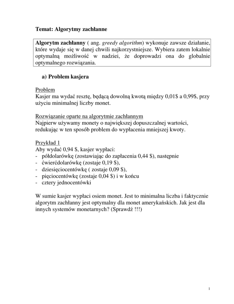 Algorytm zachłanny ( ang. greedy algorithm) wykonuje zawsze działanie,