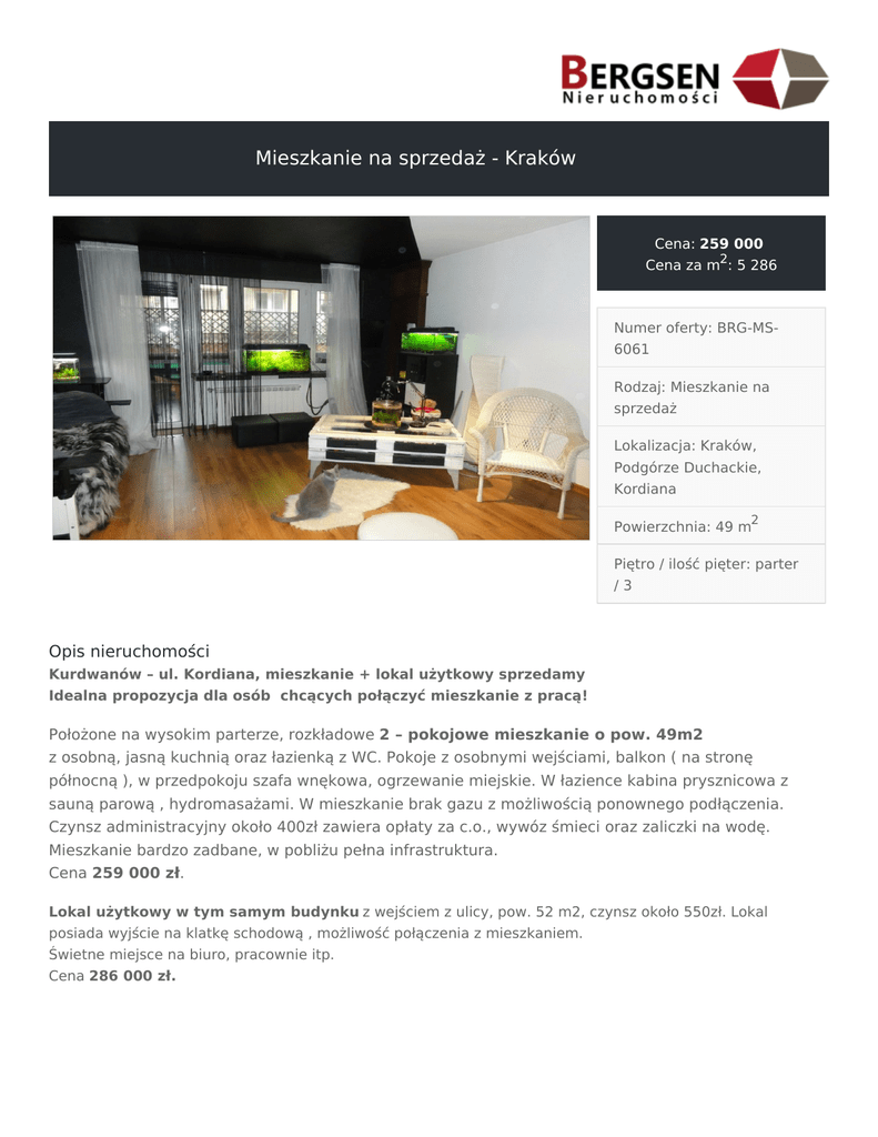 Mieszkanie na sprzedaż - Kraków Cena: 259 000 Cena za m2: 5 286 Numer oferty: BRG-MS6061 Rodzaj: Mieszkanie na sprzedaż Lokalizacja: Kraków, Podgórze Duchackie, Kordiana Powierzchnia: 49 m2 Piętro / ilość pięter: parter /3 Opis nieruchomości Kurdwanów – ul. Kordiana, mieszkanie + lokal użytkowy sprzedamy Idealna propozycja dla osób chcących połączyć mieszkanie z pracą! Położone na wysokim parterze, rozkładowe 2 – pokojowe mieszkanie o pow. 49m2 z osobną, jasną kuchnią oraz łazienką z WC. Pokoje z osobnymi wejściami, balkon ( na stronę północną ), w przedpokoju szafa wnękowa, ogrzewanie miejskie. W łazience kabina prysznicowa z sauną parową , hydromasażami. W mieszkanie brak gazu z możliwością ponownego podłączenia. Czynsz administracyjny około 400zł zawiera opłaty za c.o., wywóz śmieci oraz zaliczki na wodę. Mieszkanie bardzo zadbane, w pobliżu pełna infrastruktura. Cena 259 000 zł. Lokal użytkowy w tym samym budynku z wejściem z ulicy, pow. 52 m2, czynsz około 550zł. Lokal posiada wyjście na klatkę schodową , możliwość połączenia z mieszkaniem. Świetne miejsce na biuro, pracownie itp. Cena 286 000 zł. Kontakt : Małgorzata tel. 606 993 445 e-mail : [email protected] www.bergsen.pl Kontakt w sprawie oferty Agnieszka Mieszkanie na sprzedaż, Kraków, 49.00 m2, 259 000 ZŁ tel: 733840400 mail: [email protected] Zobacz profil