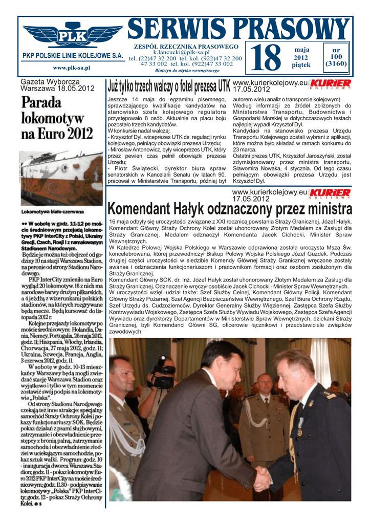 ZESPÓŁ RZECZNIKA PRASOWEGO [email protected] PKP POLSKIE LINIE KOLEJOWE S.A. tel. (22)47 32 200 tel. kol. (922)47 32 200 47 33 002 tel. kol. (922)47 33 002 Gazeta Wyborcza Warszawa 18.05.2012 18 maja 2012 piątek nr 100 (3160) Już tylko trzech walczy o fotel prezesa UTK www.kurierkolejowy.eu 17.05.2012 Jeszcze 14 maja do egzaminu pisemnego, sprawdzającego kwalifikacje kandydatów na stanowisko szefa kolejowego regulatora przystępowało 8 osób. Aktualnie na placu boju pozostało trzech kandydatów. W konkursie nadal walczą: - Krzysztof Dyl, wiceprezes UTK ds. regulacji rynku kolejowego, pełniący obowiązki prezesa Urzędu; - Mirosław Antonowicz, były wiceprezes UTK, który przez pewien czas pełnił obowiązki prezesa Urzędu; - Piotr Świątecki, dyrektor biura spraw senatorskich w Kancelarii Senatu (w latach 90. pracował w Ministerstwie Transportu, później był autorem wielu analiz o transporcie kolejowym). Według informacji ze źródeł zbliżonych do Ministerstwa Transportu, Budownictwa i Gospodarki Morskiej w dotychczasowych testach najlepiej wypadł Krzysztof Dyl. Kandydaci na stanowisko prezesa Urzędu Transportu Kolejowego zostali wybrani z aplikacji, które można było składać w ramach konkursu do 23 marca. Ostatni prezes UTK, Krzysztof Jaroszyński, został zdymisjonowany przez ministra transportu, Sławomira Nowaka, 4 stycznia. Od tego czasu pełniącym obowiązki prezesa Urzędu jest Krzysztof Dyl. www.kurierkolejowy.eu 17.05.2012 Komendant Hałyk odznaczony przez ministra 16 maja odbyły się uroczystości związane z XXI rocznicą powstania Straży Granicznej. Józef Hałyk, Komendant Główny Straży Ochrony Kolei został uhonorowany Złotym Medalem za Zasługi dla Straży Granicznej. Medalem odznaczył Komendanta Jacek Cichocki, Minister Spraw Wewnętrznych. W Katedrze Polowej Wojska Polskiego w Warszawie odprawiona została uroczysta Msza Św. koncelebrowana, której przewodniczył Biskup Polowy Wojska Polskiego Józef Guzdek. Podczas drugiej części uroczystości w siedzibie Komendy Głównej Straży Granicznej wręczone zostały awanse i odznaczenia funkcjonariuszom i pracownikom formacji oraz osobom zasłużonym dla Straży Granicznej. Komendant Główny SOK, dr. Inż. Józef Hałyk został uhonorowany Złotym Medalem za Zasługi dla Straży Granicznej. Odznaczenie wręczył osobiście Jacek Cichocki - Minister Spraw Wewnętrznych. W uroczystości wzięli udział także: Szef Służby Celnej, Komendant Główny Policji, Komendant Główny Straży Pożarnej, Szef Agencji Bezpieczeństwa Wewnętrznego, Szef Biura Ochrony Rządu, Szef Urzędu ds. Cudzoziemców, Dyrektor Generalny Służby Więziennej, Zastępca Szefa Służby Kontrwywiadu Wojskowego, Zastępca Szefa Służby Wywiadu Wojskowego, Zastępca Szefa Agencji Wywiadu oraz dyrektorzy Departamentów w Ministerstwie Spraw Wewnętrznych, dziekani Straży Granicznej, byli Komendanci Główni SG, oficerowie łącznikowi i przedstawiciele związków zawodowych. EKG: Tylko konkurencja wymusi innowacje na kolei www.rynek-kolejowy.pl 17.05.2012 Wczoraj w Katowicach odbył się ostatni dzień Europejskiego Kongresu Gospodarczego. Ostatnim panelem dotyczącym kolei była dyskusja na temat szynowego transportu publicznego, w której wzięli udział m. in. Andrzej Massel, Adam Matusiewicz i Małgorzata Kuczewska-Łaska. Dyskusję o kolejowym transporcie publicznym w ramach Europejskiego Kongresu Gospodarczego rozpoczął dr Robert Tomanek. Stwierdził on, że zauważalny w ostatnim roku wzrost liczby krajowych połączeń lotniczych spowodowany jest olbrzymią konkurencją na liniach lotniczych. - Koleje jak najbardziej mają konkurencję. Konkurują z transportem lotniczym i drogowym – zaprzeczał Carl-Stefan Neumann, dyrektor w McKinsey. - Cała grupa PKP została podzielona w ten sposób, że poszczególne jej człony są monopolistami. To jest udawany rynek. Natomiast konkurencja ze strony innych środków transportu jest gigantyczna. W grupie kolejarskiej funkcjonuje bardzo niezdrowa zasada - że jeżeli brakuje pieniędzy, to władza publiczna i tak dołoży - powiedział marszałek województwa śląskiego Adam Matusiewcz.Według mnie decydująca jest tu jakość torowiska, to ona determinuje, że kolej nie jest konkurencyjna - stwierdził marszałek. Konkurencja jest czynnikiem, który deteminuje innowacyjność - Z dużym zdumieniem usłyszałam, że my udawaliśmy konkurencję, czy rynek. W podziale grupy PKP nie chodziło o stworzenie konkurencji. Spółki z grupy konkurowały, bo taka jest natura ludzka. Niestety na kolei postanowiono jednak tę konkurencję unicestwić i kiedy spółki próbowały konkurować to spółka-matka likwidowała konkurencję, włącznie ze zmianami personalnymi - powiedziała prezes Przewozów Regionalnych Małgorzata Kuczewska-Łaska. - Od początku kongresu rozmawiamy o innowacyjności. Według mnie konkurencja jest czynnikiem, który deteminuje innowacyjność. Koleje od dłuższego czasu nie podlegają konkurencji w Polsce. Brak konkurencji oznacza brak innowacyjności, a brak innowacyjności oznacza gorszy produkt. Dzisiejszą kolej zaplanowaliśmy sobie 10 lat temu i dlatego tak to wygląda. Mi jest wstyd za prędkości, z jakimi jeździmy. A prędkość jest kluczowa dla konkurencji z innymi gałęziami transportu. Jeżeli chcemy coś poprawić, to musimy zwiększyć innowacyjność a w tym celu - zwiększyć konkurencję – powiedziała prezes Przewozów Regionalnych. Będzie konkurencja na zmodernizowanych liniach? Prowadzący debatę dziennikarz Wojciech Szeląg pytał, po co dotować przewoźników kolejowych, skoro usługi oferowane przez prywatnych operatorów wielu sektorach gospodarki okazały się lepsze - Znakomita większość przewozów w Unii Europejskiej odbywa się na podstawie kontraktów w ramach służby publicznej. Łączna suma dotacji do przewozów regionalnych w Niemczech dochodzi do 8 mld Euro. To są usługi finansowane przez podatnik