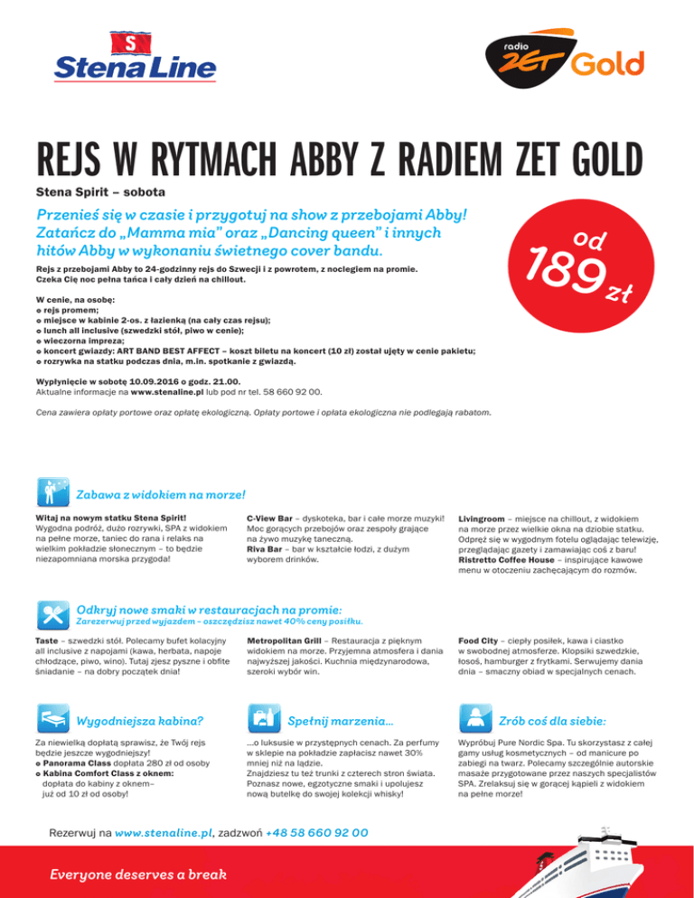 REJS W RYTMACH ABBY Z RADIEM ZET GOLD Stena Spirit – sobota Przenieś się w czasie i przygotuj na show z przebojami Abby! Zatańcz do „Mamma mia” oraz „Dancing queen” i innych hitów Abby w wykonaniu świetnego cover bandu. Rejs z przebojami Abby to 24-godzinny rejs do Szwecji i z powrotem, z noclegiem na promie. Czeka Cię noc pełna tańca i cały dzień na chillout. W cenie, na osobę: £ rejs promem; £ miejsce w kabinie 2-os. z łazienką (na cały czas rejsu); £ lunch all inclusive (szwedzki stół, piwo w cenie); £ wieczorna impreza; £ koncert gwiazdy: ART BAND BEST AFFECT – koszt biletu na koncert (10 zł) został ujęty w cenie pakietu; £ rozrywka na statku podczas dnia, m.in. spotkanie z gwiazdą. od 189 zł Wypłynięcie w sobotę 10.09.2016 o godz. 21.00. Aktualne informacje na www.stenaline.pl lub pod nr tel. 58 660 92 00. Cena zawiera opłaty portowe oraz opłatę ekologiczną. Opłaty portowe i opłata ekologiczna nie podlegają rabatom. Zabawa z widokiem na morze! Witaj na nowym statku Stena Spirit! Wygodna podróż, dużo rozrywki, SPA z widokiem na pełne morze, taniec do rana i relaks na wielkim pokładzie słonecznym – to będzie niezapomniana morska przygoda! C-View Bar – dyskoteka, bar i całe morze muzyki! Moc gorących przebojów oraz zespoły grające na żywo muzykę taneczną. Riva Bar – bar w kształcie łodzi, z dużym wyborem drinków. Livingroom – miejsce na chillout, z widokiem na morze przez wielkie okna na dziobie statku. Odpręż się w wygodnym fotelu oglądając telewizję, przeglądając gazety i zamawiając coś z baru! Ristretto Coffee House – inspirujące kawowe menu w otoczeniu zachęcającym do rozmów. Odkryj nowe smaki w restauracjach na promie: Zarezerwuj przed wyjazdem – oszczędzisz nawet 40% ceny posiłku. Taste – szwedzki stół. Polecamy bufet kolacyjny all inclusive z napojami (kawa, herbata, napoje chłodzące, piwo, wino). Tutaj zjesz pyszne i obfite śniadanie – na dobry początek dnia! Wygodniejsza kabina? Za niewielką dopłatą sprawisz, że Twój rejs będzie jeszcze wygodniejszy! £ Panorama Class dopłata 280 zł od osoby £ Kabina Comfort Class z oknem: dopłata do kabiny z oknem– już od 10 zł od osoby! Metropolitan Grill – Restauracja z pięknym widokiem na morze. Przyjemna atmosfera i dania najwyższej jakości. Kuchnia międzynarodowa, szeroki wybór win. Spełnij marzenia… …o luksusie w przystępnych cenach. Za perfumy w sklepie na pokładzie zapłacisz nawet 30% mniej niż na lądzie. Znajdziesz tu też trunki z czterech stron świata. Poznasz nowe, egzotyczne smaki i upolujesz nową butelkę do swojej kolekcji whisky! Food City – ciepły posiłek, kawa i ciastko w swobodnej atmosferze. Klopsiki szwedzkie, łosoś, hamburger z frytkami. Serwujemy dania dnia – smaczny obiad w specjalnych cenach. Zrób coś dla siebie: Wypróbuj Pure Nordic Spa. Tu skorzystasz z całej gamy usług kosmetycznych – od manicure po zabiegi na twarz. Polecamy szczególnie autorskie masaże przygotowane przez naszych specjalistów SPA. Zrelaksuj się w gorącej kąpieli z widokiem na pełne morze! Rezerwuj na www.stenaline.pl, zadzwoń +48 58 660 92 00 Everyone deserves a break 20 REJS W RYTMACH ABBY Z RADIEM ZET GOLD Stena Spirit – sobota Sobota 20.00 Odprawa biletowa. 21.00 Wypłynięcie z portu promu Stena Spirit. Z pokładów otwartych możesz podziwiać Gdynię. Wieczorna impreza 21.30-01.00 Muzyka za żywo w Metropolitan Bar - pokład 9. Tańcz i ciesz się niepowtarzalną atmosferą wieczoru! 22.00-01.00 Czynny stół do Black Jacka w Metropolitan Bar. Sprawdź swoje szczęście! 22.30-04.00 Party z przebojami ABBY - mixed by DJ i występ jednego z najlepszych coverbandów ABBY - ART BAND BEST AFFECT. C-View Bar pokł. 10. Niedziela rano 06.45 Już widać pierwsze szkierowe wysepki Karlskrony. Wyjdź na pokłady otwarte i podziwiaj krajobraz. Zrobisz piękne zdjęcia! 07.45-09.00 Postój promu w Karlskronie – nie ma zejścia na ląd. 12.30 Lunch all inclusive (szwedzki stół, piwo w cenie) w restauracji Taste na pokł. 9. Smacznie i zdrowo. Kolejne atrakcje 15.00 Gramy w bingo w Metropolitan Bar - emocje i dobra zabawa! 16.00-17.00 Przeboje ABBY mixed by DJ w C-View Bar. Przyjdź, posłuchaj i zatańcz! 17.00-19.00 Muzyka na żywo w Metropolitan Bar. Czas na kawę, drinka i wirowanie na parkiecie! 17.00-19.00 Trochę hazardu przy stole do Black Jacka w Metropolitan Bar. Może wygrasz fortunę! 17.30-19.30 Ostatnia szansa na zakupy w pokładowym sklepie. Zadbaj o pamiątki. 19.30 Zejście na ląd w Gdyni. Do zobaczenia! Zastrzegamy sobie prawo do zmian w programie. Rezerwuj na www.stenaline.pl, zadzwoń +48 58 660 92 00 Everyone deserves a break 20
