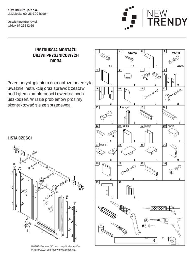 NEW TRENDY Sp. z o.o. ul. Kielecka 90 26-600 Radom [email protected] tel/fax 67 262 12 66 INSTRUKCJA MONTAŻU DRZWI PRYSZNICOWYCH DIORA Przed przystąpieniem do montażu przeczytaj uważnie instrukcję oraz sprawdź zestaw pod kątem kompletności i ewentualnych uszkodzeń. W razie problemów prosimy skontaktować się ze sprzedawcą. LISTA CZĘŚCI UWAGA: Element 30 oraz zespół elementów 14,18,19,20,21 są stosowane zamiennie. Prosimy o czyszczenie aluminiowych powierzchni kabiny oraz szyb miękką szmatka używając łagodnych środków czyszczących. W celu zapewnienia prawidłowego działania rolek należy je raz w miesiącu zabezpieczyć wazeliną sanitarną. Stosowanie środków nie zalecanych przez producenta i niewłaściwa konserwacja rolek może narazić Państwa na utratę gwarancji. ŻYCZYMY PRZYJEMNEGO UŻYTKOWANIA NASZEGO PRODUKTU.