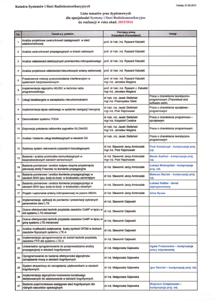 Temat Temat w języku angielskim Opiekun pracy Konsultant pracy Cel pracy Zadania Literatura Temat Temat w języku angielskim Opiekun pracy Konsultant pracy Cel pracy Zadania Literatura Analiza projektowa uwarunkowań zasięgowych w sieci wielokomórkowej Designing Analysis of Range Conditions in Multicells Network prof. dr hab. inż. Ryszard Katulski Zbadanie wpływu wybranych czynników na zasięg działania stacji bazowej i odległość koordynacyjną w sieci wielokomórkowej. 1. Opracowanie sposobu wyznaczania zasięgu i odległości koordynacyjnej w sieci wielokomórkowej z użyciem metody przemnażania prawdopodobieństw.; 2. Opracowanie algorytmu obliczeń do badań symulacyjnych: 3. Implementacja warstwy algorytmicznej w symulatorze obliczeniowym; 4. Wykonanie przedmiotowych badań symulacyjnych i opracowanie wynikających z tego wniosków. 1. Przegląd Telekomunikacyjny: Projektowanie stacji radiokomunikacyjnej, 10/2002. 2. Przegląd Telekomunikacyjny: Komputerowy system ekspertowy do projektowania stacji radiokomunikacyjnej, 11-12/2002. 3. Katulski R.J, Propagacja fal radiowych w telekomunikacji bezprzewodowej, WKiŁ – 2009, rozdz. 4. Analiza uwarunkowań propagacyjnych w liniach radiowych Analysis of Radio-Wave Propagation Conditions in Radio Links prof. dr hab. inż. Ryszard Katulski Zbadanie wpływu wybranych czynników na tłumienie propagacyjne w liniach radiowych 1. Opracowanie sposobu analizy przedmiotowych uwarunkowań. 2. Opracowanie algorytmu obliczeń do badań symulacyjnych. 3. Implementacja warstwy algorytmicznej w symulatorze obliczeniowym. 4. Wykonanie badań symulacyjnych i opracowanie wynikających z tego wniosków. 1. ITU-R. P. 341-5. 3. Katulski R.J, Propagacja fal radiowych w telekomunikacji bezprzewodowej, WKiŁ – 2009, rozdz. 8. TRIAL MODE − a valid license will remove this message. See the keywords property of this PDF for more information. Temat Temat w języku angielskim Opiekun pracy Konsultant pracy Cel pracy Zadania Literatura Temat Temat w języku angielskim Opiekun pracy Konsultant pracy Cel pracy Zadania Literatura Analiza właściwości elektrycznych promiennika mikropaskowego Analysis of Electrical Properties of Microstrip Radiating Element prof. dr hab. inż. Ryszard Katulski Zbadanie wpływu wybranych czynników na właściwości kierunkowe oraz impedancyjne promiennika mikropaskowego 1. Opracowanie sposobu analizy charakterystyki promieniowania oraz impedancji wejściowej prostokątnego promiennika mikropaskowego. 2. Opracowanie algorytmu obliczeń do badań symulacyjnych. 3. Implementacja warstwy algorytmicznej w symulatorze obliczeniowym. 4. Wykonanie badań symulacyjnych i opracowanie wynikających z tego wniosków. 1. ITU-R. P. 341-5. 3. Katulski R.J, Analiza i badania anten do satelitarnej telekomunikacji morksiej, WAT – 1998 (nr wewn. 2558/98), rozdz. 5 (dostępna u opiekuna) Analiza projektowa właściwości kierunkowych anteny sektorowej Designing Analysis of Directional Properties of Sectoral Antenna prof. dr hab. inż. Ryszard Katulski Zbadanie wpływu wybranych czynników na właściwości kierunkowe anteny sektorowej w stacji bazowej telefonii komórkowej 1. Opracowanie sposobu przedmiotowej analizy właściwości kierunkowych prostokątnego układu antenowego. 2. Opracowanie algorytmu obliczeń do badań symulacyjnych. 3. Implementacja warstwy algorytmicznej w symulatorze obliczeniowym. 4. Wykonanie badań symulacyjnych i opracowanie wynikających z tego wniosków. 1. D.J. Bem: Anteny i propagacja fal radiowych, WKiŁ – 1973 2. Katulski R.J.: Technika antenowa w systemach telekomunikacji bezprzewodowej, 6/1997 3. Katulski R.J.: Technika antenowa w radiokomunikacji ruchomej, Przegląd Telekomunikacyjny, 5-6/1995 TRIAL MODE − a valid license will remove this message. See the keywords property of this PDF for more information. Temat Temat w języku angielskim Opiekun pracy Konsultant pracy Cel pracy Zadania Literatura Temat Temat w języku angielskim Opiekun pracy Konsultant pracy Cel pracy Zadania Literatura Przestrzenne metody przeciwdziałania interferencjom w systemach bezprzewodowych. Space-Based Interference Mitigation Methods in Wireless Communication Systems. prof. dr hab. inż. Ryszard Katulski mgr inż. Jarosław Magiera Porównanie efektywności metod przeciwdziałania zakłóceniom wąsko- i szerokopasmowym, opartych na przestrzennym przetwarzaniu sygnałów w odbiorniku wieloantenowym. 1. Zapoznanie się z metodami adaptacyjnego kształtowania charakterystyki kierunkowej układu antenowego; 2. Realizacja symulatora układu przestrzennej eliminacji zakłóceń (implementacja co najmniej dwóch metod); 3. Przygotowanie scenariuszy badań symulacyjnych, różniących się m.in. liczbą elementów układu antenowego, liczbą i rozmieszczeniem źródeł zakłóceń, postacią sygnałów zakłócających itp. 4. Przeprowadzenie badań symulacyjnych w wybranych scenariuszach oraz analiza wyników i porównanie efektywności badanych metod. 1. L.C. Godawa, Smart Antennas, CRC Press, 2004 Implementacja algorytmu MUSIC w technice radia programowalnego. Implementation of MUSIC Algorithm in Software Defined Radio prof. dr hab. inż. Ryszard J. Katulski mgr inż. Jarosław Magiera Opracowanie stanowiska w technice SDR, umożliwiającego estymację kierunku nadejścia sygnału w oparciu o algorytm MUSIC. 1. Zapoznanie się z zasadą działania algorytmu MUSIC; 2. Zapoznanie się z obsługą urządzeń USRP firmy National Instruments; 3. Opracowanie koncepcji programowej implementacji algorytmu MUSIC; 4. Realizacja oprogramowania do estymacji kierunku nadejścia sygnału; 5. Przeprowadzenie pomiarów laboratoryjnych z użyciem opracowanego stanowiska 1. Z. Chen et al., Introduction to Direction-of-Arrival Estimation, Artech House, 2010 2. R.O. Schmidt, Multiple Emitter Location and Signal Parameter Estimation, IEEE Transactions on Antennas and Propagation, 3/1986 TRIAL MODE − a valid license will remove this message. See