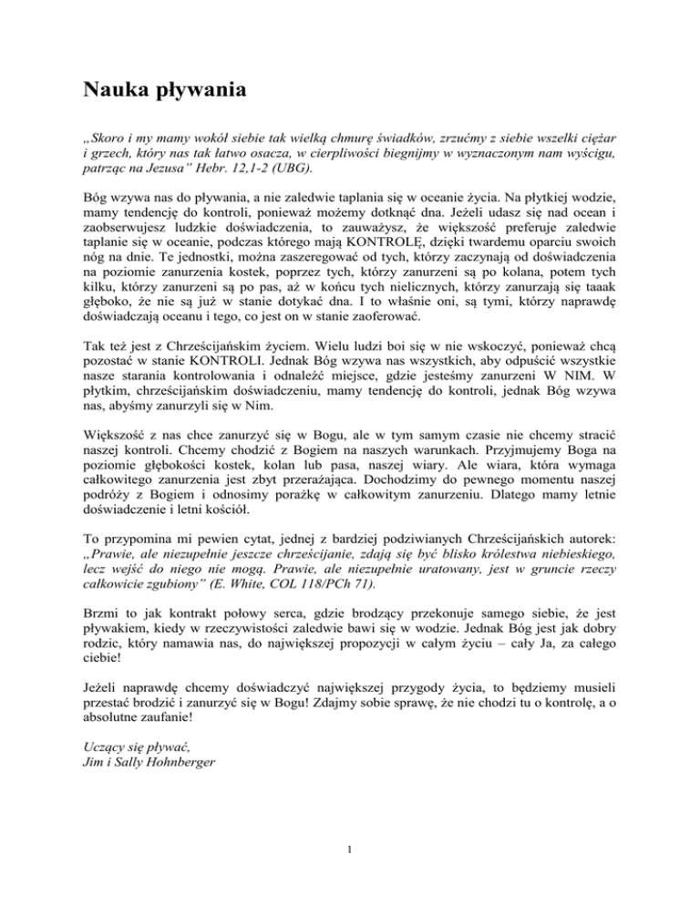 Nauka pływania „Skoro i my mamy wokół siebie tak wielką chmurę świadków, zrzućmy z siebie wszelki ciężar i grzech, który nas tak łatwo osacza, w cierpliwości biegnijmy w wyznaczonym nam wyścigu, patrząc na Jezusa” Hebr. 12,1-2 (UBG). Bóg wzywa nas do pływania, a nie zaledwie taplania się w oceanie życia. Na płytkiej wodzie, mamy tendencję do kontroli, ponieważ możemy dotknąć dna. Jeżeli udasz się nad ocean i zaobserwujesz ludzkie doświadczenia, to zauważysz, że większość preferuje zaledwie taplanie się w oceanie, podczas którego mają KONTROLĘ, dzięki twardemu oparciu swoich nóg na dnie. Te jednostki, można zaszeregować od tych, którzy zaczynają od doświadczenia na poziomie zanurzenia kostek, poprzez tych, którzy zanurzeni są po kolana, potem tych kilku, którzy zanurzeni są po pas, aż w końcu tych nielicznych, którzy zanurzają się taaak głęboko, że nie są już w stanie dotykać dna. I to właśnie oni, są tymi, którzy naprawdę doświadczają oceanu i tego, co jest on w stanie zaoferować. Tak też jest z Chrześcijańskim życiem. Wielu ludzi boi się w nie wskoczyć, ponieważ chcą pozostać w stanie KONTROLI. Jednak Bóg wzywa nas wszystkich, aby odpuścić wszystkie nasze starania kontrolowania i odnaleźć miejsce, gdzie jesteśmy zanurzeni W NIM. W płytkim, chrześcijańskim doświadczeniu, mamy tendencję do kontroli, jednak Bóg wzywa nas, abyśmy zanurzyli się w Nim. Większość z nas chce zanurzyć się w Bogu, ale w tym samym czasie nie chcemy stracić naszej kontroli. Chcemy chodzić z Bogiem na naszych warunkach. Przyjmujemy Boga na poziomie głębokości kostek, kolan lub pasa, naszej wiary. Ale wiara, która wymaga całkowitego zanurzenia jest zbyt przerażająca. Dochodzimy do pewnego momentu naszej podróży z Bogiem i odnosimy porażkę w całkowitym zanurzeniu. Dlatego mamy letnie doświadczenie i letni kościół. To przypomina mi pewien cytat, jednej z bardziej podziwianych Chrześcijańskich autorek: „Prawie, ale niezupełnie jeszcze chrześcijanie, zdają się być blisko królestwa niebieskiego, lecz wejść do niego nie mogą. Prawie, ale niezupełnie uratowany, jest w gruncie rzeczy całkowicie zgubiony” (E. White, COL 118/PCh 71). Brzmi to jak kontrakt połowy serca, gdzie brodzący przekonuje samego siebie, że jest pływakiem, kiedy w rzeczywistości zaledwie bawi się w wodzie. Jednak Bóg jest jak dobry rodzic, który namawia nas, do największej propozycji w całym życiu – cały Ja, za całego ciebie! Jeżeli naprawdę chcemy doświadczyć największej przygody życia, to będziemy musieli przestać brodzić i zanurzyć się w Bogu! Zdajmy sobie sprawę, że nie chodzi tu o kontrolę, a o absolutne zaufanie! Uczący się pływać, Jim i Sally Hohnberger 1