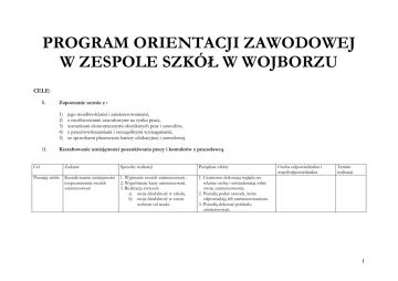 PROGRAM ORIENTACJI ZAWODOWEJ W ZESPOLE SZKÓŁ W WOJBORZU CELE: I. Zapoznanie ucznia z : 1) 2) 3) 4) 5) II. jego możliwościami i zainteresowaniami, z możliwościami zawodowymi na rynku pracy, warunkami ekonomicznymi określonych prac i zawodów, z przeciwwskazaniami i szczególnymi wymaganiami, ze sposobami planowania kariery edukacyjnej i zawodowej. Kształtowanie umiejętności poszukiwania pracy i kontaktów z pracodawcą. Cel Zadanie Sposoby realizacji Pożądane efekty Poznaję siebie Kształtowanie umiejętności rozpoznawania swoich zainteresowań 1. Wypisanie swoich zainteresowań . 2. Wypełnienie karty zainteresowań. 3. Realizacja ćwiczeń: a) moja działalność w szkole, b) moja działalność w czasie wolnym od nauki. 1. Uczniowie dokonują wglądu we własna osobę i uświadamiają sobie swoje zainteresowania. 2. Potrafią podać zawody, które odpowiadają ich zainteresowaniom. 3. Potrafią dokonać podziału zainteresowań. Osoba odpowiedzialna i współodpowiedzialna Termin realizacji 1 Uświadomienie uczniom roli zainteresowań w wyborze zawodu szkoły. 1. Wywiad z rodzicami dotyczący wykształcenia i ich drogi zawodowej. 1. Każdy uczeń ma możliwość podzielenia się uzyskanymi informacjami – wystąpienie publiczne. 2. Uczniowie mają świadomość istnienia związku zainteresowań młodzieńczych z obecna pracą zawodową dorosłych 2. Zabawa „Podróż w dzieciństwo” - konferencja prasowa. 1. Przypominają sobie ulubione zabawy, zainteresowania z dzieciństwa. 3. Dokonanie obserwacji pod katem swoich zainteresowań. 1. Mają świadomość swoich zainteresowań. Kształcenie umiejętności 1. Stworzenie listy uzdolnień, jakie rozpoznawania własnych mogą posiadać ludzie. uzdolnień. Odróżnianie 2. Wypełnienie ankiety uzdolnień cech charakteru i „W czym jestem mistrzem ?” zainteresowań od uzdolnień. 1. Potrafia rozpoznać własne uzdolnienia. 2. Potrafia odróżnić cechy charakteru i zainteresowań od uzdolnień. 3. Znają rodzaje uzdolnień i potrafią przypisać do nich odpowiednie zawody. Kształcenie umiejętności określania swojego temperamentu i jego wpływu na wybory zawodowe. 1. Uczniowie potrafią okreslić swój temperament. 2. Maja swiadomość wpływu temperamentu na wybory zawodowe. 3. Potrafia przypasować zawód swojemu temperamentowi. 1. Rundka niedokończonych zadań. 2. Wypełnienie ankiety „Mój temperament” 2 Poznajemy zawody. 1. Obraz siebie – rola samooceny w trafnym wyborze zawodu. 2. Kształtowanie umiejętności rozpoznania swoich cech osobowości w powiazaniu z wymaganiami poszczególnych zawodów. 1. Zabawa „Jestem niepowtarzalny” 2. Wypełnianie kwestionariusza „Jaki jesteś ?” 3. Pogadanka na temat stanu zdrowia uczniów oraz jego wpływu na wybór zawodu. 1. Uczniowie potrafia dokonać wgladu we własną osobę. 2. Znają swoje mocne i słabe strony. 3. Maja poczucie własnej wartości. 4. Uczniowie mają swiadomość wpływu zdrowia na wybór zawodu. Podsumowanie bloku zajęć „Poznać siebie” 1. Zabawa „Wystawa kwiatów” 2. Wypełnianie kwestionariusza „Ja i mój zawód” 1. Uczniowie znają swoje zainteresowania, uzdolnienia, cechy charakteru i temperamentu, stan zdrowia. 2. Potrafia okreslić szkołę, zawód i przyszłą drogę zawodowa. 1. Wprowadzenie uczniów w podział zawodów ze względu na podstawowe środowisko pracy. 2. Ukazanie związku miedzy predyspozycjami osobowosciowymi, a przyszłym zawodem. 1. Pogadanka na temat podziału zawodu ze względu na środowiska. 2. Wypełnienie ankiety „.Czy lubisz ?” 3. praca w grupie. 1. Uczniowie potrafia dokonać podziału zawodów ze wzgledu na środowisko pracy. 2. Potrafią określić zwiazek miedzy predyspozycjami osobowosciowymi, a przyszłym zawodem. Dostarczenie wiedzy na temat: Co znaczy poznać zawód? Aktywizacja zawodowa młodzieży. 1. Praca w grupach – opracowanie informacji o wybranym zawodzie. Dokumentacja graficzna. Prezentacja wybranego zawodu na forum klasy. 2. Wskazanie źródeł informacji o zawodach. 1. Potrafi dokonać prezentacji wybranego zawodu na forum klasy. 2. Uczeń zna źródła informacji o zawodach. 3. Potrafi okreslić wymagania stawiane osobie pracujacej w danym zawodzie. 3 Ja i mój zawód – możliwosci osobiste a wymagania zawodu. 1. Kształtowanie umiejętnosci analizowania swoich cech osobowosci w aspekcie wyboru zawodu. 1. Wykonanie ćwiczenia – Jestem pracownikiem. 1. Uczniowie maja świadomość, iz w ramach jednego zakładu pracy istnieje wiele stanowisk pracy, na których mogą pracować różni ludzie w zależnosci od ich predyspozycji. Okreslamy drogi prowadzone do zawodu. 1. Zapoznanie uczniów z funkcjonującym w Polsce systemem kształcenia z uwzględnieniem lokalnych sieci szkół. 2. Ukazanie różnorodności ścieżek edukacyjnych czyli dróg prowadzących do zawodu. 1. Praca w grupach – opracowanie przez uczniów dróg prowadzacych do zawodu w oparciu o lokalną sieć szkół. 2. Prezentacja poszczególnych zespołów. 1. Uczniowie wiedzę na temat funkcjonującego w Polsce systemu kształcenia. Określam plan realizacji – zbieram potrzebne informacje, kompletuje dokumenty. 1. Kształtowanie umiejetnosci planowania i realizacji zamierzonych celów. 2. Poznanie zasad przyjeć do szkół ponadpodstawowych. 1. Wypełnianie ankiety „Plan realizacji celu” – prezentacje przez uczniów planów zawodowych. 2. Podsumowanie cyklu zajęć. 3. Wyjazd do szkół ponadpodstawowych. 1. Uczniowie potrafią planować swoje cele i określać sposoby ich realizacji. 2. Znają zasady przyjęć do szkół ponadpodstawowych. 3. Znają adresy, pod którymi można szukać informacji o wolnych miejscach w szkołach ponadpodstawowych. ………………………………………………………………………. Przewodniczący Rady Pedagogicznej 4