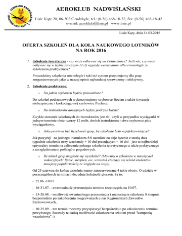 AEROKLUB NADWIŚLAŃSKI aĆ Lisie Kąty 20, 86-302 Grudziądz, tel.: (0-56) 468-18-32, fax: (0-56) 468-18-42 e–mail: [email protected] www.lisie.pl Lisie Kąty, dnia 14.03.2016 OFERTA SZKOLEŃ DLA KOŁA NAUKOWEGO LOTNIKÓW NA ROK 2016 1. Szkolenie teoretyczne - czy może odbywać się na Politechnice? Jeśli nie, czy może odbywać się w trybie zaocznym (2-3) wyjazdy weekendowe albo równolegle ze szkoleniem praktycznym? Prowadzimy szkolenia równoległe i taki też system proponujemy dla grup zorganizowanych jako w naszej opinii najbardziej sprawdzony i efektywny. 2. Szkolenie praktyczne: o Na jakim szybowcu będzie prowadzone? Do szkoleń podstawowych wykorzystujemy szybowce Bocian a także (sytuacje niebezpieczne i korkociągowe) szybowiec Puchacz. o Ilu instruktorów dostępnych będzie podczas kursu? Zwykle stosunek szkolonych do instruktorów jest 6:1 czyli w przypadku wyciągarki w jednym terminie obóz tworzy 12 osób, dwóch instruktorów i dwa szybowce plus wyciągarkowy. o Jaka powinna być liczebność grup, by szkolenie było najefektywniejsze? Jak powyżej - na jednego instruktora 5/6 uczniów co daje łącznie z teorią dwa tygodnie szkolenia (trzy weekendy + 10 dni pracujących = 16 dni - jest to najbardziej optymalny termin na zaliczenie pełnego szkolenia teoretycznego a także praktycznego z uwzględnieniem poślizgów pogodowych. o Ile takich grup mogłoby się wyszkolić? (Mówimy o szkoleniu w miesiącach wakacyjnych: lipiec, sierpień, ew. wrzesień cieszący się wśród studentów mniejszą popularnością ze względu na sesję). Od 25 czerwca do końca września mamy zarezerwowane 4 takie obozy. O udziale w poszczególnych terminach decyduje kolejność głoszeń. Są to: - 25.06.-10.07. - 16-31.07. - ewentualność przesunięcia terminu rozpoczęcia na 10.07. - 13-28.08. - możliwość ewentualnego przesunięcia i rozpoczęcia szkolenia 8 sierpnia bezpośrednio po zakończeniu rozgrywanych u nas Regionalnych Zawodów Szybowcowych, - 10-25.09. - ten termin możemy przyspieszyć bezpośrednio po zakończeniu terminu powyższego. Roszady te dadzą możliwość zakończenia szkoleń przed "kampanią wrześniową" :) 3. Opłaty: o Jaki jest całkowity koszt szkolenia? Całkowity koszt szkolenia teoretycznego (690) i praktycznego (2990) to 3680 PLN. o Czy konieczne jest wnoszenie dodatkowych opłat (np. składka członkowska)? Składka członkowska nie obowiązuje. Wszystkie opłaty zawarte są w cenie szkolenia praktycznego. Wymagamy od uczestników ubezpieczenia od Następstw Nieszczęśliwych Wypadków - we własnym zakresie lub grupowo poprzez nasz ośrodek - cena ok 50 PLN rok. o Czy przewidziane są rabaty w przypadku większej liczby uczestników? Przewidujemy możliwość udzielenia rabatów - szczegóły do ustalenia przy konkretnej ilości chętnych. 4. Zakwaterowanie: o Czy możliwy jest nocleg na lotnisku? Nocleg na lotnisku jest jak najbardziej możliwy. Pokoje dwuosobowe ze wspólnymi łazienkami lub dwuosobowe z łazienką a także pole namiotowe. o Czy jest odpłatny, jakie są koszty? Nocleg jest płatny. Jesteśmy w trakcie generalnych remontów więc na tą chwilę znana jest cena pokoju dwuosobowego bez łazienki - jest to 35 PLN za dobę od osoby. Działa także pole namiotowe w cenie 5 PLN za namiot + 5 PLN za osobę. Dodatkową cenną informacją byłyby ceny dla osób chcących kontynuować szkolenie po uzyskaniu trzeciej klasy w Państwa aeroklubie. W sprawie lotów doskonalących do uzyskania SPL zapraszamy do zapoznania się z oficjalnym cennikiem na sezon 2016 pod adresem http://lisie.pl/oplaty/zwrot-kosztow-za-loty/ Kierownik Szkolenia HT Jakub Jankowiak [email protected] 601-412-664