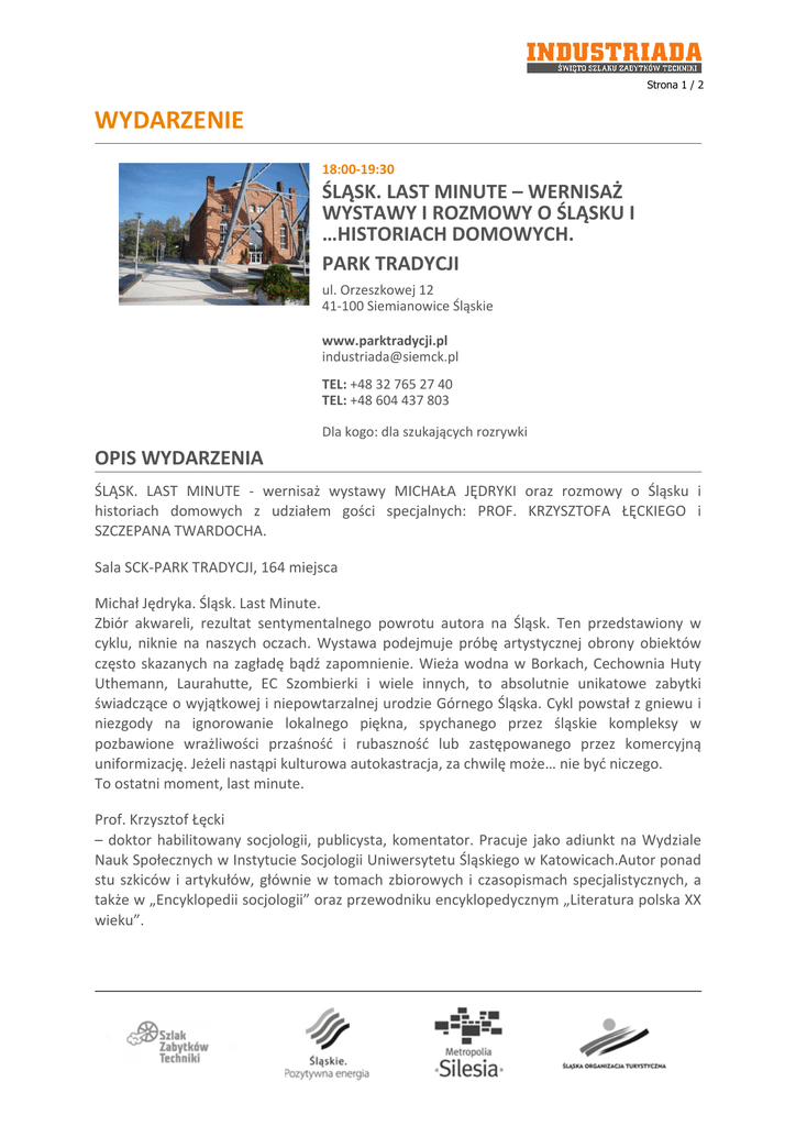 Strona 1 / 2 WYDARZENIE 18:00-19:30 ŚLĄSK. LAST MINUTE – WERNISAŻ WYSTAWY I ROZMOWY O ŚLĄSKU I …HISTORIACH DOMOWYCH. PARK TRADYCJI ul. Orzeszkowej 12 41-100 Siemianowice Śląskie www.parktradycji.pl [email protected] TEL: +48 32 765 27 40 TEL: +48 604 437 803 Dla kogo: dla szukających rozrywki OPIS WYDARZENIA ŚLĄSK. LAST MINUTE - wernisaż wystawy MICHAŁA JĘDRYKI oraz rozmowy o Śląsku i historiach domowych z udziałem gości specjalnych: PROF. KRZYSZTOFA ŁĘCKIEGO i SZCZEPANA TWARDOCHA. Sala SCK-PARK TRADYCJI, 164 miejsca Michał Jędryka. Śląsk. Last Minute. Zbiór akwareli, rezultat sentymentalnego powrotu autora na Śląsk. Ten przedstawiony w cyklu, niknie na naszych oczach. Wystawa podejmuje próbę artystycznej obrony obiektów często skazanych na zagładę bądź zapomnienie. Wieża wodna w Borkach, Cechownia Huty Uthemann, Laurahutte, EC Szombierki i wiele innych, to absolutnie unikatowe zabytki świadczące o wyjątkowej i niepowtarzalnej urodzie Górnego Śląska. Cykl powstał z gniewu i niezgody na ignorowanie lokalnego piękna, spychanego przez śląskie kompleksy w pozbawione wrażliwości przaśność i rubaszność lub zastępowanego przez komercyjną uniformizację. Jeżeli nastąpi kulturowa autokastracja, za chwilę może… nie być niczego. To ostatni moment, last minute. Prof. Krzysztof Łęcki – doktor habilitowany socjologii, publicysta, komentator. Pracuje jako adiunkt na Wydziale Nauk Społecznych w Instytucie Socjologii Uniwersytetu Śląskiego w Katowicach.Autor ponad stu szkiców i artykułów, głównie w tomach zbiorowych i czasopismach specjalistycznych, a także w „Encyklopedii socjologii” oraz przewodniku encyklopedycznym „Literatura polska XX wieku”. Strona 2 / 2 Szczepan Twardoch - polski socjolog, publicysta i pisarz. Ukończył socjologię na Międzywydziałowych Indywidualnych Studiach Humanistycznych na Uniwersytecie Śląskim w Katowicach.Publikował w "Życiu", "Opcjach", "Frondzie", "44/Czterdzieści i Cztery", "Nowej Gazecie Śląskiej", "Arcanach", "Gazecie Wyborczej" i "Rzeczpospolitej" jako niezależny publicysta. Felietonista "Polityki" oraz "Wysokich Obcasów Extra".Jego opowiadanie Obłęd rotmistrza von Egern nominowane było do nagrody Nautilus za rok 2003 i zajęło w głosowaniu 4. miejsce. Opowiadanie pod tytułem Rondo zdobyło Nautilusa za najlepsze opowiadanie roku 2006. Za Epifanię wikarego Trzaski otrzymał zaś Srebrne Wyróżnienie Nagrody Literackiej im. Jerzego Żuławskiego w 2008. W 2010 roku ukazał się francuski przekład jego powieści Przemienienie (Transfiguration). W 2013 roku został laureatem Paszportu Polityki za rok 2012 w kategorii literatura. Nagrodę otrzymał za powieść Morfina PROGRAM 14.06.2014 14:00 - 17:00 14:00 - 19:00 14:00 - 22:00 14:30 - 15:30 17:15 - 18:30 18:00 - 19:30 18:45 - 19:50 19:30 - 21:15 20:00 - 23:00 23:00 - 23:10 23:30 - 00:10 Konkurs gotowania żuru śląskiego – O czym nie chcemy zapomnieć O CZYM NIE CHCEMY ZAPOMNIEĆ – działania i animacje plenerowe Na szlaku przemysłowych historii – interaktywne zwiedzanie Pokaz kulinarny Remigiusza Rączki CARRANTUOHILL– koncert ŚLĄSK. LAST MINUTE – wernisaż wystawy i rozmowy o Śląsku i …historiach domowych. Śląska Grupa Bluesowa – koncert Śląsk w kadrze – projekcja filmu pt. Angelus Richard Durand – Muzyka Klubowa: koncert/industrialna dyskoteka Pokaz pirotechniczny z wieży szybu Krystyn Nocne zwiedzanie Parku Tradycji z duchami i niespodzianką