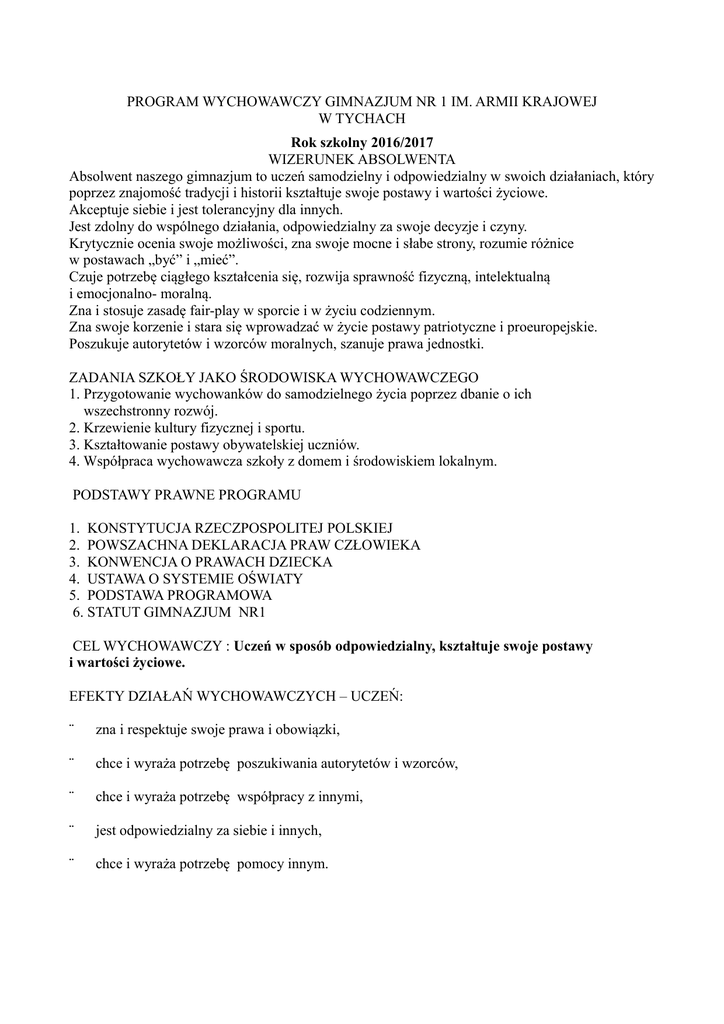 PROGRAM WYCHOWAWCZY GIMNAZJUM NR 1 IM. ARMII KRAJOWEJ W TYCHACH Rok szkolny 2016/2017 WIZERUNEK ABSOLWENTA Absolwent naszego gimnazjum to uczeń samodzielny i odpowiedzialny w swoich działaniach, który poprzez znajomość tradycji i historii kształtuje swoje postawy i wartości życiowe. Akceptuje siebie i jest tolerancyjny dla innych. Jest zdolny do wspólnego działania, odpowiedzialny za swoje decyzje i czyny. Krytycznie ocenia swoje możliwości, zna swoje mocne i słabe strony, rozumie różnice w postawach „być” i „mieć”. Czuje potrzebę ciągłego kształcenia się, rozwija sprawność fizyczną, intelektualną i emocjonalno- moralną. Zna i stosuje zasadę fair-play w sporcie i w życiu codziennym. Zna swoje korzenie i stara się wprowadzać w życie postawy patriotyczne i proeuropejskie. Poszukuje autorytetów i wzorców moralnych, szanuje prawa jednostki. ZADANIA SZKOŁY JAKO ŚRODOWISKA WYCHOWAWCZEGO 1. Przygotowanie wychowanków do samodzielnego życia poprzez dbanie o ich wszechstronny rozwój. 2. Krzewienie kultury fizycznej i sportu. 3. Kształtowanie postawy obywatelskiej uczniów. 4. Współpraca wychowawcza szkoły z domem i środowiskiem lokalnym. PODSTAWY PRAWNE PROGRAMU 1. KONSTYTUCJA RZECZPOSPOLITEJ POLSKIEJ 2. POWSZACHNA DEKLARACJA PRAW CZŁOWIEKA 3. KONWENCJA O PRAWACH DZIECKA 4. USTAWA O SYSTEMIE OŚWIATY 5. PODSTAWA PROGRAMOWA 6. STATUT GIMNAZJUM NR1 CEL WYCHOWAWCZY : Uczeń w sposób odpowiedzialny, kształtuje swoje postawy i wartości życiowe. EFEKTY DZIAŁAŃ WYCHOWAWCZYCH – UCZEŃ: ¨ zna i respektuje swoje prawa i obowiązki, ¨ chce i wyraża potrzebę poszukiwania autorytetów i wzorców, ¨ chce i wyraża potrzebę współpracy z innymi, ¨ jest odpowiedzialny za siebie i innych, ¨ chce i wyraża potrzebę pomocy innym. Cele operacyjne Zadania SZACUNEK DLA PRAW I OBOWIĄZKÓW UMIEJĘTNOŚĆ WSPÓŁRACY Z INNYMI Zapoznanie uczniów ze Statutem Szkoły, WZO, procedurami oraz mobilizowanie do ich przestrzegania. Integracja uczniów w danej klasie i między klasami. Organizowanie zajęć integracyjnych oraz wspólnych wyjazdów. Budowanie więzi między uczniami, nauczycielami i rodzicami poprzez organizowanie imprez okolicznościowych i zapraszanie rodziców min. na spotkania opłatkowego, Święto Edukacji Narodowej, Dzień Śląski. Aktywny udział szkoły w życiu środowiska lokalnego np.: udział w uroczystościach organizowanych przez miasto. ODPOWIEDZIALNOŚĆ Kształtowanie postawy obywatelskiej u uczniów poprzez ich aktywny udział w pracach samorządu klasowego oraz Samorządu Uczniowskiego. Dyskusje, pogadanki problemowe, spotkania z policjantem, psychologiem oraz pielęgniarką szkolną KSZTAŁTOWANIE Pomoc koleżeńska. POSTAWY POMOCY Angażowanie uczniów w akcje charytatywne, POTRZEBUJĄCYM pomoc chorym i niepełnosprawnym (wolontariat) Kiermasz używanych podręczników Osoby odpowiedzialne Sposób ewaluacji wychowawcy, nauczyciele obserwacja, wpisy w dziennikach wychowawcy, nauczyciele, pedagog szkolny obserwacja, wpisy w dziennikach, analiza podejmowanych decyzji i poszukiwanie lepszych rozwiązań wychowawcy, nauczyciele, pedagog szkolny, opiekunowie SU obserwacja wychowawcy, nauczyciele, pedagog szkolny, rodzice, n-l biblioteki obserwacja Uwagi CEL WYCHOWAWCZY : Uczeń jest otwarty na ludzi i świat, zna swoje korzenie, znaczenie tradycji rodzinnych, religijnych, regionalnych, narodowych i europejskich. EFEKTY DZIAŁAŃ WYCHOWAWCZYCH - UCZEŃ: - jest tolerancyjny, -odnosi się z szacunkiem do starszych i niepełnosprawnych, -zna sylwetki wybitnych Polaków, -rozwija swoje zainteresowania i doskonali umiejętności, -potrafi określić swoje mocne i słabe strony. Cele operacyjne Zadania Osoby odpowiedzialne Sposób ewaluacji OTWARTOŚĆ NA ŚWIAT I LUDZI, POSZUKIWANIE AUTERYTETÓW I WZORÓW MORANYCH Organizowanie uroczystości z okazji świąt państwowych oraz ważnych dla kraju rocznic Kształtowanie postawy tolerancji i akceptacji odmienności innych osób, szacunek dla starszych i niepełnosprawnych. Promowanie wartości którymi można i należy kierować się w życiu: Odpowiedzialne wykonywanie obowiązków i powierzonych zadań Obrona własnych i słusznych praw Rozumienie różnicy między postawą „być” a „mieć” Rozpoznawanie własnych emocji i rozumienie uczuć innych ludzi. Zaznajamianie uczniów z sylwetkami wielkich Polaków wychowawcy, nauczyciele języka polskiego, historii, opiekunowie samorządu, pedagog szkolny rozmowy z uczniami, konkursy, zapisy w dziennikach OTWARTOŚĆ NA CIĄGŁE KSZTAŁCENIE SIĘ Rozwijanie indywidualnych zainteresowań uczniów. Kształtowanie umiejętności wyszukiwania i korzystania z informacji oraz wykorzystania ich w praktyce. opiekunowie kół zainteresowań, wychowawcy, nauczyciele, rodzice obserwacja dokonań Uwagi POZNAWANIE SZEROKO POJĘTYCH DÓBR KULTURY NARODOWEJ, EUROPEJSKIEJ I ŚWIATOWEJ Rozwijanie zainteresowań i nawyków czytelniczych. Kształtowanie umiejętności określania swoich mocnych i słabych stron. Organizowanie wycieczek do muzeum, kina i teatru, na lekcje muzealne, wystawy itp. wychowawcy, nauczyciele obserwacja CEL WYCHOWAWCZY : Uczeń przestrzega zasad kultury osobistej. EFEKTY DZIAŁAŃ WYCHOWAWCZYCH – UCZEŃ: ¨ zna zasady savoir-vivre i stosuje je w życiu, ¨ posługuje się poprawną polszczyzną, unika wulgaryzmów, ¨ szanuje siebie i innych. Cele operacyjne KSZTAŁTOWANIE SZACUNKU DLA DOROSŁYCH, MŁODSZYCH I RÓWIEŚNIKÓW PROMOWANIE ZASAD KULTURY ŻYCIA CODZIENNEGO, UTRWALANIE ZWROTÓW GRZECZNOŚCIOWYCH ORGANIZOWANIE SYTUACJI WYCHOWAWCZYCH STWARZAJĄCYCH MOŻLIWOŚĆ KSZTAŁTOWANIA KULTURY OSOBISTEJ Zadania Osoby odpowiedzialne Sposób ewaluacji Pogadanki, rozmowy z uczniami, odwoływanie się do literatury, filmu sytuacji z życia codziennego wychowawcy, nauczyciele obserwacja, analiza zapisy w dziennikach Pogadanki, rozmowy, imprezy okolicznościowe, codzienne życie szkolne. Zwracanie szczególnej uwagi na poprawność j