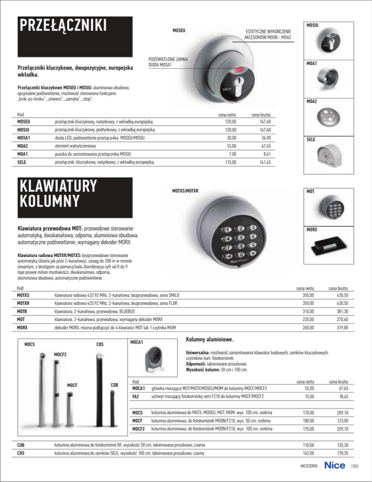 PRZE£¥CZNIKI MOSIU MOSEU Prze³¹czniki kluczykowe, dwupozycyjne, europejska wk³adka. ESTETYCZNE WYKOÑCZENIE AKCESORIÓW MOON - MOA2 PODŒWIETLENIE ZAMKA DIODA MOSA1 MOA1 Prze³¹czniki kluczykowe MOSEU i MOSIU: aluminiowa obudowa, opcjonalne podœwietlenie, mo¿liwoœæ sterowania funkcjami: „krok-po-kroku”, „otwiera”, „zamyka”, „stop”. MOA2 Kod MOSEU prze³¹cznik kluczykowy, natynkowy, z wk³adk¹ europejsk¹ MOSIU prze³¹cznik kluczykowy, podtynkowy, z wk³adk¹ europejsk¹ MOSA1 MOA2 MOA1 puszka do zamontowania prze³¹cznika MOSIU SELE prze³¹cznik kluczykowy, natynkowy, z wk³adk¹ europejsk¹ cena netto 120,00 cena brutto 147,60 120,00 147,60 dioda LED, podœwietlenie prze³¹cznika MOSEU/MOSIU 30,00 36,90 element wykoñczeniowy 55,00 67,65 KLAWIATURY KOLUMNY 7,00 8,61 115,00 141,45 MOTXS/MOTXR Klawiatura przewodowa MOT: przewodowe sterowanie automatyk¹, dwukana³owa, odporna, aluminiowa obudowa, automatyczne podœwietlenie, wymagany dekoder MORX. SELE MOT MORX Klawiatura radiowa MOTXR/MOTXS: bezprzewodowe sterowanie automatyk¹ (dzia³a jak pilot 2-kana³owy), zasiêg do 200 m w terenie otwartym, z dostêpem za pomoc¹ kodu (kombinacja cyfr od 0 do 9 daje prawie milion mo¿liwoœci), dwukana³owa, odporna, aluminiowa obudowa, automatyczne podœwietlenie. Kod MOTXS klawiatura radiowa 433.92 MHz, 2-kana³owa, bezprzewodowa, seria SMILO MOTXR MOTB cena netto 350,00 cena brutto 430,50 klawiatura radiowa 433.92 MHz, 2-kana³owa, bezprzewodowa, seria FLOR 350,00 430,50 klawiatura, 2-kana³owa, przewodowa, BLUEBUS 310,00 381,30 MOT klawiatura, 2-kana³owa, przewodowa, wymagany dekoder MORX 220,00 270,60 MORX dekoder MORX, mo¿na pod³¹czyæ do 4 klawiatur MOT lub 1 czytnika MOM 260,00 319,80 MOCS MOCA1 COS Kolumny aluminiowe. Uniwersalna: mo¿liwoœæ zamontowania klawiatur kodowych, zamków kluczykowych, czytników kart, fotokomórek. Odpornoœæ: lakierowane proszkowo. Wysokoœæ kolumn: 50 cm i 100 cm. MOCF2 MOCF COB Kod MOCA1 g³ówka mocuj¹ca MOT/MOTX/MOSEU/MOM do kolumny MOCF/MOCF2 FA2 uchwyt mocuj¹cy fotokomórkê serii F210 do kolumny MOCF/MOCF2 MOCS MOCF MOCF2 cena netto 55,00 cena brutto 67,65 15,00 18,45 kolumna aluminiowa do MOTX, MOSEU, MOT, MOM, wys. 100 cm, srebrna 170,00 209,10 kolumna aluminiowa, do fotokomórek MOON/F210, wys. 50 cm, srebrna 100,00 123,00 kolumna aluminiowa, do fotokomórek MOON/F210, wys. 100 cm, srebrna 170,00 209,10 COB kolumna aluminiowa do fotokomórek BF, wysokoœæ 50 cm, lakierowana proszkowo, czarna 110,00 135,30 COS kolumna aluminiowa do zamków SELE, wysokoœæ 100 cm, lakierowana proszkowo, czarna 145,00 178,35 AKCESORIA |103 Uniwersalnoœæ czytnika MOM: czytnik pracuje z kartami MOCARD, kartami z kodem zamienialnym MOCARDP i pilotami FLOR-M. Mo¿emy sterowaæ automatyk¹ zarówno kart¹, jak i pilotem. KONTROLA DOSTÊPU Dekoder MORX: mo¿e pracowaæ z 1 czytnikiem kart MOM lub 4 klawiaturami kodowymi MOT. Zasilanie 24V lub 12V, dwa wyjœcia przekaŸnikowe. BLUEBUS System kontroli dostêpu. Sterowanie automatyk¹ za pomoc¹ kart zbli¿eniowych, pilotów z kart¹ zbli¿eniow¹ oraz klawiatur kodowych. System dostêpny tak¿e w technologii BLUEBUS (MOMB/MOTB). Mo¿liwoœæ zastosowania: do dekodera mo¿na wczytaæ 255 kart. Istnieje mo¿liwoœæ rozszerzenia pamiêci do 510 kart stosuj¹c dodatkowy modu³ BM1000 (opcja). BLUEBUS: Nice oferuje now¹, cyfrow¹ klawiaturê MOTB i zbli¿eniowy czytnik kart MOMB - z wewnêtrzn¹ pamiêci¹ BM1000 (255 kart), z mo¿liwoœci¹ programowania poprzez O-Box. Mo¿liwoœæ pod³¹czenia 4 urz¹dzeñ do jednej centrali, z opcj¹ przyporz¹dkowania adresów, jak w fotokomórkach MOFB. Urz¹dzenia BLUEBUS nie wymagaj¹ dekodera MORX. MOT MOMB MOCARD MOU Kod MOCARD karta zbli¿eniowa 1 szt. cena netto 25,00 MOCARDP karta zbli¿eniowa z mo¿liwoœci¹ przypisania kodu 1 szt. 40,00 49,20 FLO2R-M pilot 2-kana³owy, 433.92 MHz, z wbudowan¹ kart¹ zbli¿eniow¹ 130,00 159,90 FLO4R-M pilot 4-kana³owy, 433.92 MHz, z wbudowan¹ kart¹ zbli¿eniow¹ 140,00 172,20 MOMB zbli¿eniowy czytnik kart, BLUEBUS 315,00 387,45 MOTB klawiatura, 2-kana³owa, przewodowa, BLUEBUS 310,00 381,30 MOM zbli¿eniowy czytnik kart, wymagany dekoder MORX 210,00 258,30 MOT klawiatura, 2-kana³owa, przewodowa, wymagany dekoder MORX 220,00 270,60 MORX dekoder MORX, mo¿na pod³¹czyæ do 4 klawiatur MOT lub 1 czytnik MOM, pamiêæ 255 kart 260,00 319,80 BM1000 modu³ pamiêci o pojemnoœci 255 kart/kodów klawiatury 100,00 123,00 POD£¥CZENIE KLAWIATURY KODOWEJ, CZYTNIKA KART, FOTOKOMÓREK W SYSTEMIE BLUEBUS ZA POMOC¥ PRZEWODU 2-¯Y£OWEGO 104| AKCESORIA cena brutto 30,75