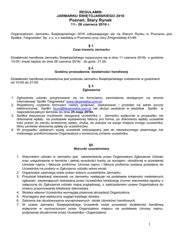 REGULAMIN JARMARKU ŚWIĘTOJAŃSKIEGO 2016 Poznań, Stary Rynek 11– 26 czerwca 2016 r. Organizatorem Jarmarku Świętojańskiego 2016 odbywającego się na Starym Rynku w Poznaniu jest Spółka „Targowiska” Sp. z o. o z siedzibą w Poznaniu przy ulicy Żmigrodzkiej 41/49. § 1. Czas trwania Jarmarku Działalność handlowa Jarmarku Świętojańskiego rozpoczyna się w dniu 11 czerwca 2016r. o godzinie 10:00 i trwać będzie do dnia 26 czerwca 2016r. do godz. 21.00. § 2. Godziny prowadzenia działalności handlowej Działalność handlowa prowadzona jest podczas Jarmarku Świętojańskiego codziennie w godzinach od 10:00 do 21:00. § 3. Zgłoszenia 1. Zgłoszenia udziału przyjmowane są na formularzu zamówienia dostępnym na stronie internetowej Spółki Targowiska” www.targowiska.com.pl 2. Wypełniony czytelnie formularz należy podpisać, zeskanować i przesłać na adres poczty elektronicznej Spółki: [email protected] lub złożyć osobiście w siedzibie Spółki w nieprzekraczalnym terminie do dnia 25 maja 2016r. 3. Spółka dopuszcza możliwość rezygnacji uczestnika z Jarmarku wyłącznie w przypadku nie dokonania wpłaty na podstawie wystawionej faktury pro forma, po dokonaniu wpłaty uczestnik traci prawo do zwrotu wniesionej opłaty, chyba, że wskaże na swoje miejsce innego uczestnika, który poniesie stosowną opłatę za uczestnictwo. 4. W przypadku opisanym wyżej uczestnik zobowiązany jest do niezwłocznego pisemnego lub mailowego poinformowania Organizatora o koniecznej zmianie uczestnika. §4. Warunki uczestnictwa 1. Warunkiem udziału w Jarmarku jest zatwierdzenie przez Organizatora Zgłoszenia Udziału oraz uregulowanie w terminie i pełnej wysokości kwoty za wynajem, określonej w przesłanej Umowie najmu i fakturze proforma. Umowa najmu i faktura proforma zostaną przesłane do Uczestnika na podany w Zgłoszeniu udziału adres email. 2. Organizator zastrzega sobie prawo doboru uczestników Jarmarku. 3. Przydział lokalizacji stanowisk na Jarmarku następuje na podstawie kolejności nadesłanych zgłoszeń, zawierających wskazaną przez Uczestnika lokalizację (numer stanowiska zgodny z załączoną do Zgłoszenia udziału mapą poglądową), z zastrzeżeniem prawa Organizatora do zmiany proponowanej lokalizacji stanowiska. 4. Stoiska własne Uczestnika wymagają pisemnej akceptacji Organizatora. 5. Wymagany jest estetyczny wygląd każdego stoiska. 6. Zabrania się obudowywania wynajmowanych stoisk (domków) handlowych. 7. W czasie Jarmarku Świętojańskiego Uczestnik może prowadzić działalność handlową wyłącznie w wyznaczonym przez Organizatora miejscu na podstawie Umowy najmu, podpisanej obustronnie przez Uczestnika i Organizatora. 1 8. Wynajęte stoisko handlowe (domek) lub powierzchnia pod własne stanowisko handlowe przeznaczone są wyłącznie na potrzeby prowadzenia działalności handlowej przez Uczestnika Jarmarku. 9. Używanie wynajętych stoisk (domków) handlowych lub powierzchni pod własne stanowisko handlowe niezgodnie z Regulaminem oraz poddzierżawianie lub oddanie w bezpłatne korzystanie osobom trzecim skutkuje natychmiastowym rozwiązaniem umowy bez konieczności wyznaczania dodatkowego terminu do usunięcia uchybień. 10. Uczestnicy zobowiązani są do utrzymania czystości i porządku na terenie wynajmowanych stoisk (domków) handlowych, własnych stanowisk, a także na terenie do nich przyległym. W szczególności zobowiązuje się Uczestników do nie wylewania odpadów powstałych w wyniku działalności handlowej do studzienek deszczowych na terenie Jarmarku. 11. Uczestnicy prowadzący gastronomię lub sprzedaż żywności niepakowanej fabrycznie zapewniają na stoisku handlowym na własny koszt urządzenie z ciepłą wodą (mycie rąk). 12. Organizatorowi służy uprawnienie wstępu do obiektu handlowego w obecności Uczestnika w celu oceny przestrzegania wymogów określonych powyżej. 13. Obowiązuje zakaz wystawiania i reklamy towaru poza wyznaczonym miejscem, a także ingerencja w konstrukcję stanowiska a w szczególności: wbijania gwoździ w konstrukcje; wiercenia; zawieszania dodatkowych elementów; ingerencji w instalację elektryczną. 14. Organizator nie wyraża zgody na umieszczanie reklam na zewnętrznych częściach wynajętego czy też własnego stanowiska handlowego. 15. Organizator zastrzega sobie prawo czasowego wyłączenia z handlu stanowiska Uczestnika w następujących okolicznościach: - W przypadku prowadzenia sprzedaży asortymentu innego niż zadeklarowany w Zgłoszeniu udziału oraz zapisanego w Umowie najmu, - W przypadku używania urządzeń elektrycznych o poborze prądu większym niż zadeklarowany w Zgłoszeniu udziału, - w przypadku zaniechania obowiązku, o którym mowa w §4 ust.11 niniejszego Regulaminu. 16. Prowadzenie działalności gastronomicznej na przystosowanych do tego celu stoiskach może odbywać się tylko przy użyciu urządzeń elektrycznych i gazowych (elektryczne patelnie, gazowe rożna, grille, itp.) w miejscach ściśle wyznaczonych przez Organizatora. 17. Uczestnicy zobowiązani są do przestrzegania obowiązujących przepisów dotyczących oznaczenia stoiska, wprowadzenia do obrotu handlowego towarów odpowiednio oznakowanych, posługiwania się narzędziami pomiarowymi legalizowanymi, przestrzegania terminów przydatności do spożycia i trwałości towarów spożywczych przeznaczonych do sprzedaży. 18. Uczestnicy są zobowiązani do prowadzenia działalności w sposób nie naruszający dobrych obyczajów, godności i uczuć religijnych. 19. Uczestnik zobowiązany jest do przestrzegania przepisów p. poż., sanitarnych, ochrony środowiska i innych. 20. Po zakończeniu Jarmarku Uczestnik zwróci Organizatorowi przedmiot najmu w stanie niepogorszonym poza normalny stopień zużycia, wynikający z prawidłowej eksploatacji, § 5. Handel starociami 1. Handel starociami w ramach Jarmarku Świętojańskiego odbywać się będzie wyłącznie w wyznaczonej przez Org