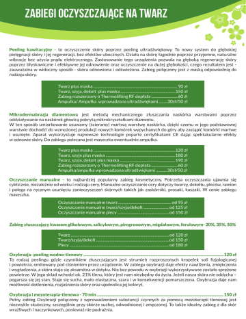Zabiegi oczyszczające na twarz Peeling kawitacyjny - to oczyszczenie skóry poprzez peeling ultradźwiękowy. To nowy system do głębokiej pielęgnacji skóry i jej regeneracji, bez efektów ubocznych. Działa na skórę łagodnie poprzez przyjemne, naturalne wibracje bez użycia prądu elektrycznego. Zastosowanie tego urządzenia pozwala na głęboką regenerację skóry poprzez błyskawiczne i efektywne jej odnowienie oraz oczyszczenie na dużej głębokości, czego rezultatem jest zauważalna w widoczny sposób - skóra odnowiona i odświeżona. Zabieg połączony jest z maską odpowiednią do rodzaju skóry. Twarz plus maska ....................................................................................... 90 zł Twarz, szyja, dekolt plus maska .........................................................150 zł Zabieg rozszerzony o Thermolifting RF dopłata ........................... 60 zł Ampułka/ Ampułka wprowadzona ultradźwiękami .........30zł/50 zł Mikrodermabrazja diamentowa jest metodą mechanicznego złuszczania naskórka warstwami poprzez oddziaływanie na naskórek głowicą pokrytą mikrokryształkami diamentu. W ten sposób umiarkowanie usuwamy (ścieramy) martwą warstwę naskórka, dzięki czemu w jego podstawowej warstwie dochodzi do wzmożonej produkcji nowych komórek wypychanych do góry aby zastąpić komórki martwe i usunięte. Aparat wykorzystuje najnowsze technologie poparte certyfikatami CE dając spektakularne efekty w odnowie skóry. Do zabiegu polecana jest maseczka ewentualnie ampułka. Twarz plus maska .....................................................................................120 zł Twarz, szyja plus maska ........................................................................180 zł Twarz, szyja, dekolt plus maska ......................................................... 190 zł Zabieg rozszerzony o Thermolifting RF dopłata ........................... 60 zł Ampułka/ampułka wprowadzona ultradźwiękami ........... 30zł/50 zł Oczyszczanie manualne - to najbardziej popularny zabieg kosmetyczny. Potrzeba oczyszczania ujawnia się cyklicznie, niezależnie od wieku i rodzaju cery. Manualne oczyszczanie cery dotyczy twarzy, dekoltu, pleców, ramion i polega na ręcznym usunięciu zanieczyszczeń skórnych takich jak zaskórniki, prosaki, kaszaki. W cenie zabiegu maseczka. Oczyszczanie manualne twarz ....................................................... od 95 zł Oczyszczanie manualne twarz/szyja/dekolt .......................... od 125 zł Oczyszczanie manualne plecy ......................................................od 150 zł Zabieg złuszczający kwasem glikolowym, salicylowym, pirogronowym, migdałowym, ferulowym- 20%, 35%, 50% Twarz ......................................................................................................od 120 zł Twarz/szyja/dekolt ............................................................................od 150 zł Plecy ....................................................................................................... od 180 zł Oxybrazja- peeling wodno-tlenowy ...................................................................................................................................120 zł To rodzaj peelingu gdzie czynnikiem złuszczającym jest strumień rozproszonych kropelek soli fizjologicznej i powietrza, emitowany pod ciśnieniem przez urządzenie. W zabiegu oxybrazji daje efekty nawilżenia, zmiękczenia i wygładzenia, a skóra staje się aksamitna w dotyku. Nie bez powodu w oxybrazji wykorzystywane zostało sprężone powietrze. W jego skład wchodzi ok. 21% tlenu, który jest nam niezbędny do życia. Jeżeli nasza skóra nie oddycha – pogarsza się jej stan. Staje się sucha, mało elastyczna, szara i w konsekwencji pomarszczona. Oxybrazja daje nam możliwość dotlenienia, rozjaśnienia skóry oraz ujednolica jej koloryt. Oxybrazja i mezoterapia-tlenowa - 70 min ......................................................................................................................150 zł Pełny zabieg Oxybrazji połączony z wprowadzeniem substancji czynnych za pomocą mezoterapii tlenowej jest niezwykle skuteczny, szczególnie przy skórze suchej, odwodnionej i zmęczonej. To także idealny zabieg z dla skór wrażliwych i naczynkowych, ponieważ nie podrażnia.