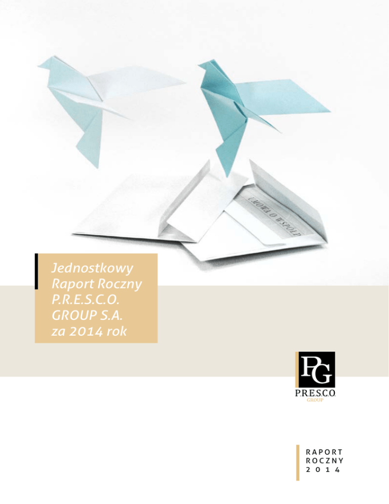 Jednostkowy Raport Roczny P.R.E.S.C.O. GROUP S.A. za 2014 rok RAPORT ROCZNY 2 0 1 4 RAPORT ROCZNY 2014 Spis treści List do Akcjonariuszy /3 Opinia i raport Biegłego Rewidenta /7 Sprawozdanie finansowe P.R.E.S.C.O. GROUP S.A. na 31.12.2014 oraz za rok zakończony 31.12.2014 r. /23 Sprawozdanie z działalności Zarządu P.R.E.S.C.O. GROUP S.A. w roku 2014 /84 LIST DO AKCJONARIUSZY Raport Roczny 2014 3 Krzysztof Piwoński Prezes Zarządu Warszawa, 19 marca 2015 roku DO AKCJONARIUSZY P.R.E.S.C.O. GROUP S.A. Szanowni Państwo, Rok 2014 był dla Grupy Kapitałowej P.R.E.S.C.O. okresem kluczowych zmian, w którym wdrożylismy procesy otwierające wysoką efektywność naszego modelu operacyjnego, a w konsekwencji maksymalizację rentowności inwestycji. Równie istotnym jak zmiany operacyjne celem zrealizowanym 2014 r. było uruchomienie dodatkowych projektów biznesowych. Rynek obrotu wierzytelnościami w Polsce jest nadal atrakcyjny i charakteryzuje się dużym potencjałem wzrostu. Jednocześnie jest też rynkiem dojrzałym i wysoce konkurencyjnym. Aby móc skutecznie na nim konkurować w kolejnych latach, w roku 2014 przeprowadziliśmy szereg istotnych modyfikacji w modelu windykacji. Chciałbym poświęcić kilka słów ich omówieniu, aby pozwolić Państwu zrozumieć dlaczego – pomimo przejściowych wyników finansowych odnotowanych przez Grupę – oceniam jej sytuację optymistycznie. Nie tylko jako prezes zarządu, ale i akcjonariusz P.R.E.S.C.O. GROUP S.A. Raport Roczny 2014 4 W wyniku wprowadzonych w 2014 r. optymalizacji modelu operacyjnego, działania windykacyjne prowadzone dziś przez Grupę obejmują przede wszystkim procesy polubowne, zaś egzekucja komornicza stanowi uzupełnienie windykacji w przypadkach, gdzie procedury ugodowe są bezskuteczne. W następstwie tych zmian w sposób znaczący zwiększyliśmy częstotliwość bezpośrednich kontaktów z osobami zadłużonymi i wdrożyliśmy efektywne narzędzia restrukturyzacji długu. Kiedy kieruję do Państwa te słowa, w ofercie P.R.E.S.C.O. GROUP S.A. funkcjonują rozwiązania wprowadzające dopasowane, indywidualne plany spłat zadłużenia. Dodatkowo, ze względu na to, iż jednym z największych wyzwań dla branży windykacyjnej w Polsce pozostaje brak lub utrudniony kontakt z osobami zadłużonymi, pod koniec 2014 r. rozpoczął działalność zespół doradców terenowych P.R.E.S.C.O. Jego zadaniem jest dotarcie do osób, z którymi dotychczas nie było możliwe nawiązanie kontaktu, a następnie realizacja polubownych działań windykacyjnych – głównie poprzez oferowanie produktów ugodowych. Pierwsze efekty prac zespołu napawają optymizmem, tym bardziej, że skumulowana wartość spraw, w przypadku których Grupa nie miała dotąd kontaktu z osobami zadłużonymi, wynosi ponad 1,5 mld zł. Odzew na zaproponowane rozwiązania polubowne jest znaczący. Widzimy wysoką skuteczność modelu i obserwujemy regularność wpływów gotówkowych w wyniku zawieranych ugód. Jest to szczególnie istotne w przypadku wierzytelności nabywanych przez Grupę w ostatnich latach, w tym spraw o wyższych wartościach sald, np. bankowych. Polubowna windykacja pozwala nam sięgnąć także ponownie do bazy starszych wierzytelności, których nie udało nam się wcześniej wyegzekwować w modelu nastawionym na proces sądowy i komorniczy. Spółka posiada solidną bazę przychodową na kolejne lata. Według danych na koniec roku 2014 znajduje się w niej 2,0 mln spraw. Ich łączna wartość bieżąca rozumiana jako wartość nominalna nabytych portfeli powiększona o należne odsetki i koszty sądowo-egzekucyjne oraz pomniejszona o wpłaty osób zadłużonych wynosiła na 31 grudnia ub. r. aż 2,6 mld zł. Nowa metodologia i narzędzia współpracy wspierające ściągalność zaległych zobowiązań powodują jednak istotną zmianę w trybie odzyskiwania spłat od osób zadłużonych. Z jednej strony, dają nam one komfort zabezpieczenia całości należności w chwili podpisania ugody w sprawie spłaty zadłużenia. Pozwalają także na oszczędności kosztów związane z brakiem konieczności skierowania spraw na drogę postępowania sądowego i egzekucyjnego. Z drugiej strony nowe rozwiązania sprawiają, że spłaty z windykacji rozłożone na szereg rat, realizowane są przez Grupę w dłuższym niż w latach wcześniejszych horyzoncie czasowym. Przychody P.R.E.S.C.O. GROUP S.A. za rok 2014 r. wyniosły 19,4 mln zł. W tym samym okresie Spółka odnotowała koszt własny sprzedaży na poziomie 16,4 mln zł. Przy nieznacznie wyższym niż w roku 2013 poziomie wyniku brutto na sprzedaży, który wyniósł w 2014 r. 3,0 mln zł, na ujemną dynamikę zysku netto Spółki w porównaniu z rokiem 2013 wpłynął niższy niż w roku 2013 o 9,5 mln zł wzrost wartości udziałów posiadanych przez P.R.E.S.C.O. GROUP S.A. w podmiotach zależnych. Ostatecznie, Spółka zamknęła rok 2014 zyskiem netto w wysokości 1,9 mln zł. Choć w roku 2014 dało się zauważyć obniżenie wskaźników rentowności Spółki wobec danych za rok 2013, trend spadkowy ma charakter tymczasowy. Postrzegamy go jako naturalną konsekwencję optymalizacji modelu biznesowego. Zmiany operacyjne wprowadzane są zgodnie z założeniami strategii rozwoju na lata 2013–2016 i mają na celu zapewnienie stabilnego, długoterminowego rozwoju, poprawę wyników i umocnienie pozycji rynkowej P.R.E.S.C.O. GROUP S.A. i jej grupy kapiRaport Roczny 2014 5 tałowej w kolejnych latach. Efekty tych zmian będą działać w interesie Spółki i jej akcjonariuszy, jednak należy liczyć się z tym, że będą one odroczone w czasie. Rozwojowi P.R.E.S.C.O. GROUP S.A. w kolejnych latach służyć będą także dwa projekty strategiczne, które w roku 2014 stały się w pełni operacyjne, tj. działalność w segmencie usług pożyczkowych oraz za granicą. Celem obu inicjatyw jest zapewnienie nowych źródeł przychodów dla Grupy i Spółki dominującej. Powodzenie proj