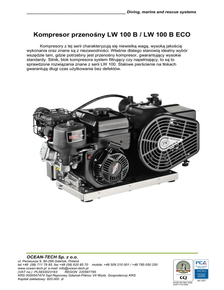 ___________________________________________ Diving, marine and rescue systems Kompresor przenośny LW 100 B / LW 100 B ECO Kompresory z tej serii charakteryzują się niewielką wagą, wysoką jakością wykonania oraz znane są z niezawodności. Właśnie dlatego stanowią idealny wybór wszędzie tam, gdzie potrzebny jest przenośny kompresor, gwarantujący wysokie standardy. Silnik, blok kompresora system filtrujący czy napełniający, to są to sprawdzone rozwiązania znane z serii LW 100. Stalowe pierścienie na tłokach gwarantują długi czas użytkowania bez defektów. OCEAN-TECH Sp. z o.o. ul. Perseusza 9, 80-299 Gdańsk, Poland. tel.+48 (58) 711 76 85, fax +48 (58) 620 85 70 mobile: +48 509 210 001 / +48 785 050 250 www.ocean-tech.pl e-mail: [email protected] (VAT no.) PL5833023163 REGON 220597795 KRS 0000547474 Sąd Rejonowy Gdańsk-Północ VII Wydz. Gospodarczy KRS Kapitał zakładowy: 820.000 zł ___________________________________________ Diving, marine and rescue systems Specyfikacja: - Silnik spalinowy benzynowy - Włącznik start/stop - Rama wykonana z aluminium - Manualny spust kondensatu - Wąż napełniający z zaworem odpowietrzającym i manometrem - chłodzone rury pomiędzy stopniami - Separatory wody i oleju na drugim i trzecim stopniu sprężenia - Zawór bezpieczeństwa na każdym stopniu sprężenia - Wszystkie tłoki posiadają stalowe pierścienie - Możliwość napełniania zbiorników na 200 lub 300 Bar - Oczyszczanie powietrza zgodnie z normą EN 12021 Opcjonalnie: - Uchwyty do noszenia - Uchwyt zaworu napełniającego - Dodatkowy wąż napełniający wraz z zaworem napełniającym - Automatyczny spust kondensatu - Automatyczny stop przy ciśnieniu maksymalnym wraz z licznikiem godzin pracy - Przełącznik pomiędzy ciśnieniem 200 i 300 bar - zestaw do zmiany silnika : elektryczny/spalinowy - Honda Motor (4,1kW) w miejsce Briggs&Stratton Typ: LW 100 B LW 100 B ECO Wydajność [litr/min] / [ m³/h] / Chłodzony powietrzem kompresor tłokowy 100 / 6 / Chłodzony powietrzem kompresor tłokowy 100/6/ 330 2300 3/3 330 2300 3/3 Briggs/Stratton 4-suwowy 4,5 1350 Briggs/Stratton 4-suwowy 4,5 1350 Smarowanie rozbryzgowe 0,5 od +5 do +45 °C 86 (ok. 16h) 67 x 40 x 40 Smarowanie rozbryzgowe 0,5 Od +5 do +45°C 86 (ok. 16h) 67 x 40 x 40 43 96 dB[A] mierzone z odległości 1 m 39 96 dB[A] mierzone z odległości 1 m Maksymalne ciśnienie RPM [1/min]: Liczba cylindrów / liczba stopni Typ głównego silnika: Moc silnika [kW] : Wymagania pow. chłodz. [m³/h]: Rodzaj smarowania: Zbiornik oleju [litry]: Temperatura operacyjna [°C]: Pojemność filtra [m³, +20°C] 1): Wymiary Dł. x Szer. x Wys. [cm]: Waga [kg]: Poziom hałasu [dB]: OCEAN-TECH Sp. z o.o. ul. Perseusza 9, 80-299 Gdańsk, Poland. tel.+48 (58) 711 76 85, fax +48 (58) 620 85 70 mobile: +48 509 210 001 / +48 785 050 250 www.ocean-tech.pl e-mail: [email protected] (VAT no.) PL5833023163 REGON 220597795 KRS 0000547474 Sąd Rejonowy Gdańsk-Północ VII Wydz. Gospodarczy KRS Kapitał zakładowy: 820.000 zł ___________________________________________ Diving, marine and rescue systems OCEAN-TECH Sp. z o.o. ul. Perseusza 9, 80-299 Gdańsk, Poland. tel.+48 (58) 711 76 85, fax +48 (58) 620 85 70 mobile: +48 509 210 001 / +48 785 050 250 www.ocean-tech.pl e-mail: [email protected] (VAT no.) PL5833023163 REGON 220597795 KRS 0000547474 Sąd Rejonowy Gdańsk-Północ VII Wydz. Gospodarczy KRS Kapitał zakładowy: 820.000 zł