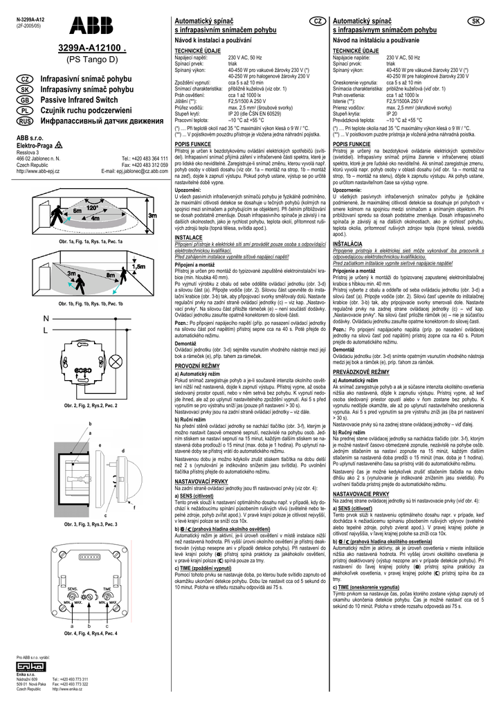 Automatický spínač s infrapasivním snímačem pohybu N-3299A-A12 (2F-2005/05) 3299A-A12100 . (PS Tango D) CZ SK GB PL RUS Infrapasivní snímač pohybu Infrapasívny snímač pohybu Passive Infrared Switch Czujnik ruchu podczerwieni Инфрапассивный датчик движения ABB s.r.o. Elektro-Praga Resslova 3 466 02 Jablonec n. N. Czech Republic http://www.abb-epj.cz Tel.: +420 483 364 111 Fax: +420 483 312 059 E-mail: [email protected] CZ Návod na inštaláciu a používanie TECHNICKÉ ÚDAJE TECHNICKÉ ÚDAJE Napájecí napětí: Spínací prvek: Spínaný výkon: 230 V AC, 50 Hz triak 40-450 W pro vakuové žárovky 230 V (*) 40-250 W pro halogenové žárovky 230 V Zpoždění vypnutí: cca 5 s až 10 min Snímací charakteristika: přibližně kuželová (viz obr. 1) Práh osvětlení: cca 1 až 1000 lx Jištění (**): F2,5/1500 A 250 V Průřez vodičů: max. 2,5 mm2 (šroubové svorky) Stupeň krytí: IP 20 (dle ČSN EN 60529) Pracovní teplota: –10 °C až +55 °C (*) .... Při teplotě okolí nad 35 °C maximální výkon klesá o 9 W / °C. (**) ... V pojistkovém pouzdru přístroje je vložena jedna náhradní pojistka. Napájacie napätie: Spínací prvok: Spínaný výkon: 230 V AC, 50 Hz triak 40-450 W pre vákuové žiarovky 230 V (*) 40-250 W pre halogénové žiarovky 230 V Oneskorenie vypnutia: cca 5 s až 10 min Snímacia charakteristika: približne kužeľová (viď obr. 1) Prah osvetlenia: cca 1 až 1000 lx Istenie (**): F2,5/1500A 250 V Prierez vodičov: max. 2,5 mm2 (skrutkové svorky) Stupeň krytia: IP 20 Prevádzková teplota: –10 °C až +55 °C (*) .... Pri teplote okolia nad 35 °C maximálny výkon klesá o 9 W / °C. (**) ... V poistkovom puzdre prístroja je vložená jedna náhradná poistka. POPIS FUNKCE POPIS FUNKCIE Přístroj je určen k bezdotykovému ovládání elektrických spotřebičů (svítidel). Infrapasivní snímač přijímá záření v infračervené části spektra, které je pro lidské oko neviditelné. Zaregistruje-li snímač změnu, kterou vyvolá např. pohyb osoby v oblasti dosahu (viz obr. 1a – montáž na strop, 1b – montáž na zeď), dojde k zapnutí výstupu. Pokud pohyb ustane, výstup se po určité nastavitelné době vypne. Upozornění: U všech pasivních infračervených snímačů pohybu je fyzikálně podmíněno, že maximální citlivosti detekce se dosahuje u tečných pohybů (kolmých na spojnici mezi snímačem a pohybujícím se objektem). Při čelním přibližování se dosah podstatně zmenšuje. Dosah infrapasivního spínače je závislý i na dalších okolnostech, jako je rychlost pohybu, teplota okolí, přítomnost rušivých zdrojů tepla (topná tělesa, svítidla apod.). Připojení přístroje k elektrické síti smí provádět pouze osoba s odpovídající elektrotechnickou kvalifikací. Před zahájením instalace vypněte síťové napájecí napětí! Připojení a montáž Přístroj je určen pro montáž do typizované zapuštěné elektroinstalační krabice (min. hloubka 40 mm). Po vyjmutí výrobku z obalu od sebe oddělte ovládací jednotku (obr. 3-d) a silovou část (a). Připojte vodiče (obr. 2). Silovou část upevněte do instalační krabice (obr. 3-b) tak, aby připojovací svorky směřovaly dolů. Nastavte regulační prvky na zadní straně ovládací jednotky (c) – viz kap. „Nastavovací prvky“. Na silovou část přiložte rámeček (e) – není součástí dodávky. Ovládací jednotku zasuňte opatrně konektorem do silové části. Pozn.: Po připojení napájecího napětí (příp. po nasazení ovládací jednotky na silovou část pod napětím) přístroj sepne cca na 40 s. Poté přejde do automatického režimu. Demontáž Ovládací jednotku (obr. 3-d) sejměte vsunutím vhodného nástroje mezi její bok a rámeček (e), příp. tahem za rámeček. Obr. 1b, Fig. 1b, Rys. 1b, Рис. 1b PROVOZNÍ REŽIMY a) Automatický režim Pokud snímač zaregistruje pohyb a je-li současně intenzita okolního osvětlení nižší než nastavená, dojde k zapnutí výstupu. Přístroj vypne, až osoba sledovaný prostor opustí, nebo v něm setrvá bez pohybu. K vypnutí nedojde ihned, ale až po uplynutí nastavitelného zpoždění vypnutí. Asi 5 s před vypnutím se pro výstrahu sníží jas (pouze při nastavení > 30 s). Nastavovací prvky jsou na zadní straně ovládací jednotky – viz dále. b) Ruční režim Na přední stěně ovládací jednotky se nachází tlačítko (obr. 3-f), kterým je možno nastavit časově omezené sepnutí, nezávislé na pohybu osob. Jedním stiskem se nastaví sepnutí na 15 minut, každým dalším stiskem se nastavená doba prodlouží o 15 minut (max. doba je 1 hodina). Po uplynutí nastavené doby se přístroj vrátí do automatického režimu. Nastavenou dobu je možno kdykoliv zrušit stiskem tlačítka na dobu delší než 2 s (vynulování je indikováno snížením jasu svítidla). Po uvolnění tlačítka přístroj přejde do automatického režimu. Obr. 2, Fig. 2, Rys.2, Рис. 2 b a e d NASTAVOVACÍ PRVKY f c Obr. 3, Fig. 3, Rys.3, Рис. 3 a b c Obr. 4, Fig. 4, Rys.4, Рис. 4 Pro ABB s.r.o. vyrábí: Enika s.r.o. Nádražní 609 509 01 Nová Paka Czech Republic Tel.: +420 493 773 311 Fax: +420 493 773 322 http://www.enika.cz SK Návod k instalaci a používání INSTALACE Obr. 1a, Fig. 1a, Rys. 1a, Рис. 1a Automatický spínač s infrapasívnym snímačom pohybu Na zadní straně ovládací jednotky jsou tři nastavovací prvky (viz obr. 4): a) SENS (citlivost) Tento prvek slouží k nastavení optimálního dosahu např. v případě, kdy dochází k nežádoucímu spínání působením rušivých vlivů (světelné nebo tepelné zdroje, pohyb zvířat apod.). V pravé krajní poloze je citlivost nejvyšší, v levé krajní poloze se sníží cca 10x. b) / (prahová hladina okolního osvětlení) Automatický režim je aktivní, je-li úroveň osvětlení v místě