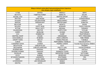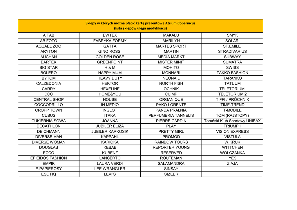Sklepy w których można płacić kartą prezentową Atrium Copernicus (lista sklepów ulega modyfikacji) A TAB AB FOTO AQUAEL ZOO ARYTON AUCHAN BARTEK BIG STAR BOLERO BYTOM CALZEDONIA CARRY CCC CENTRAL SHOP COCCODRILLO CROPP TOWN CUBUS CUKIERNIA SOWA DECATHLON DEICHMANN DIVERSE MAN DIVERSE WOMAN DOUGLAS ECCO EF EIDOS FASHION EMPIK E-PAPIEROSY ESOTIQ EWTEX FABRYKA FORMY GATTA GINO ROSSI GOLDEN ROSE GREENPOINT H&M HAPPY MUM HEAVY DUTY HEKTOR HEXELINE HOME&YOU HOUSE IN MEDIO INGLOT ITAKA JOANNA JUBILER ELIZA JUBILER KARKOSIK KAPPAHL KARIOKA KEBAB KUBENZ LANCERTO LAURA VERDI LEE WRANGLER LEVI’S MAKALU MARILYN MARTES SPORT MARTIN MEDIA MARKT MISTER MINIT MOHITO MONNARI NEONAIL NORTH FISH OCHNIK OLIMP ORGANIQUE PAKO LORENTE PANDA PRALNIA PERFUMERIA TANNELIS PIERRE CARDIN PLAY PRETTY GIRL PROMOD RAINBOW TOURS REPORTER YOUNG RESERVED ROUTEMAN SALAMANDRA SINSAY SIZEER SMYK SOLAR ST.EMILE STRADIVARIUS SUBWAY SUMATRA SWISS TAKKO FASHION TARANKO TATUUM TELETORIUM TELETORIUM 2 TIFFI / PRÓCHNIK TIME-TREND T-MOBILE TOM (RAJSTOPY) Toruński Klub Sportowy UNIBAX TRIUMPH VISION EXPRESS VISTULA W.KRUK WITTCHEN WÓLCZANKA YES ZIAJA