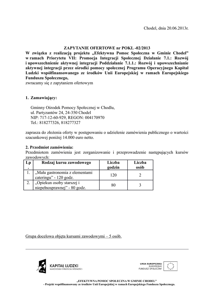 Chodel, dnia 20.06.2013r. ZAPYTANIE OFERTOWE nr POKL -02/2013 W związku z realizacją projektu „Efektywna Pomoc Społeczna w Gminie Chodel” w ramach Priorytetu VII: Promocja Integracji Społecznej Działanie 7.1.: Rozwój i upowszechnienie aktywnej integracji Poddziałanie 7.1.1.: Rozwój i upowszechnianie aktywnej integracji przez ośrodki pomocy społecznej Programu Operacyjnego Kapitał Ludzki współfinansowanego ze środków Unii Europejskiej w ramach Europejskiego Funduszu Społecznego, zwracamy się z zapytaniem ofertowym 1. Zamawiający: Gminny Ośrodek Pomocy Społecznej w Chodlu, ul. Partyzantów 24, 24-350 Chodel NIP: 717-12-60-929, REGON: 004170970 Tel.: 818277326, 818277327 zaprasza do złożenia oferty w postępowaniu o udzielenie zamówienia publicznego o wartości szacunkowej poniżej 14.000 euro netto. 2. Przedmiot zamówienia: Przedmiotem zamówienia jest zorganizowanie i przeprowadzenie następujących kursów zawodowych: Lp Rodzaj kursu zawodowego Liczba Liczba . godzin osób 1. „Mała gastronomia z elementami 120 2 cateringu” - 120 godz. 2. „Opiekun osoby starszej i 80 3 niepełnosprawnej” - 80 godz. Grupa docelowa objęta kursami zawodowymi – 5 osób. „EFEKTYWNA POMOC SPOŁECZNA W GMINIE CHODEL” - Projekt współfinansowany ze środków Unii Europejskiej w ramach Europejskiego Funduszu Społecznego. Jednakże Zamawiający zastrzega sobie prawo do zmniejszenie lub zwiększenia ilości osób na kursy zawodowe, jeżeli wystąpią przyczyny od niego niezależne, nieznane w chwili publikowania zapytania ofertowego. Minimalny zakres tematyczny do pkt 1: - zasady BHP - technologia gastronomiczna z towaroznawstwem – zasady sporządzania dań - obróbka techniczna surowców i półproduktów - planowanie posiłków i układanie prostego menu w małej gastronomii - porcjowanie, dekorowanie i ekspedycja potraw w małej gastronomii - przechowywanie i magazynowanie surowców, półproduktów i wyrobów gotowych w małej gastronomii - ocena jakościowa i ilościowa surowców i wyrobów gotowych w małej gastronomii - catering Minimalny zakres tematyczny do pkt 2; - osoby starsze i niepełnosprawne – problemy pielęgnacyjne - komunikacja z człowiekiem chorym, starszym, niepełnosprawnym - problemy zdrowotne osób starszych i niepełnosprawnych - elementy rehabilitacji - problemy psychospołeczne osób starszych i niepełnosprawnych 3. Istotne warunki zamówienia: - celem kursów jest teoretyczne i praktyczne nabycie umiejętności i/lub uprawnień do wykonywania zawodu, - każdy kurs zawodowy powinien zawierać minimum programowe określone dla każdego typu kursów, - w ramach kursu zawodowego pkt 1, 2 powinny być wykonane badania w sanepidzie dopuszczające do kontaktu z żywnością 3.1 Zamawiający nie dopuszcza możliwości składania ofert częściowych. 3.2 Zamawiający nie dopuszcza możliwości składania ofert wariantowych. 3.3 Zamawiający zastrzega sobie możliwość prowadzenia bieżącego nadzoru nad procesem szkolenia kursantów – na każdym jego etapie. 3.5 Oznaczenie wg Wspólnego Słownika Zamówień (CPV) 80-500000-9 Usługi szkoleniowe „EFEKTYWNA POMOC SPOŁECZNA W GMINIE CHODEL” - Projekt współfinansowany ze środków Unii Europejskiej w ramach Europejskiego Funduszu Społecznego. 4. Informacje dotyczące kursów: - kursy zawodowe powinny zakończyć się wydaniem odpowiedniego dokumentu potwierdzającego ukończenie zajęć w postaci zaświadczenia lub certyfikatu - w czasie zajęć powinna zostać zapewniona usługa cateringowa obejmująca ciepły posiłek dla każdego uczestnika kursu zawodowego oraz serwis kawowy: napój np. kawa, herbata, woda, kruche ciastka itp., - zajęcia powinny odbywać się zgodnie z harmonogramem zajęć opracowanym przez Wykonawcę, - liczba godzin szkoleniowych nie może być mniejsza niż 5 i większa niż 8 godzin dziennie, - przez godzinę szkoleniową rozumie się 45 minut zajęć dydaktycznych (wykłady, zajęcia praktyczne), - metody szkoleniowe: prezentacje, wykłady, zajęcia praktyczne, ćwiczenia. 4.2 Wykonawca odpowiedzialny będzie za: - realizację programu merytorycznego, - prowadzenie dzienników zajęć, list obecności, list potwierdzających odbiór materiałów szkoleniowych, list potwierdzających skorzystanie z usługi cateringowej przez uczestników kursów zawodowych oraz innych dokumentów wg zaleceń Zamawiającego, - zapewnienie materiałów biurowych i dydaktycznych dla każdego uczestnika, - zapewnienie odpowiednich warunków lokalowych- sale szkoleniowe przystosowane pod względem sanitarnym, przeciwpożarowym i BHP, dostosowane do liczby uczestników z odpowiednią liczbą miejsc i krzeseł tj. stolików i krzeseł, z urządzeniami projekcyjnymi typu projektor, ekran projekcyjny lub tablica i interaktywna, flipchart, - zapewnienie w czasie zajęć usługi cateringowej, - oznaczenie materiałów szkoleniowych, dydaktycznych, sal szkoleniowych, zaświadczeń lub certyfikatów zgodnie z wytycznymi dotyczącymi oznaczeń projektów w ramach Programu Operacyjnego Kapitał Ludzki, - przekazanie każdemu uczestnikowi zaświadczeń lub certyfikatów ukończenia kursu zawodowego, - zapewnienie dojazdu każdemu uczestnikowi kursu lub zapewnienie zwrotu kosztów dojazdu na kursy zawodowe, - ubezpieczenia uczestników kursu na czas trwania szkolenia. Wykonawca ponosi pełną odpowiedzialność wobec Zamawiającego za wszelkie szkody powstałe w trakcie realizacji umowy, jak również za roszczenia cywilno-prawne osób trzecich spowodowane działalnością lub brakiem działania Wykonawcy/lub Podwykonawcy przy realizacji przedmiotu umowy 4. Cena jest jedynym kryterium oceny: tak W cenę należy wliczyć wszystkie elementy potrzebne do zorganizowania i przeprowadzenia kursów zawodowych np. koszt materiałów szkoleniowych, materiałów dydaktycznych, (które przechodzą na własność uczestnika) koszt wydanego zaświadczenia/certyfikatu o ukończeniu kursu itp. Kryteria oceny: 