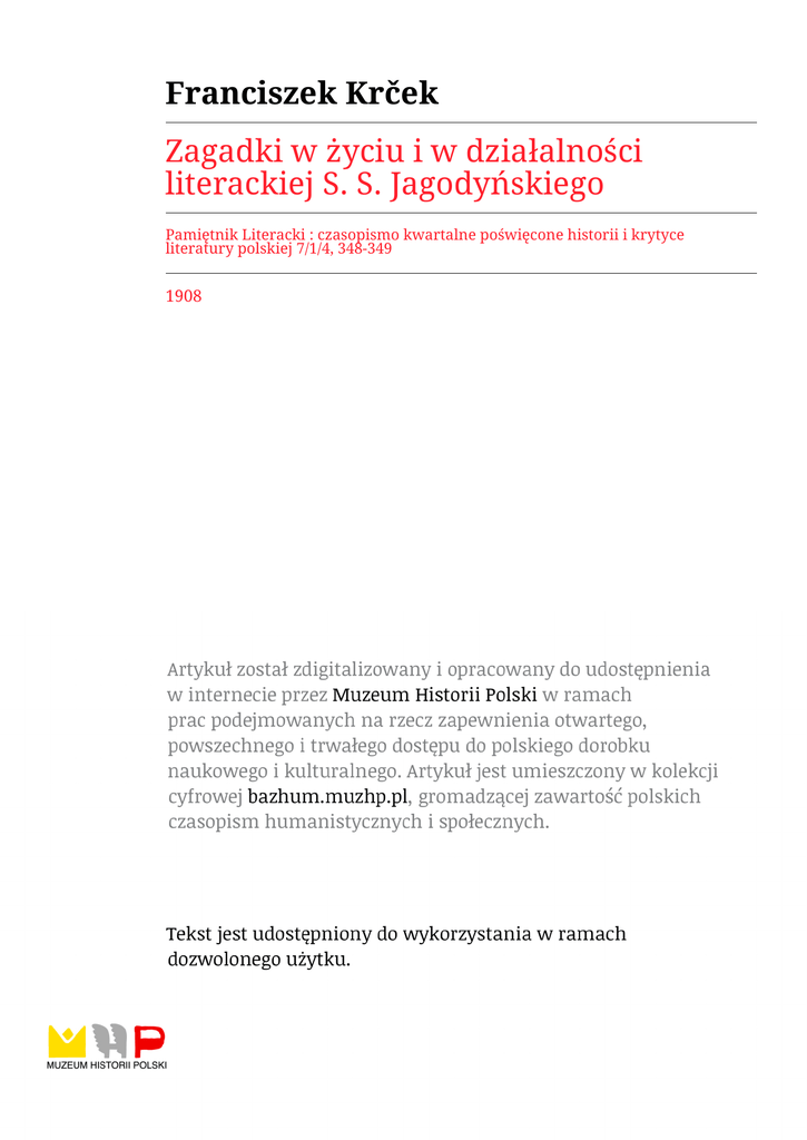 dziejów piśmiennictwa naszego i opracuje życie i pisma poety Jagodyńskiego. Rzecz godna rozprawy doktorskiej.
