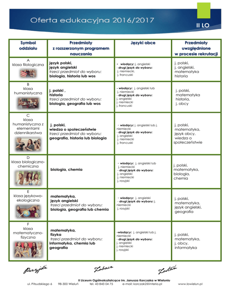 II LO Symbol oddziału A klasa filologiczna B klasa humanistyczna C klasa humanistyczna z elementami dziennikarstwa D klasa biologicznochemiczna E klasa językowoekologiczna F klasa matematycznofizyczna Przedmioty z rozszerzonym programem nauczania język polski, język angielski trzeci przedmiot do wyboru: biologia, historia lub wos j. polski , historia trzeci przedmiot do wyboru: biologia, geografia lub wos j. polski, wiedza o społeczeństwie trzeci przedmiot do wyboru: geografia, historia lub biologia Języki obce - wiodący: j. angielski - drugi język do wyboru: j. niemiecki, j. francuski - wiodący: j. angielski lub j. niemiecki - drugi język do wyboru: j. angielski j. niemiecki j. francuski - wiodący: j. angielski lub j. niemiecki - drugi język do wyboru: j. angielski j. niemiecki j. francuski - wiodący: biologia, chemia matematyka, język angielski trzeci przedmiot do wyboru: biologia, geografia lub chemia matematyka, fizyka trzeci przedmiot do wyboru: informatyka, chemia lub geografia ul. Piłsudskiego 6 j. angielski lub j. niemiecki - drugi język do wyboru: j. angielski j. niemiecki j. rosyjski - wiodący: j. angielski - drugi język do wyboru: j. niemiecki j. rosyjski -wiodący: j. angielski lub j. niemiecki - drugi język do wyboru: j. angielski j. niemiecki j. rosyjski II Liceum Ogólnokształcące im. Janusza Korczaka w Wieluniu 98-300 Wieluń tel. 43 843 04 75 e-mail: [email protected] Przedmioty uwzględnione w procesie rekrutacji j. polski, j. angielski, matematyka historia j. polski, matematyka historia, j. obcy j. polski, matematyka, język obcy, wiedza o społeczeństwie j. polski, matematyka, biologia, chemia j. polski, matematyka, język angielski, geografia j. polski, matematyka, j. obcy, informatyka www.lowielun.pl